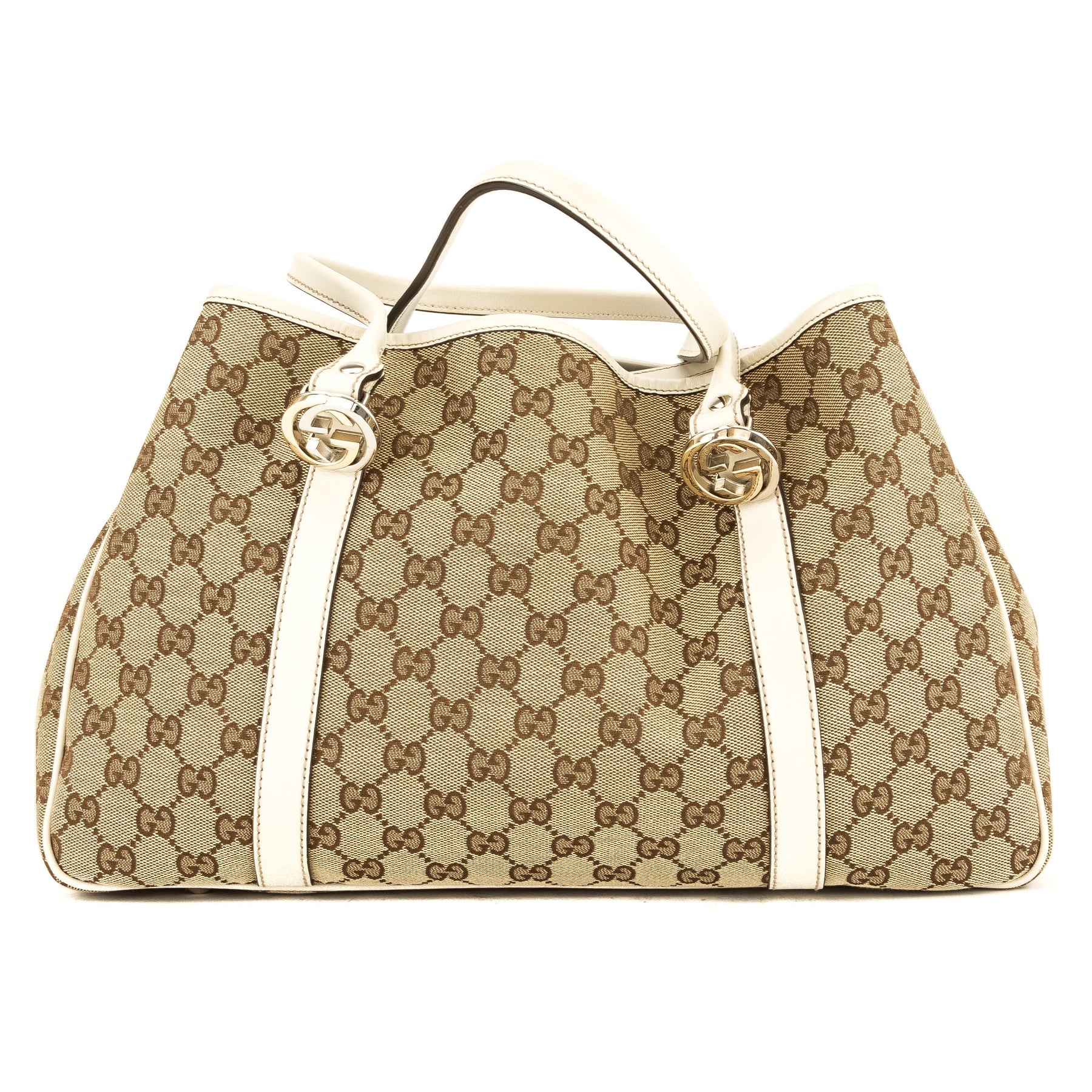 This is an authentic, pre-owned GUCCI Medium Twins Tote Bag. It features the GG Monogram canvas with a creme leather trim, slim rolled handles, gold and silver-tone hardware with GG emblems, and protective feet on the base. The interior has a Gucci fabric lining with a zip pocket, two cellphone pockets, and cinch straps. It's medium-sized and spacious enough for your daily essentials.