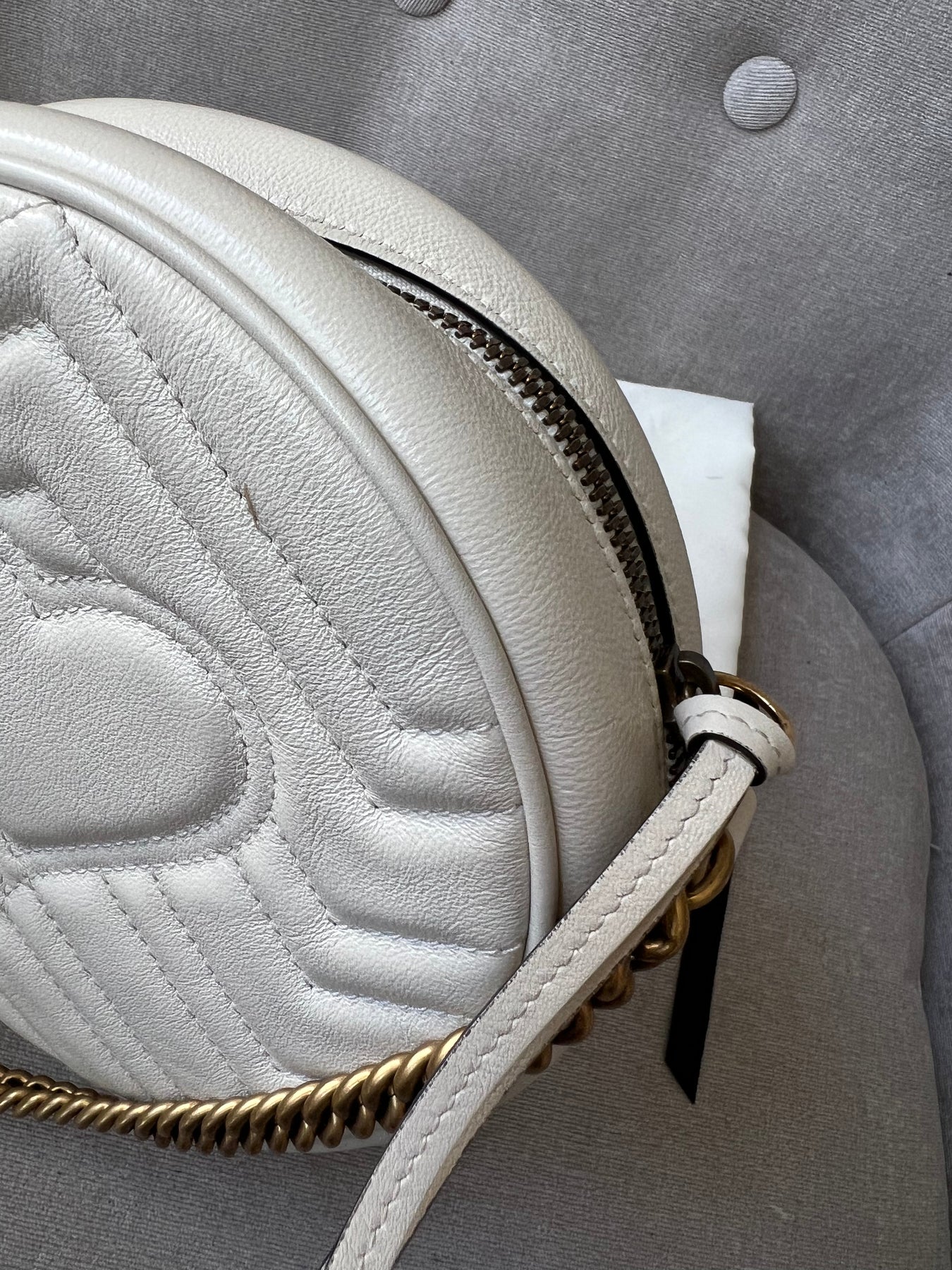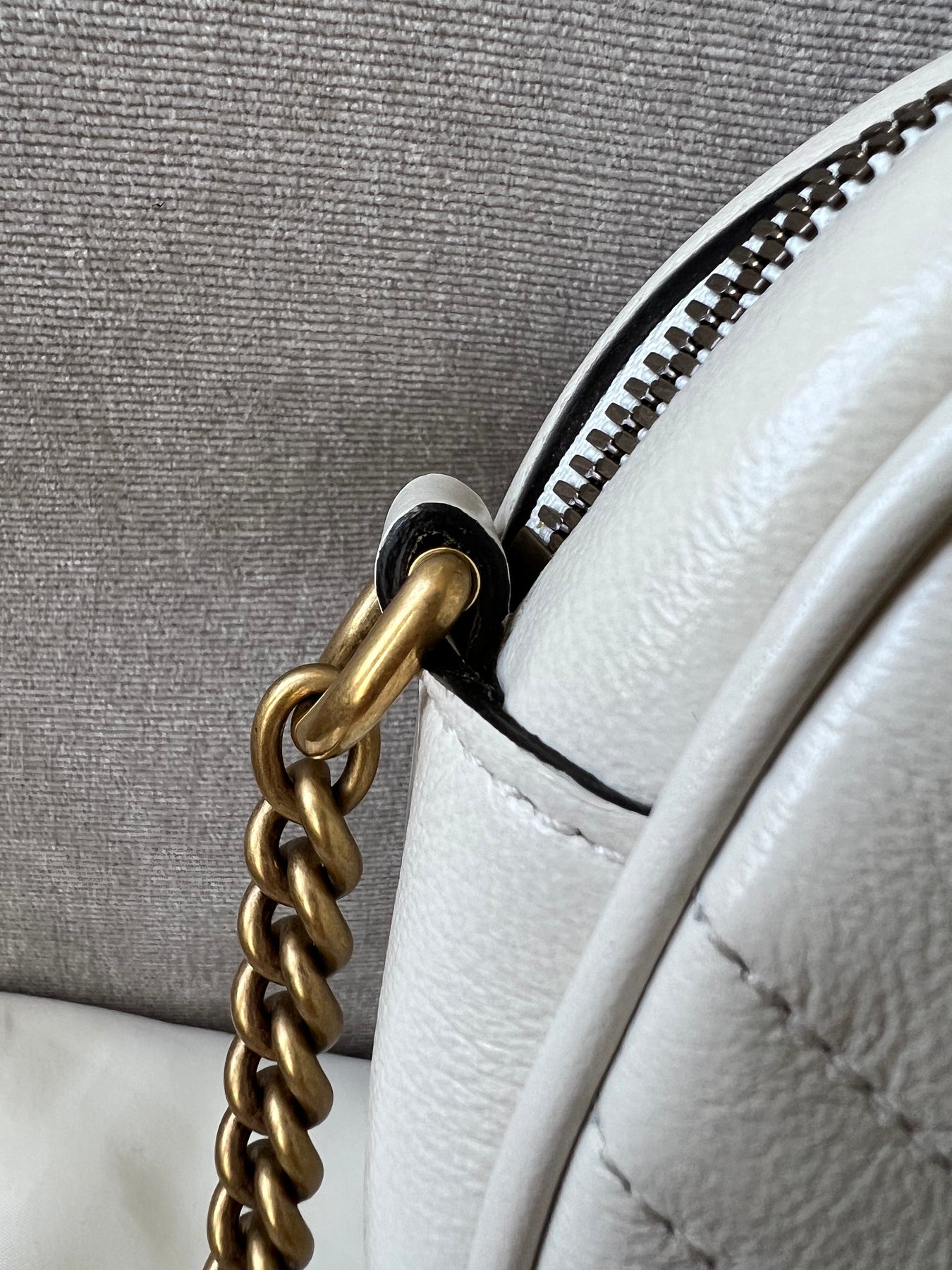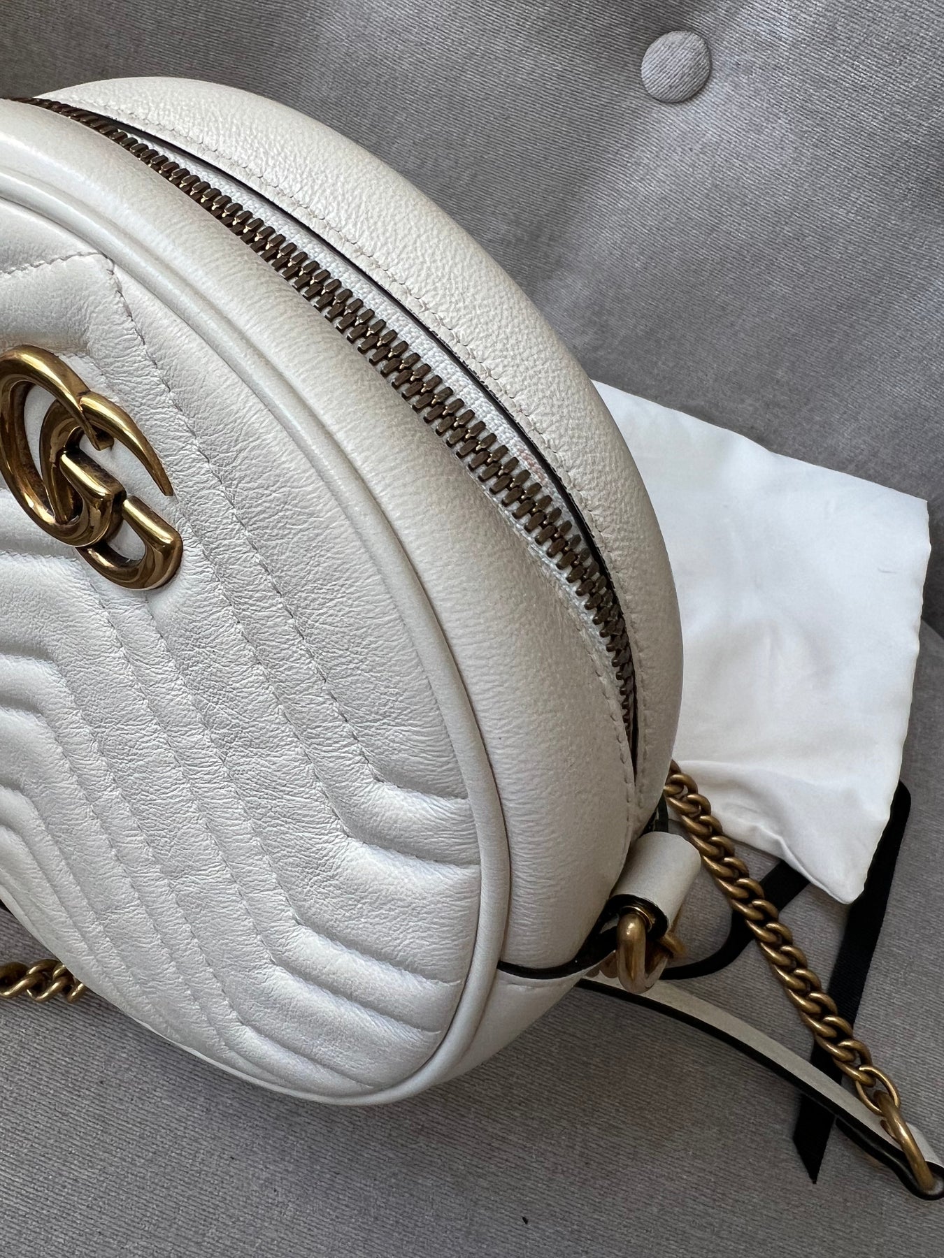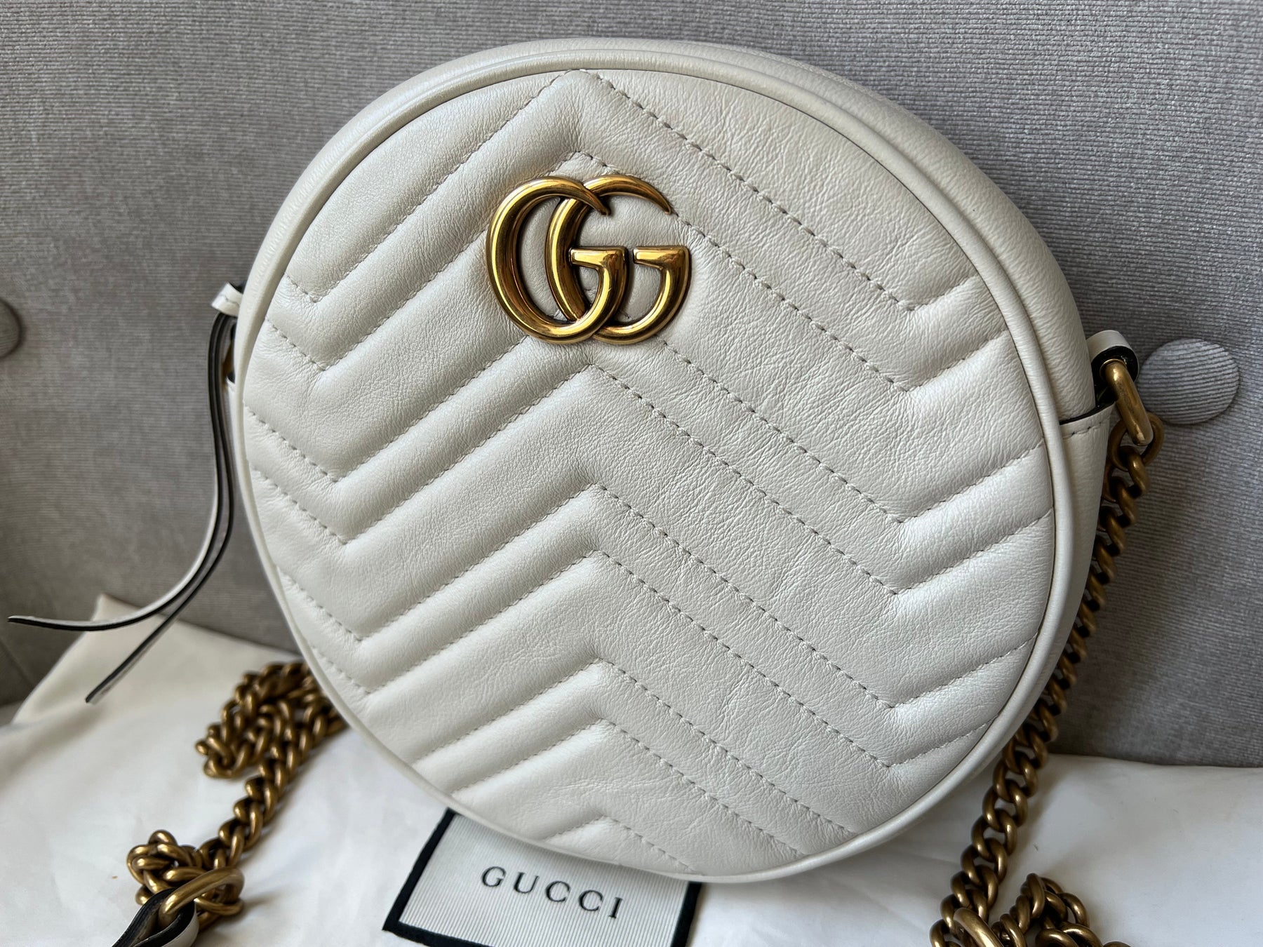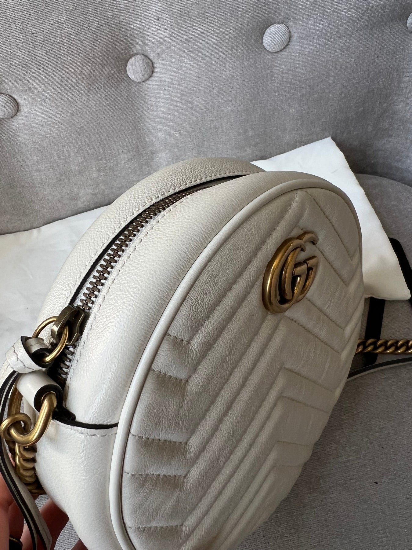 Gucci GG Marmont Mini round shoulder bag in white chevron quilted leather with gold hardware. Note this is more of a light cream shade rather than pure white; This small Marmont chain style bag has a softly structured shape and zip top closure. Effortlessly chic and sophisticated, this style can be worn both with a casual outfit or for evening wear. Suitable for both day to day or occasion wear and ideal for those who prefer a cross body option.