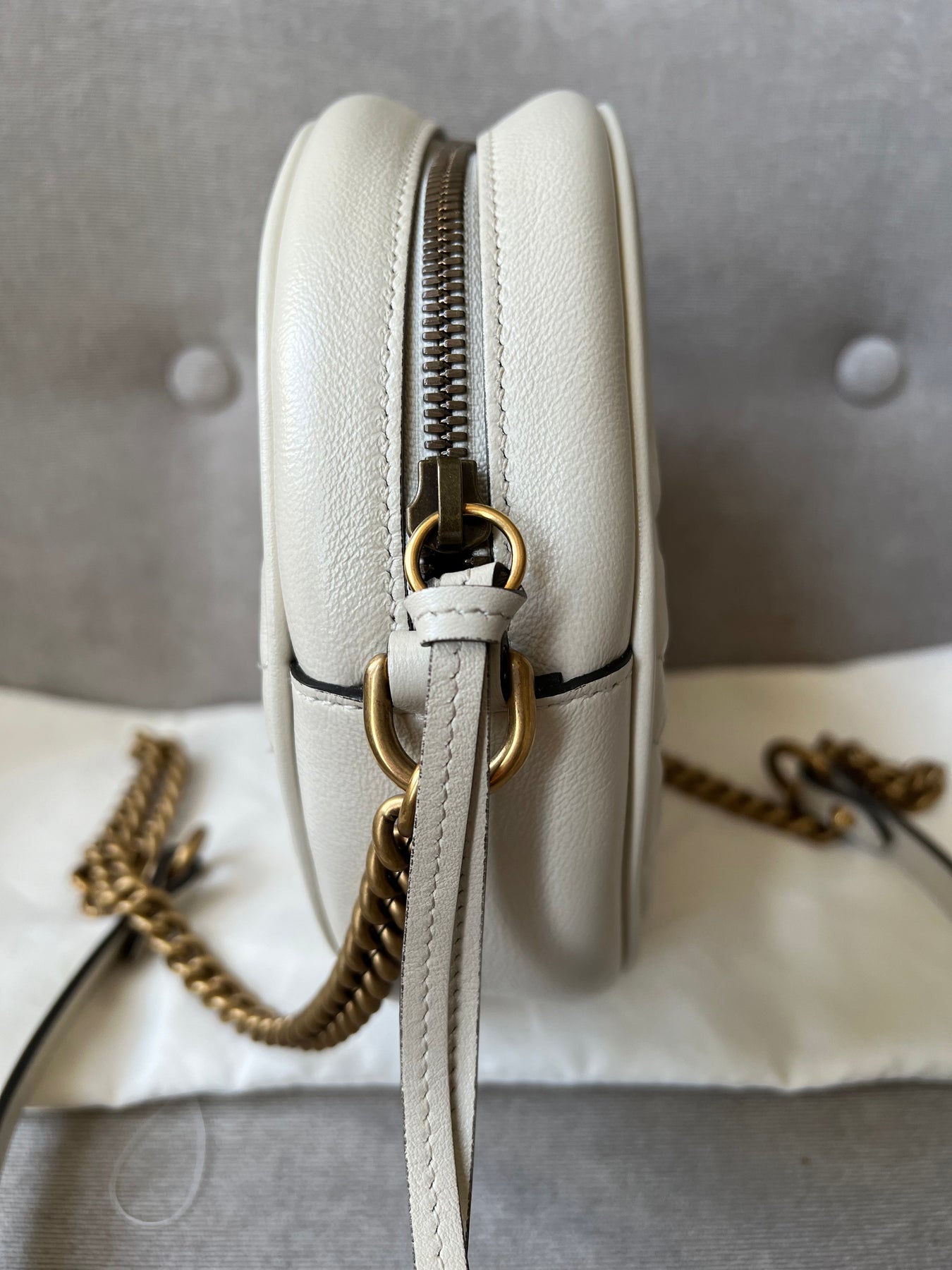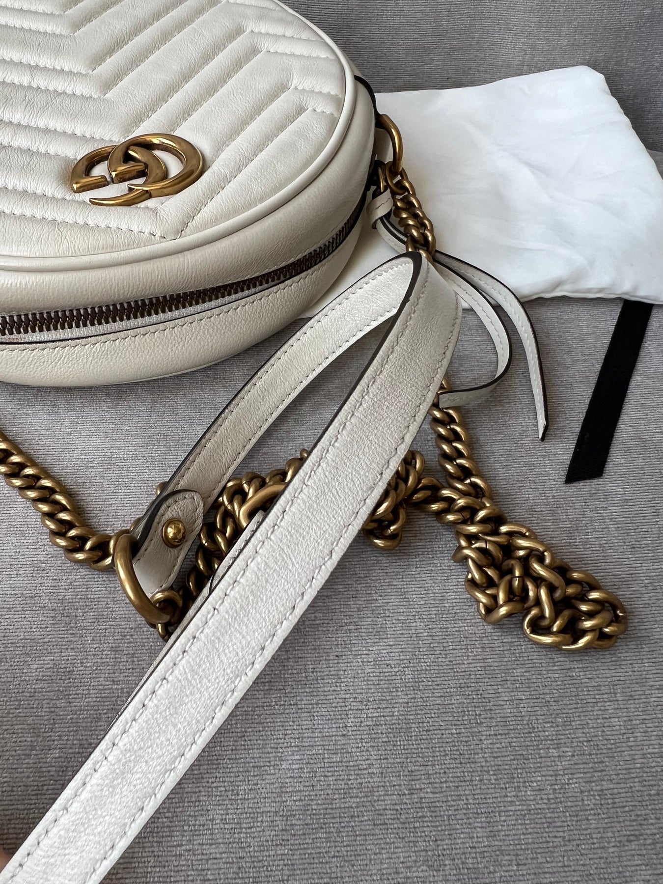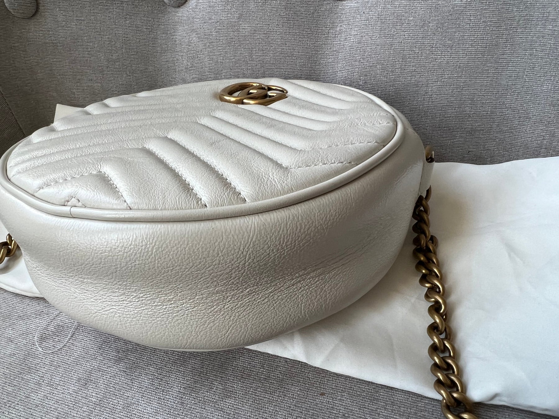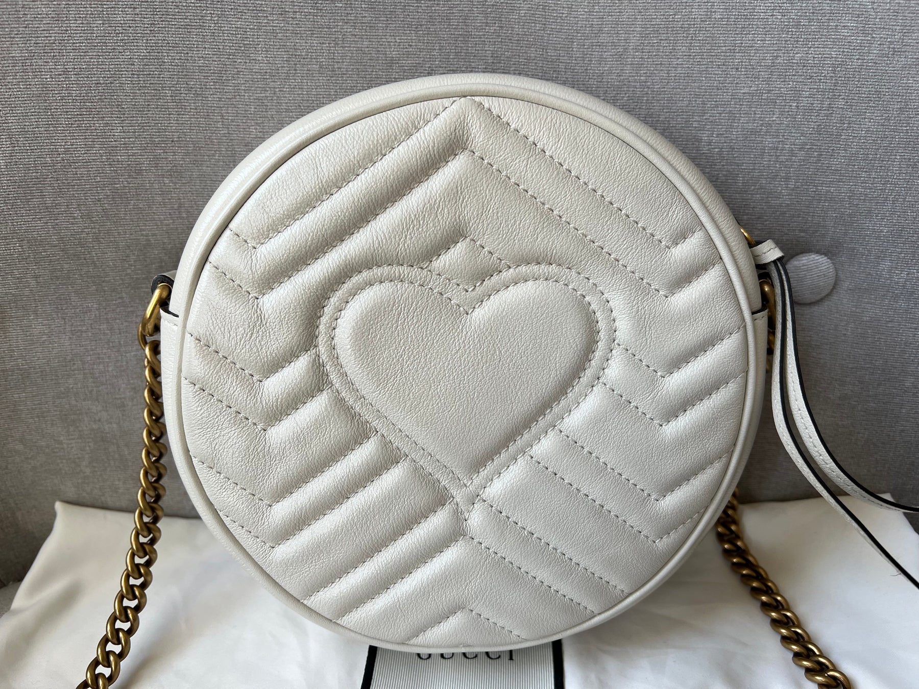 Gucci GG Marmont Mini round shoulder bag in white chevron quilted leather with gold hardware. Note this is more of a light cream shade rather than pure white; This small Marmont chain style bag has a softly structured shape and zip top closure. Effortlessly chic and sophisticated, this style can be worn both with a casual outfit or for evening wear. Suitable for both day to day or occasion wear and ideal for those who prefer a cross body option.