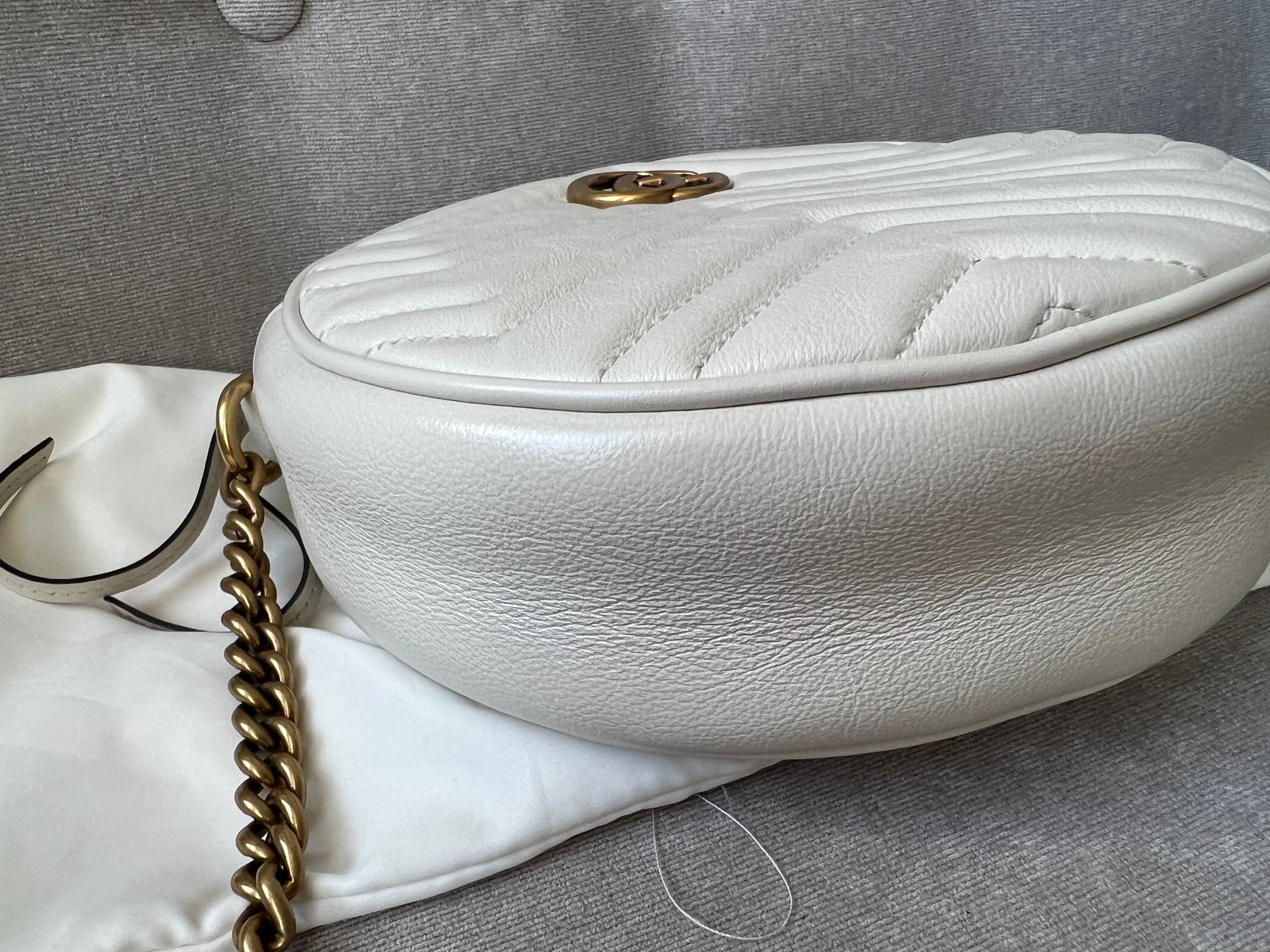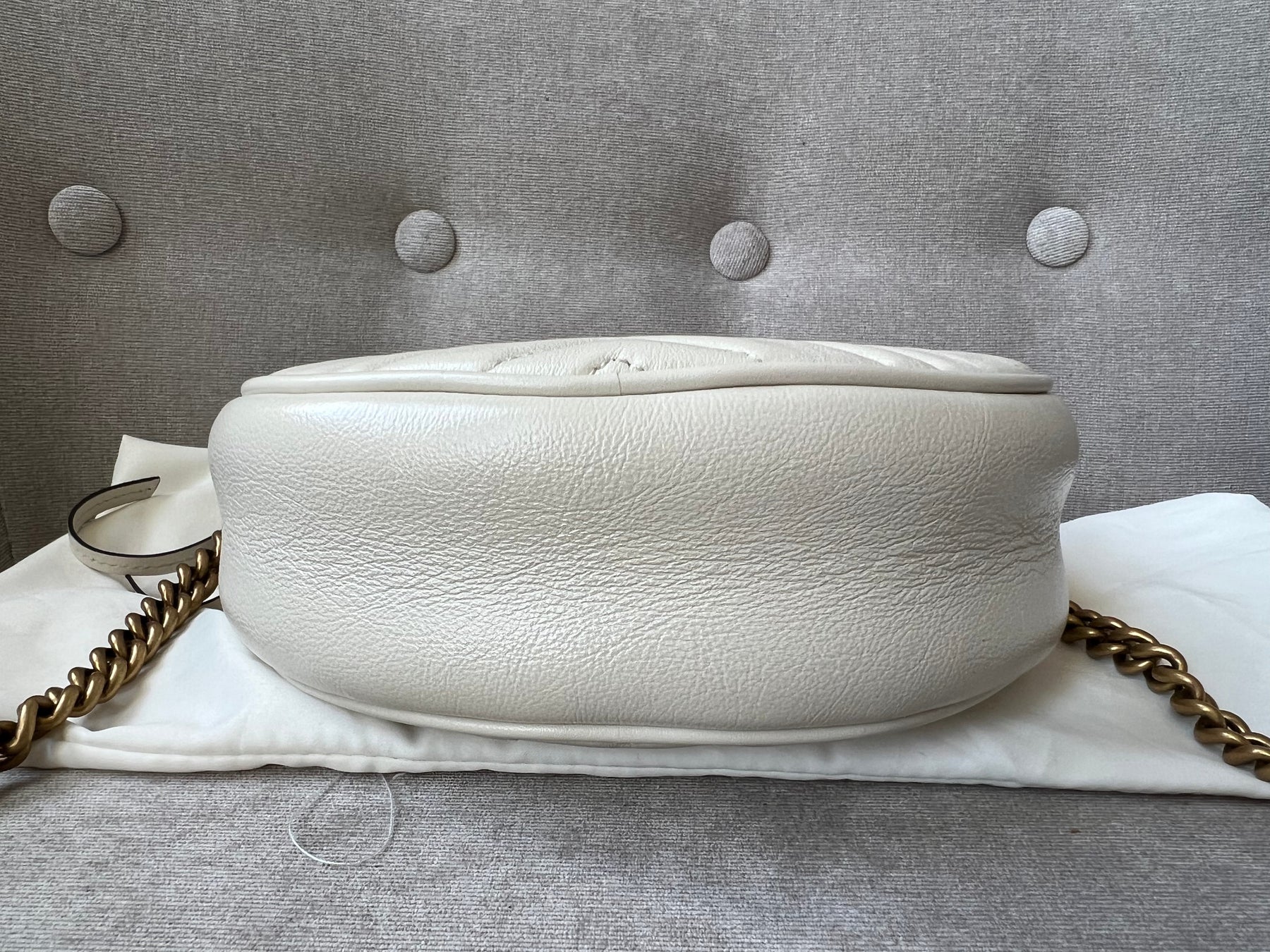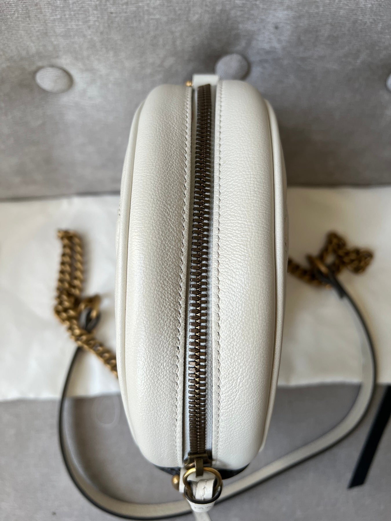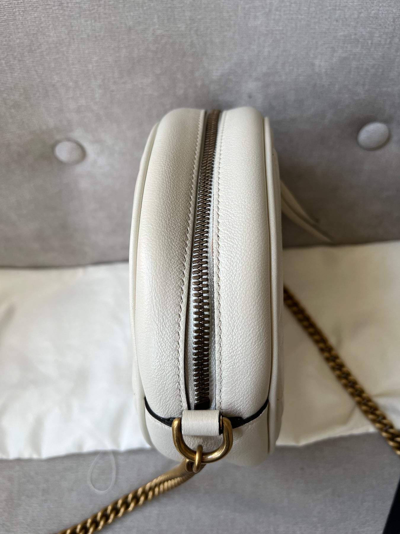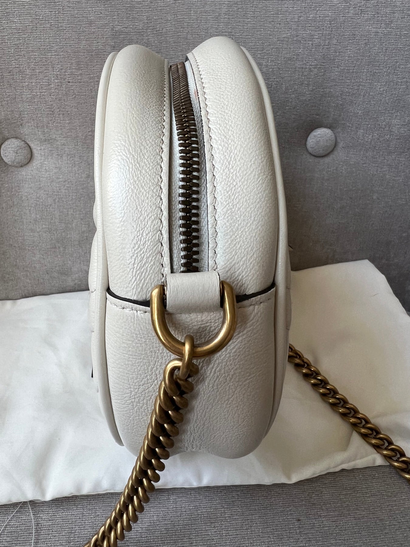 Gucci GG Marmont Mini round shoulder bag in white chevron quilted leather with gold hardware. Note this is more of a light cream shade rather than pure white; This small Marmont chain style bag has a softly structured shape and zip top closure. Effortlessly chic and sophisticated, this style can be worn both with a casual outfit or for evening wear. Suitable for both day to day or occasion wear and ideal for those who prefer a cross body option.