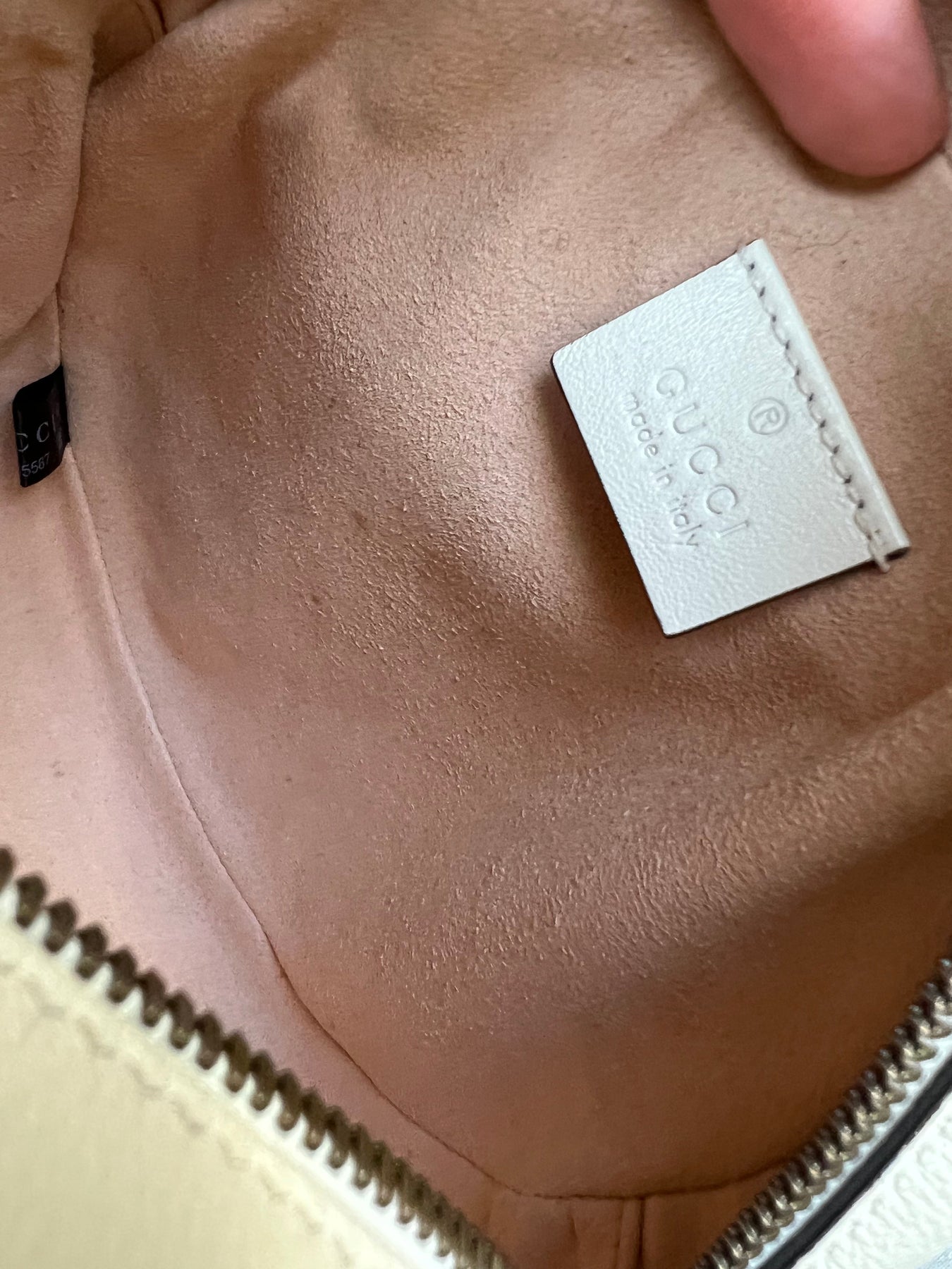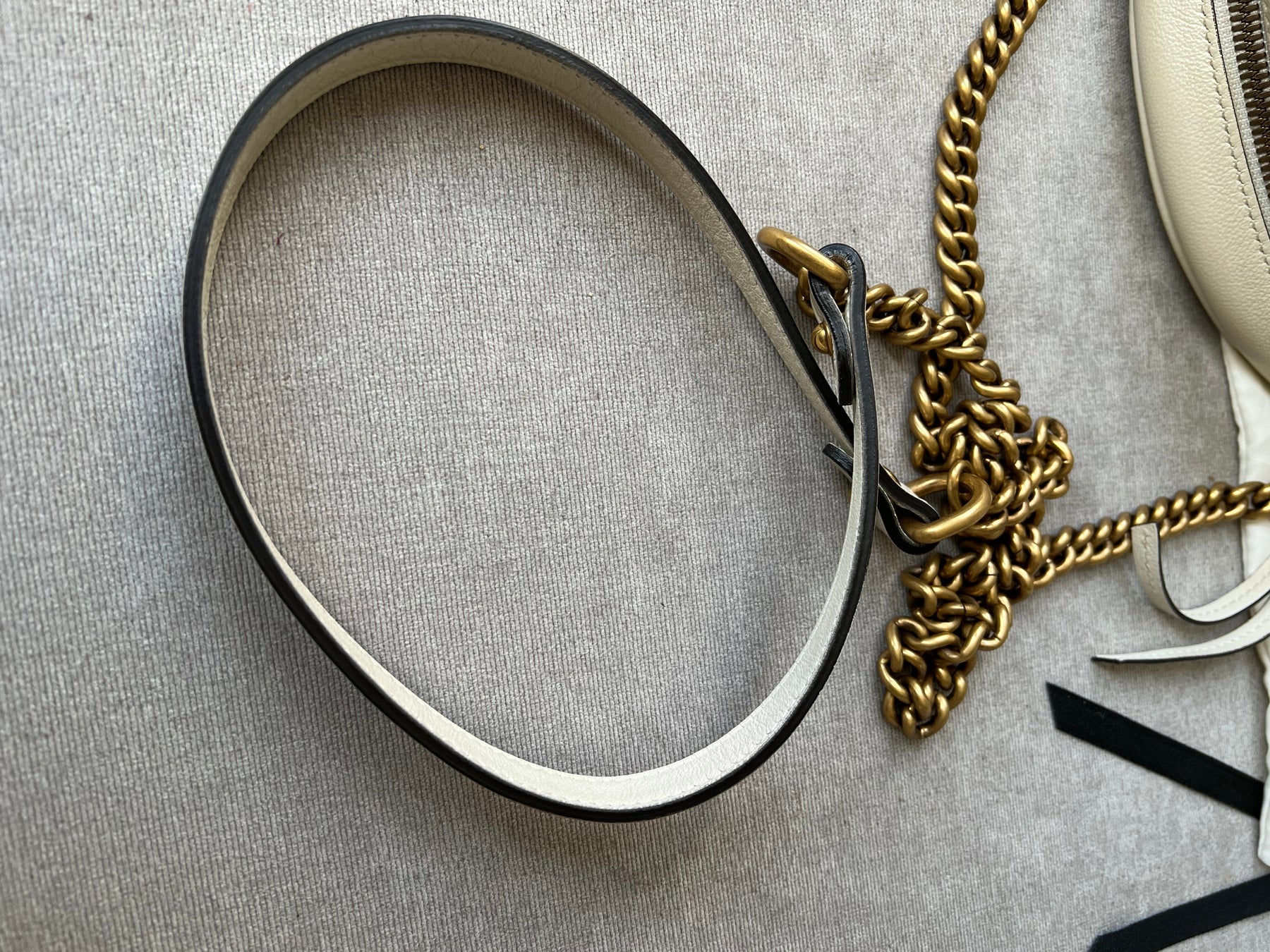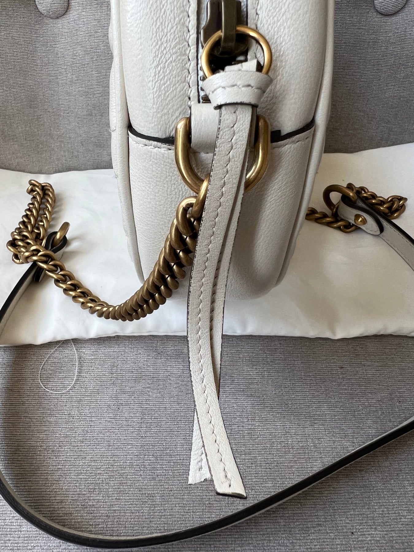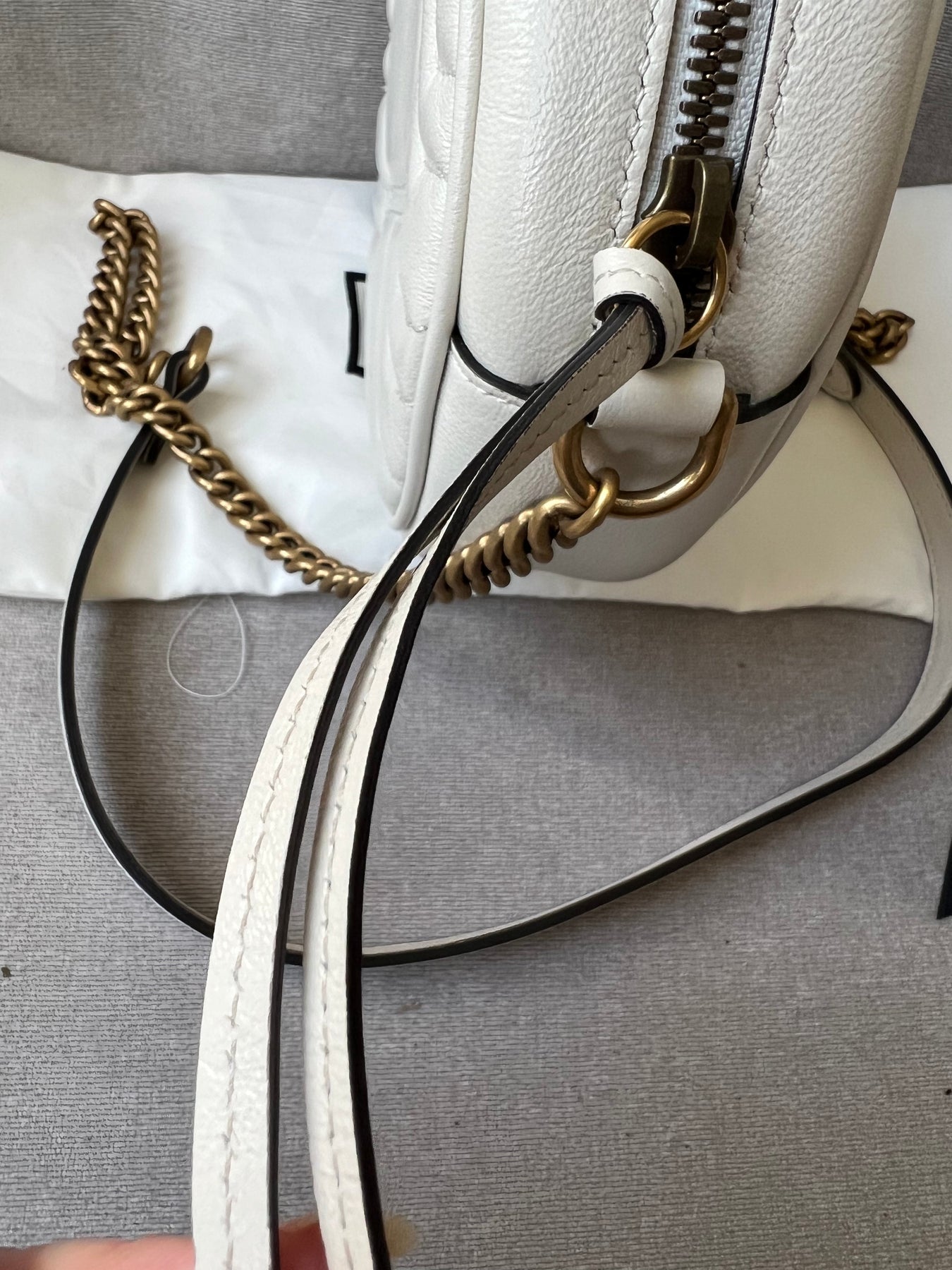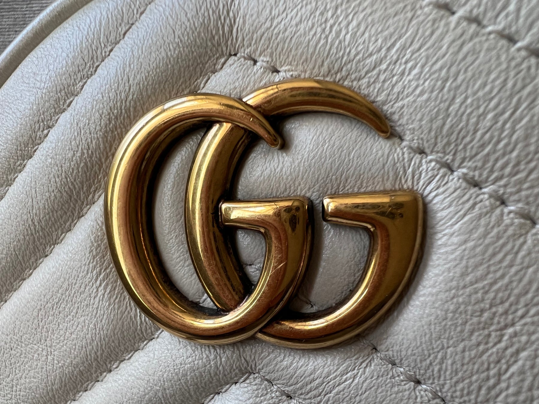 Gucci GG Marmont Mini round shoulder bag in white chevron quilted leather with gold hardware. Note this is more of a light cream shade rather than pure white; This small Marmont chain style bag has a softly structured shape and zip top closure. Effortlessly chic and sophisticated, this style can be worn both with a casual outfit or for evening wear. Suitable for both day to day or occasion wear and ideal for those who prefer a cross body option.