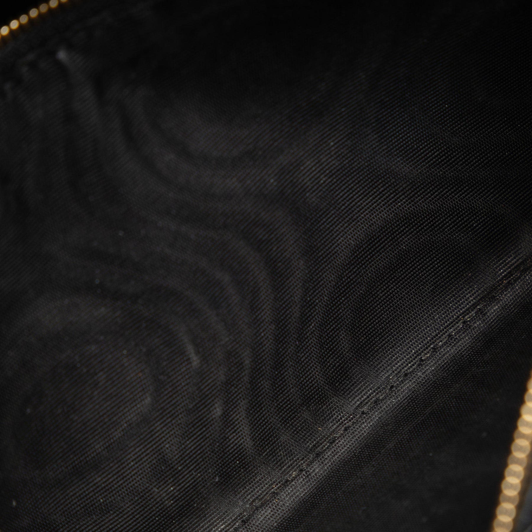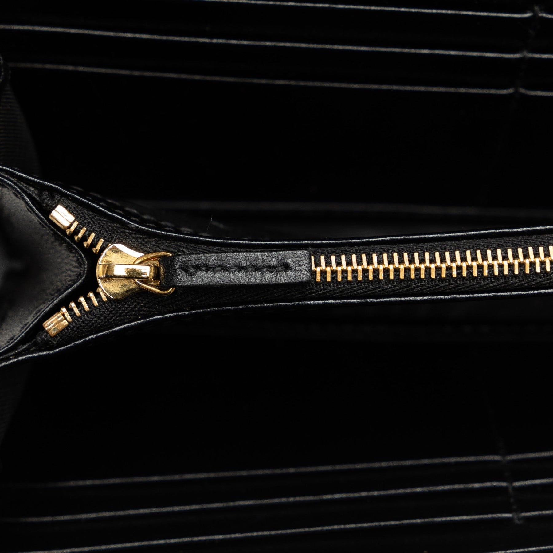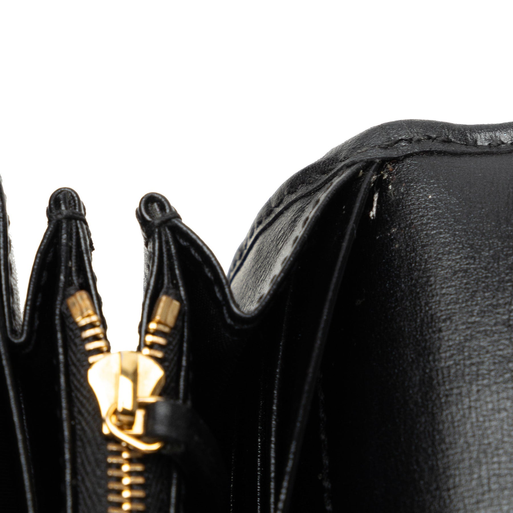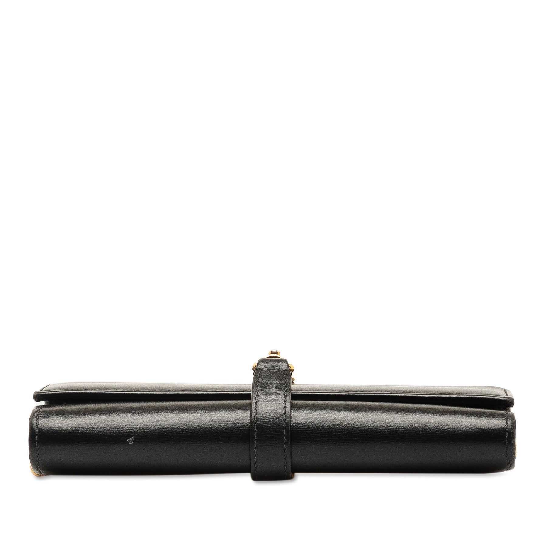 This wallet on chain features a leather body, a chain shoulder strap, a flap with push lock closure, and interior zip and slip pockets. Comes with box and dust bag.