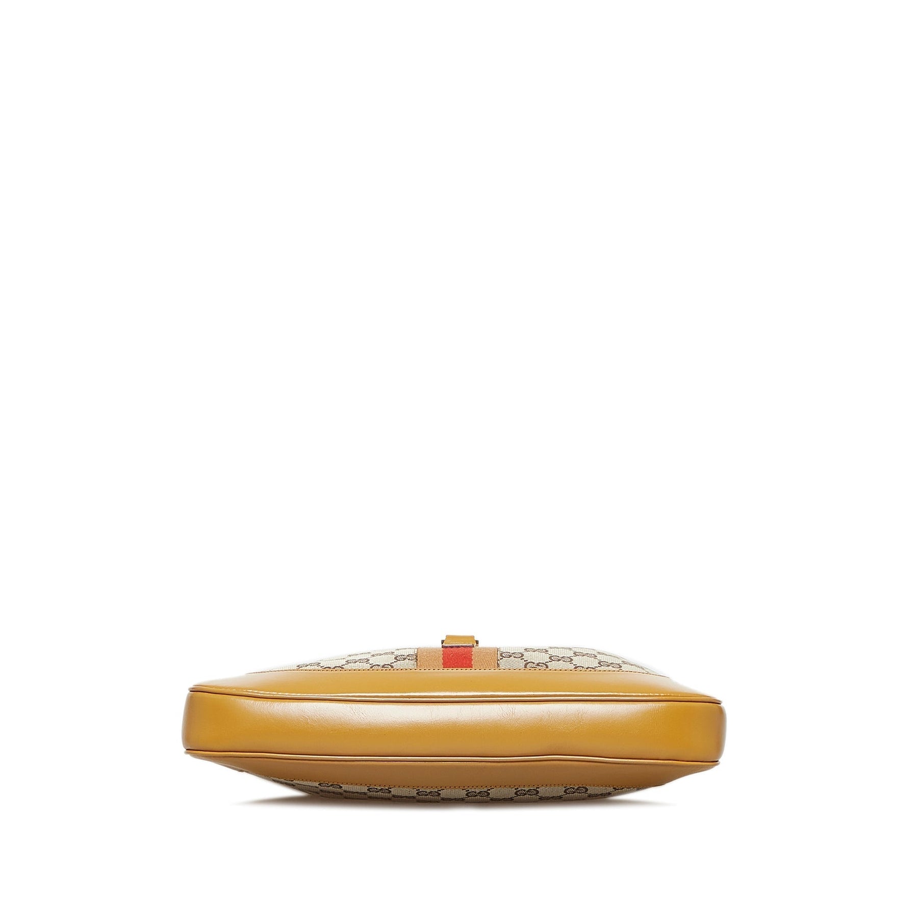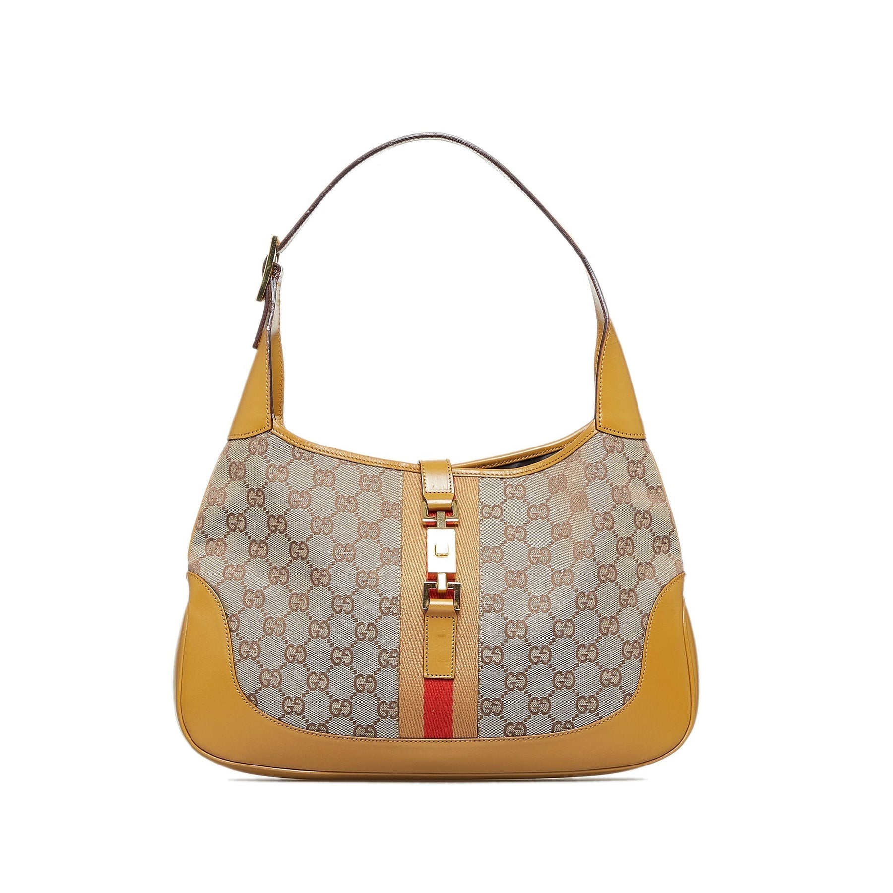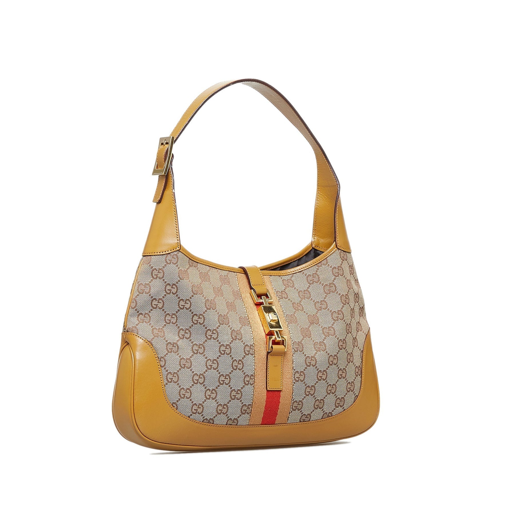 The timeless Gucci Jackie is an iconic masterpiece. Its GG canvas body exudes luxury, complemented by an adjustable mustard-colored leather handle and a strap with push-lock closure for a touch of sophistication. Keep things organized with the zippered interior pocket. With this adorable Bag you can effortlessly upgrade your style and make a bold statement anywhere, whether you're on the chic city streets or at glamorous events. It can be over the shoulder or over the arm.
