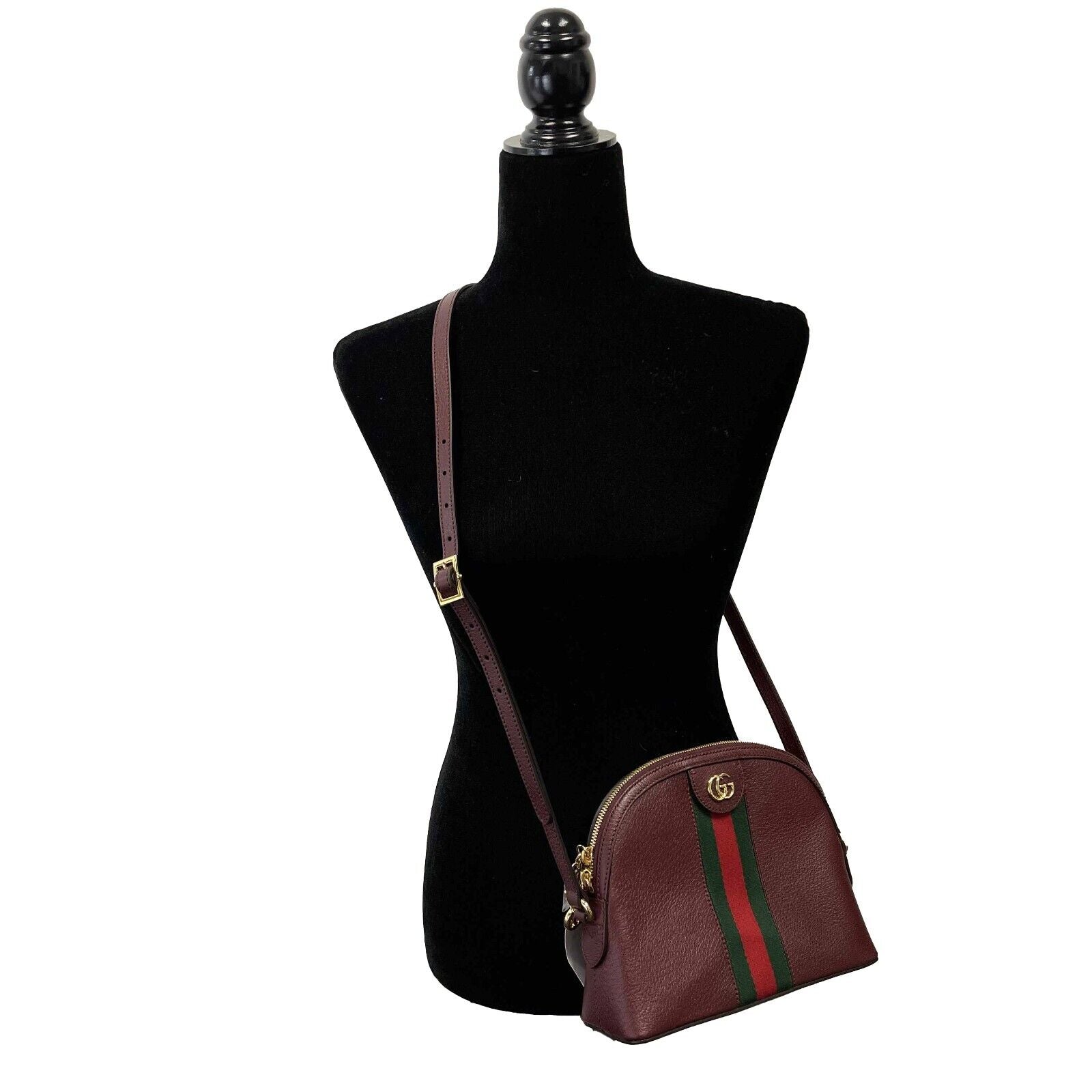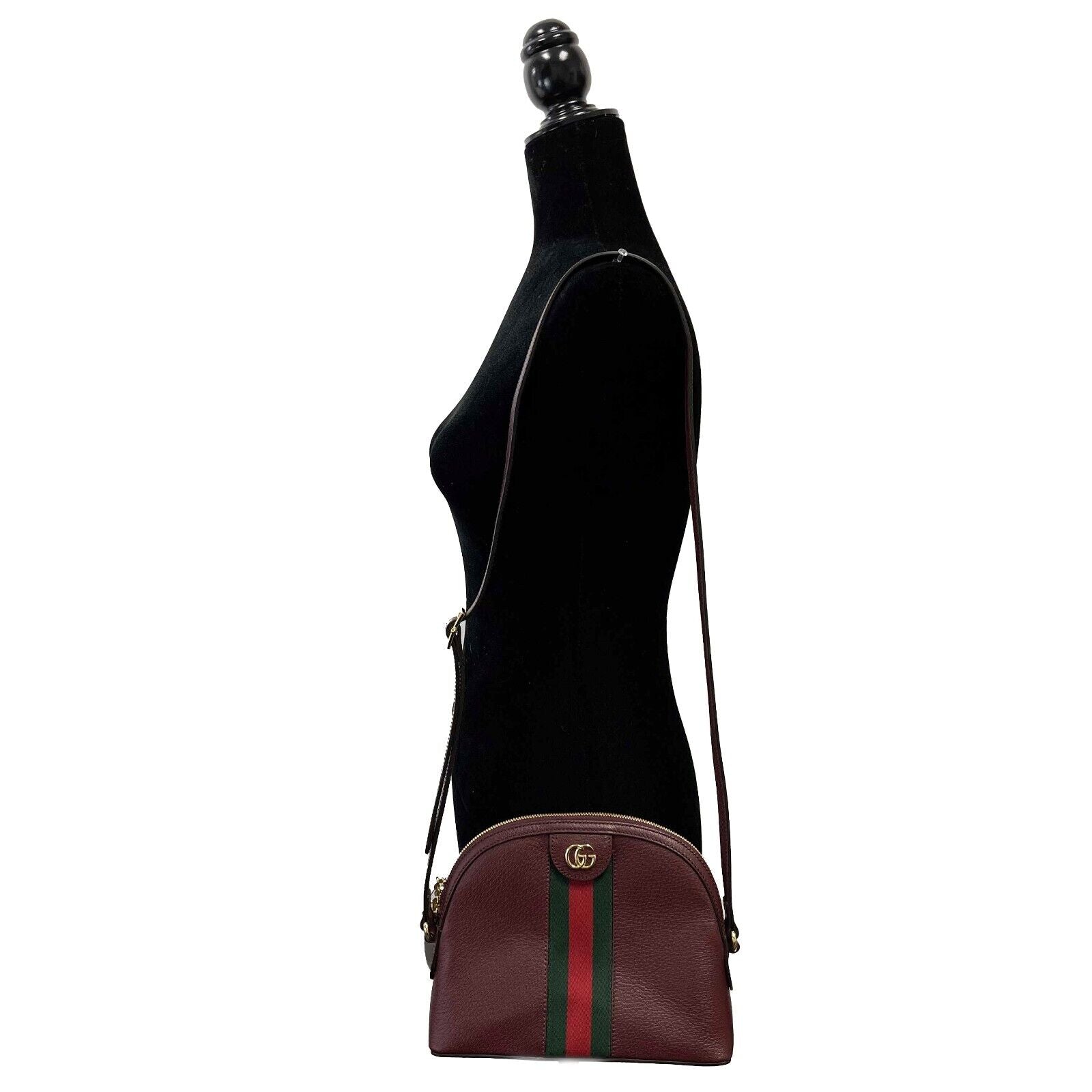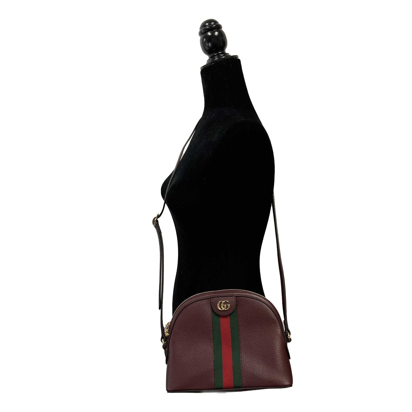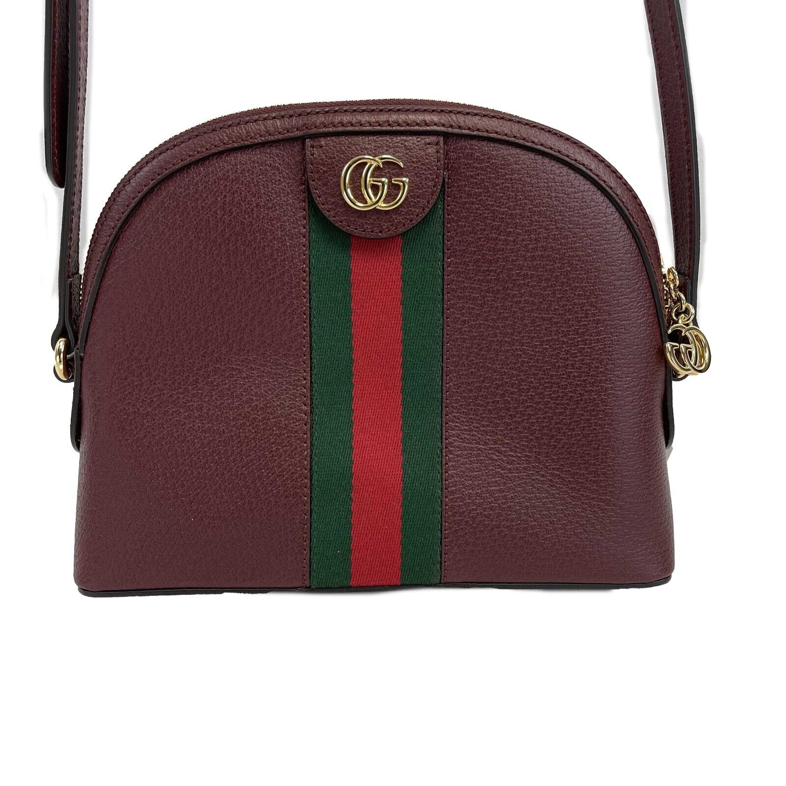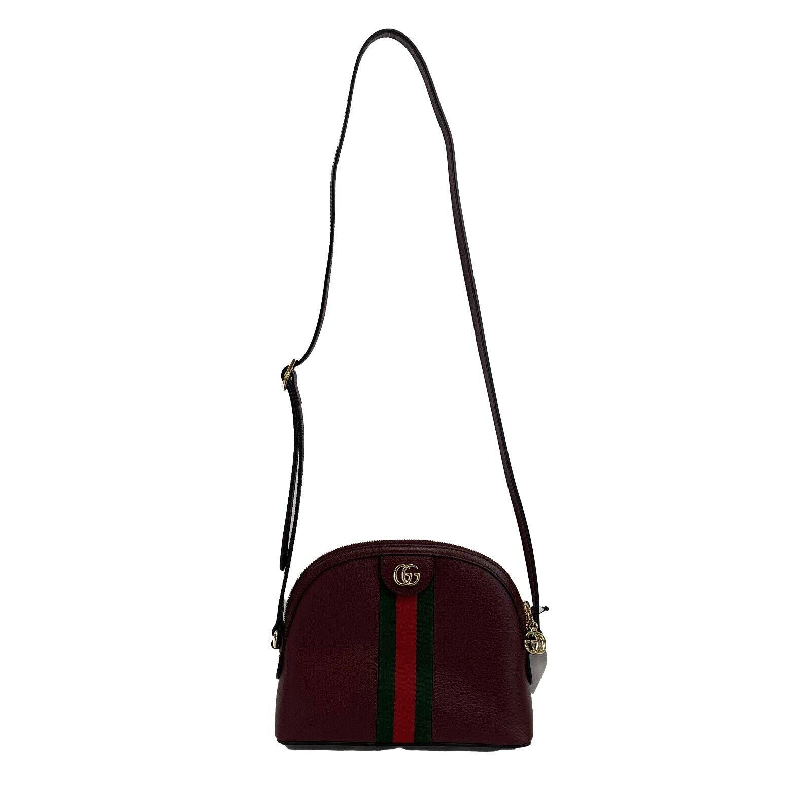 * The rounded top Ophidia shoulder bag is introduced in a new iteration for Pre-Fall 2019, crafted from textured burgundy leather with inlaid green and red Web stripe. The coveted style is defined by small Double G details at the front tab and zipper pulls-a contemporary take on a Gucci archival belt buckle from the '70s, repurposed into a precious petite variation. Burgundy leather. Green and red Web. Shiny gold-toned hardware. Microfiber lining with a suede like finish. Double G. Zipper pullers with Double G charms. Interior open pocket and smartphone pockets. Adjustable shoulder strap