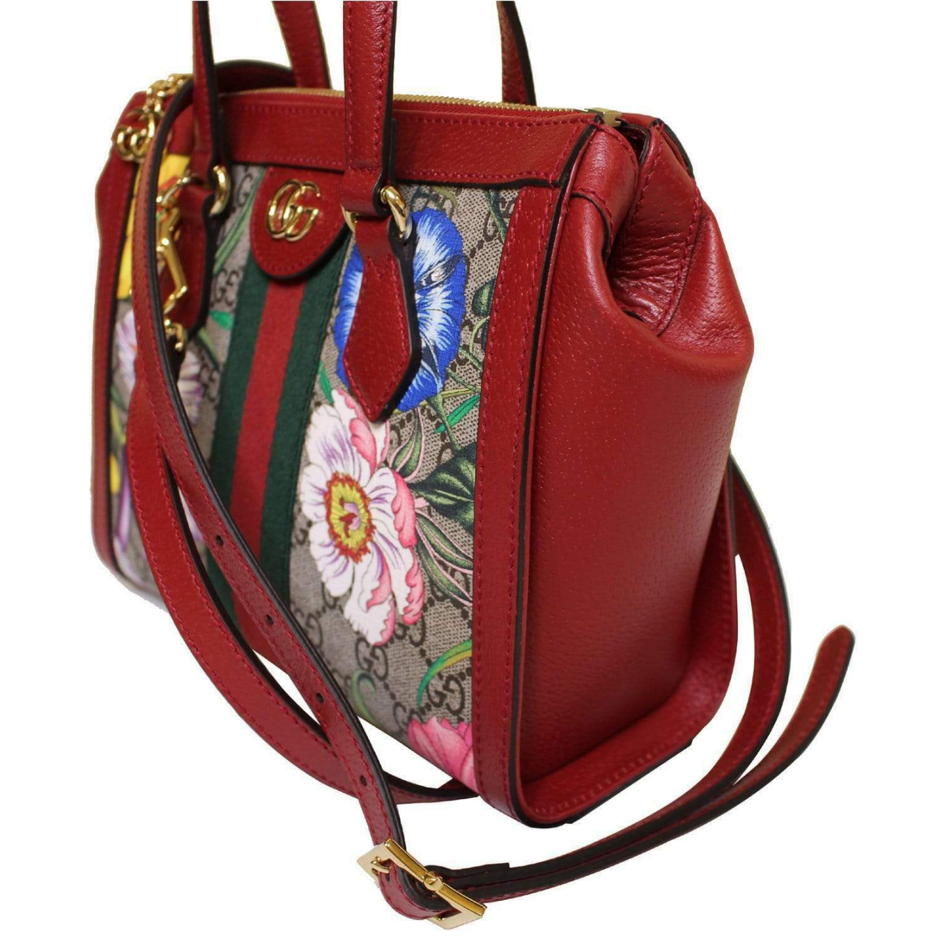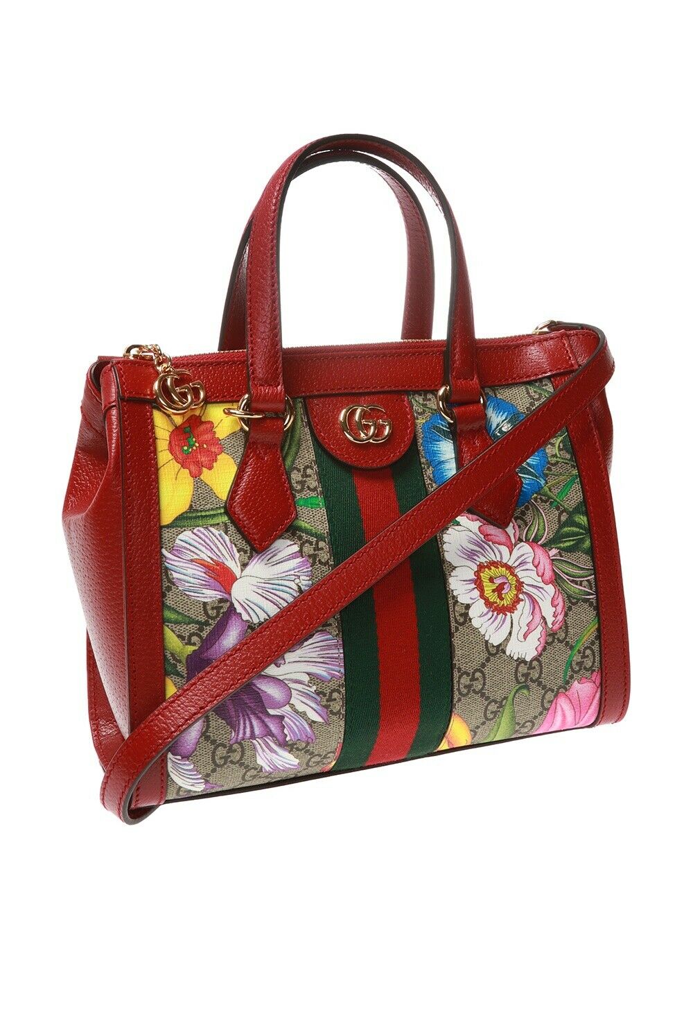 features a zipper closure, flora print, green and red Web detail, detachable shoulder strap with 23" drop, double leather handles with