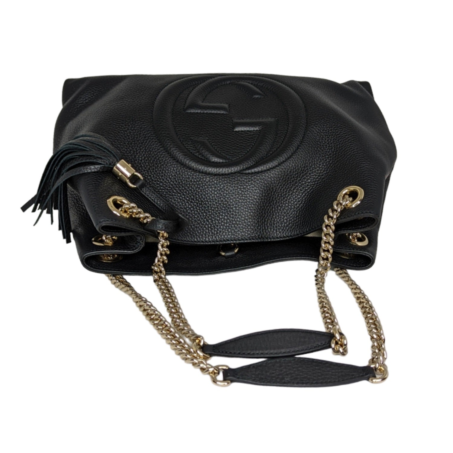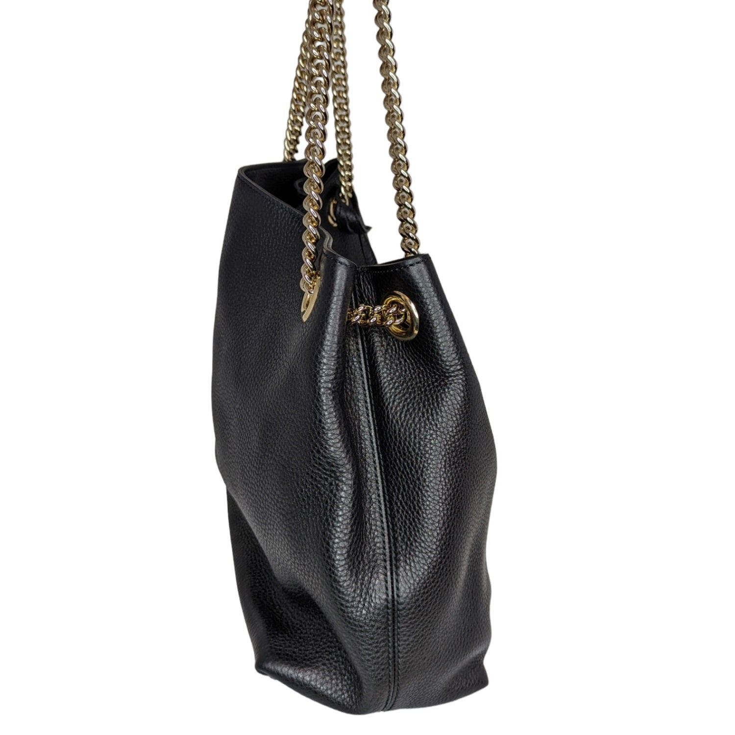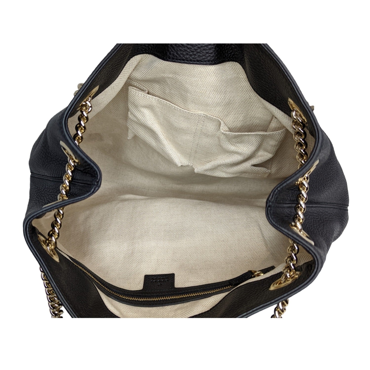 This shoulder bag is crafted of textured calfskin leather in black. The bag features a prominent front interlocking GG quilted logo, polished light gold chain link shoulder straps with shoulder pads, and a decorative light gold knobbed tassel. The top is open to a beige linen fabric interior with pockets.