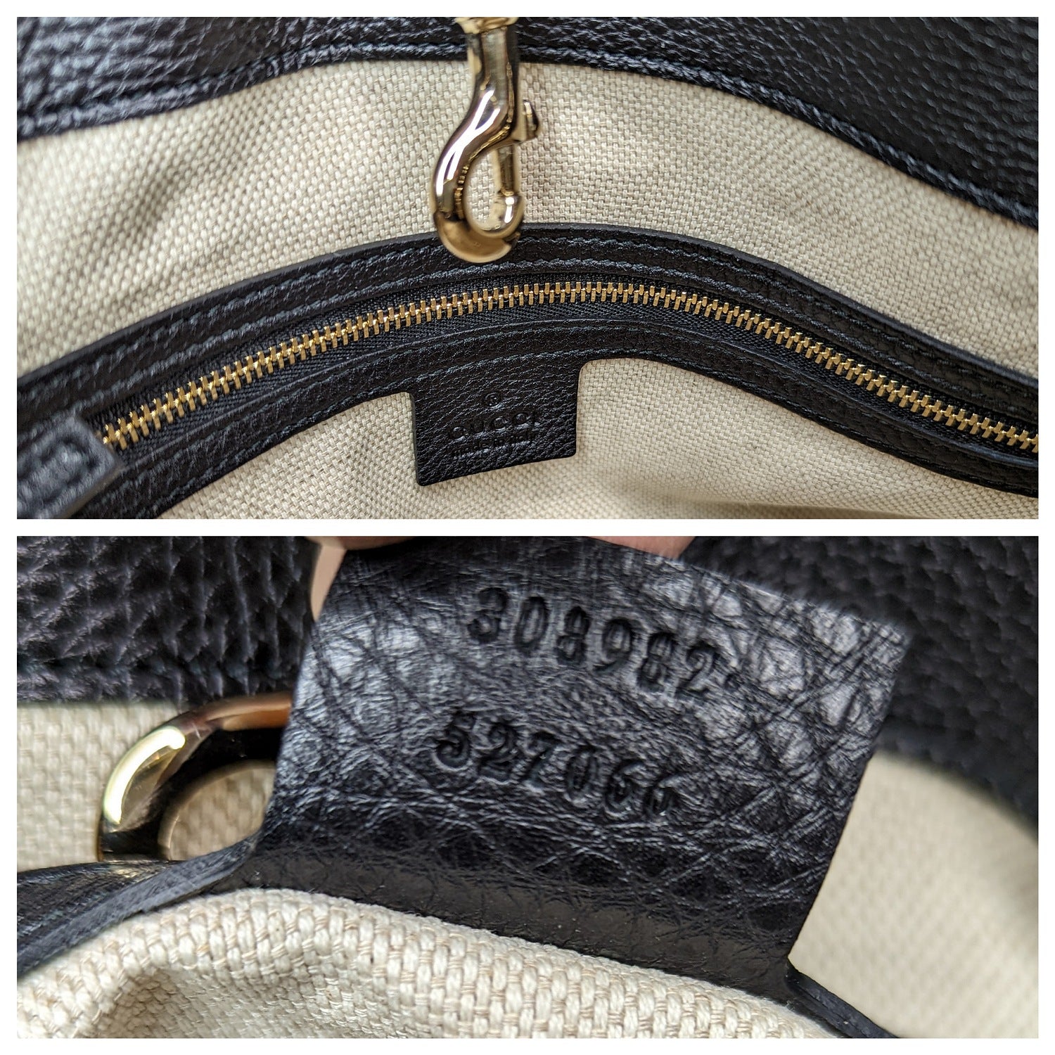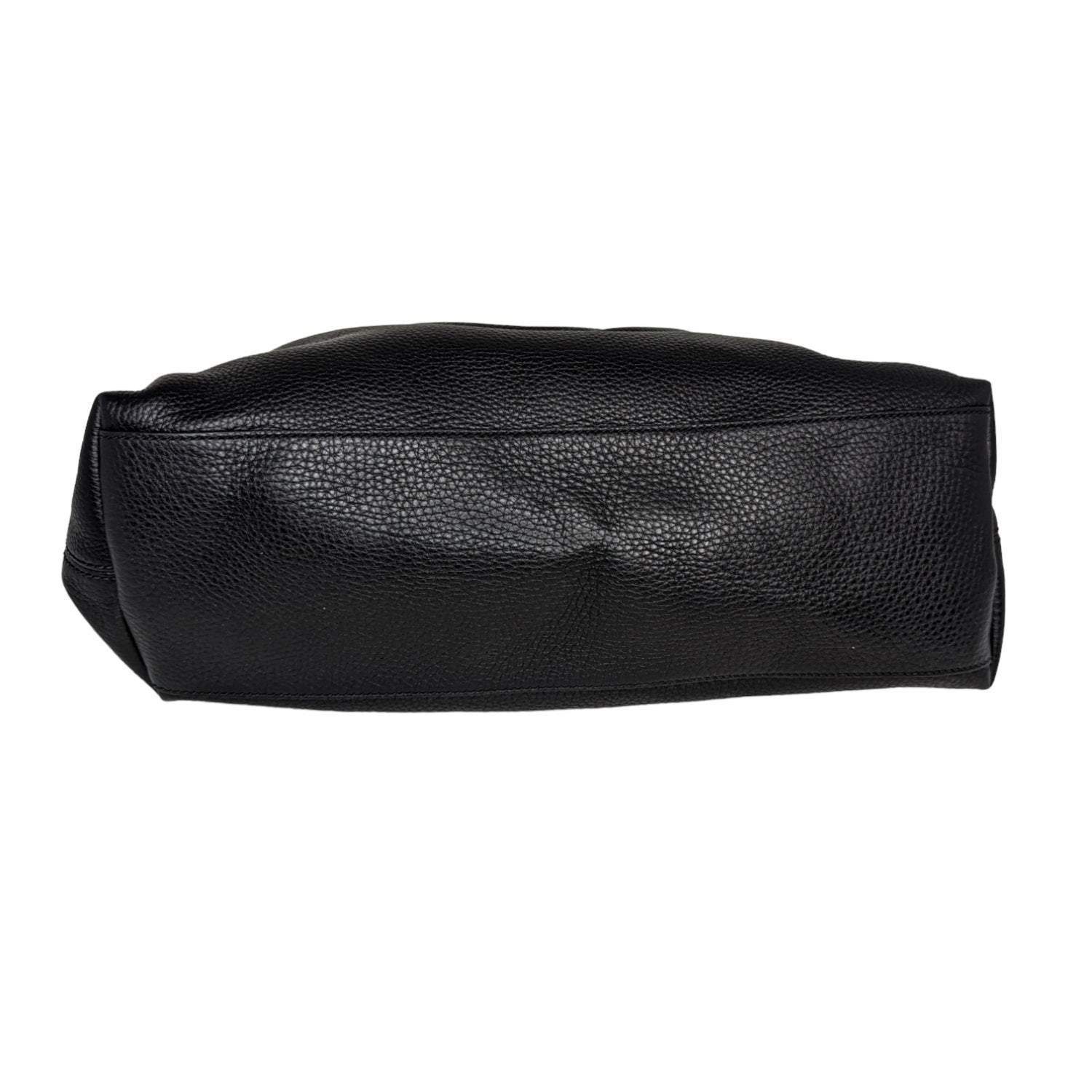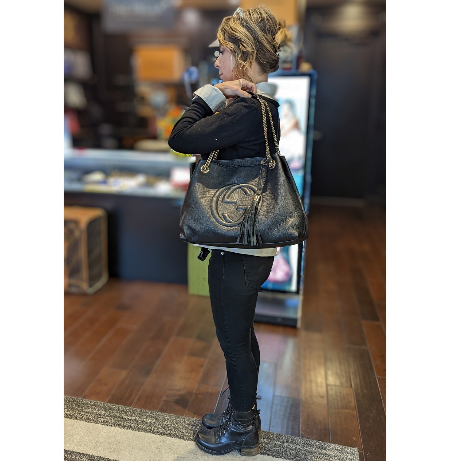 This shoulder bag is crafted of textured calfskin leather in black. The bag features a prominent front interlocking GG quilted logo, polished light gold chain link shoulder straps with shoulder pads, and a decorative light gold knobbed tassel. The top is open to a beige linen fabric interior with pockets.