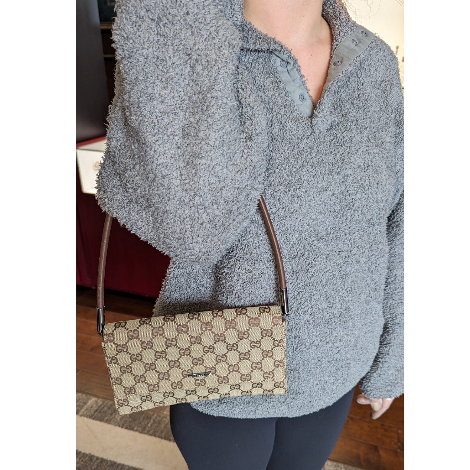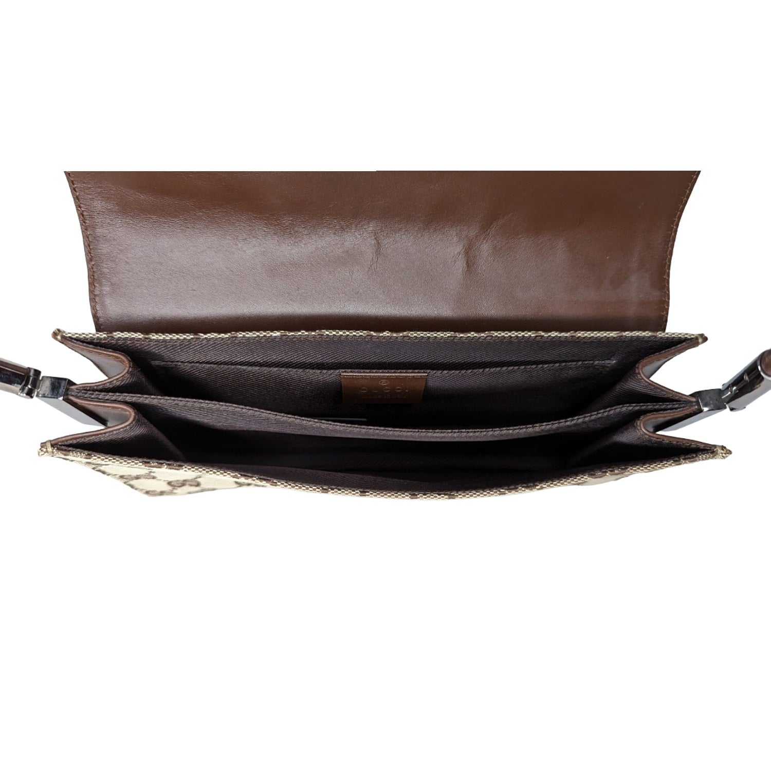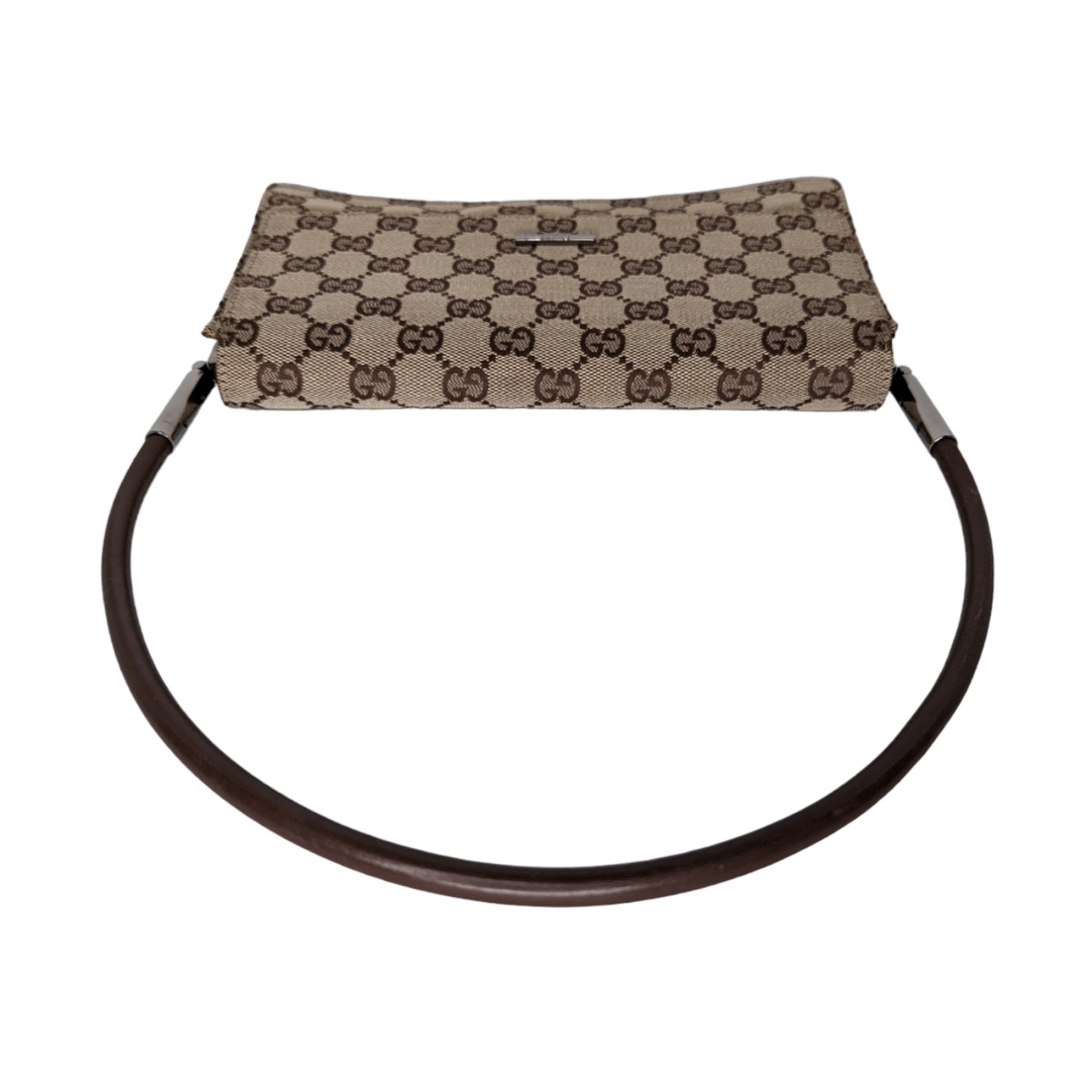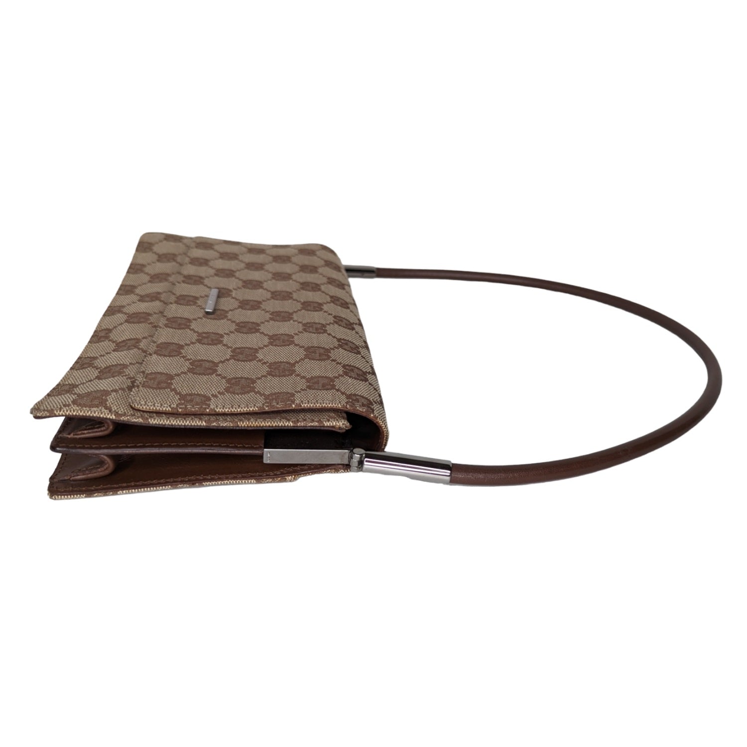 This chic handbag is finely crafted of Gucci GG monogram fabric canvas in beige with brown. The shoulder bag features a brown leather strap, leather piping, and silver-tone hardware. The flap opens to a partitioned brown fabric interior.