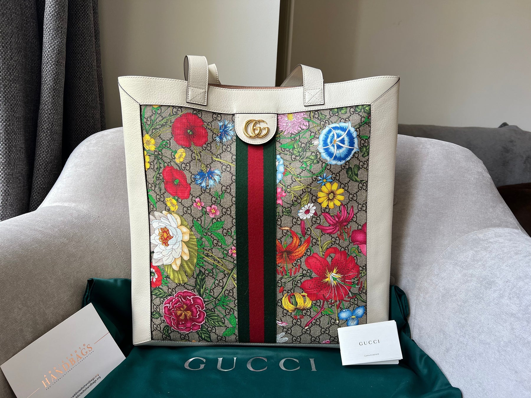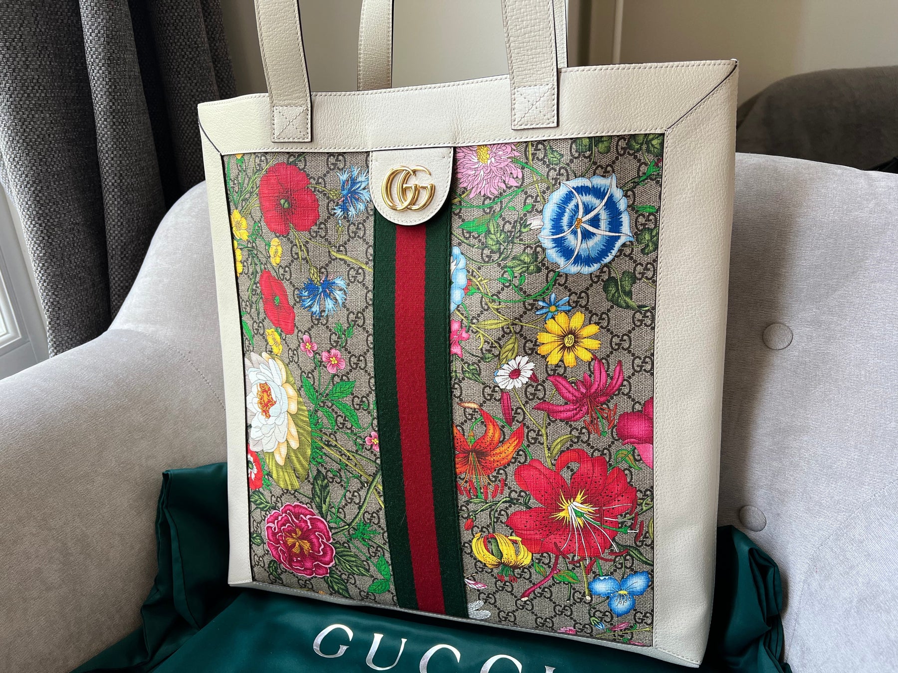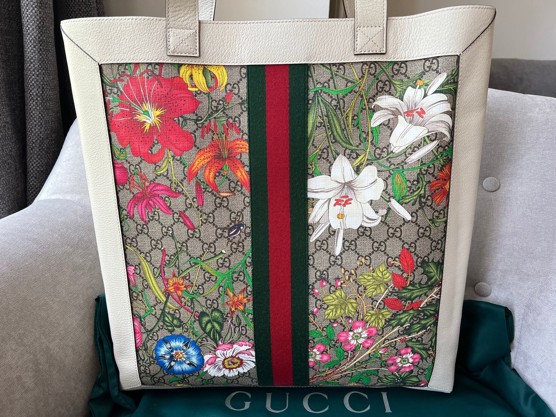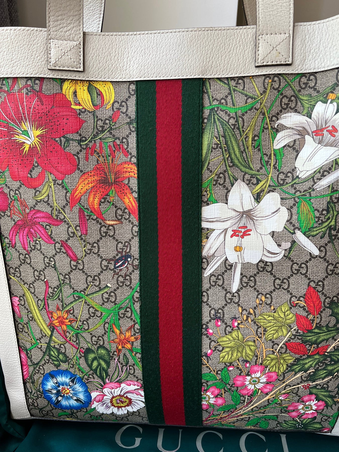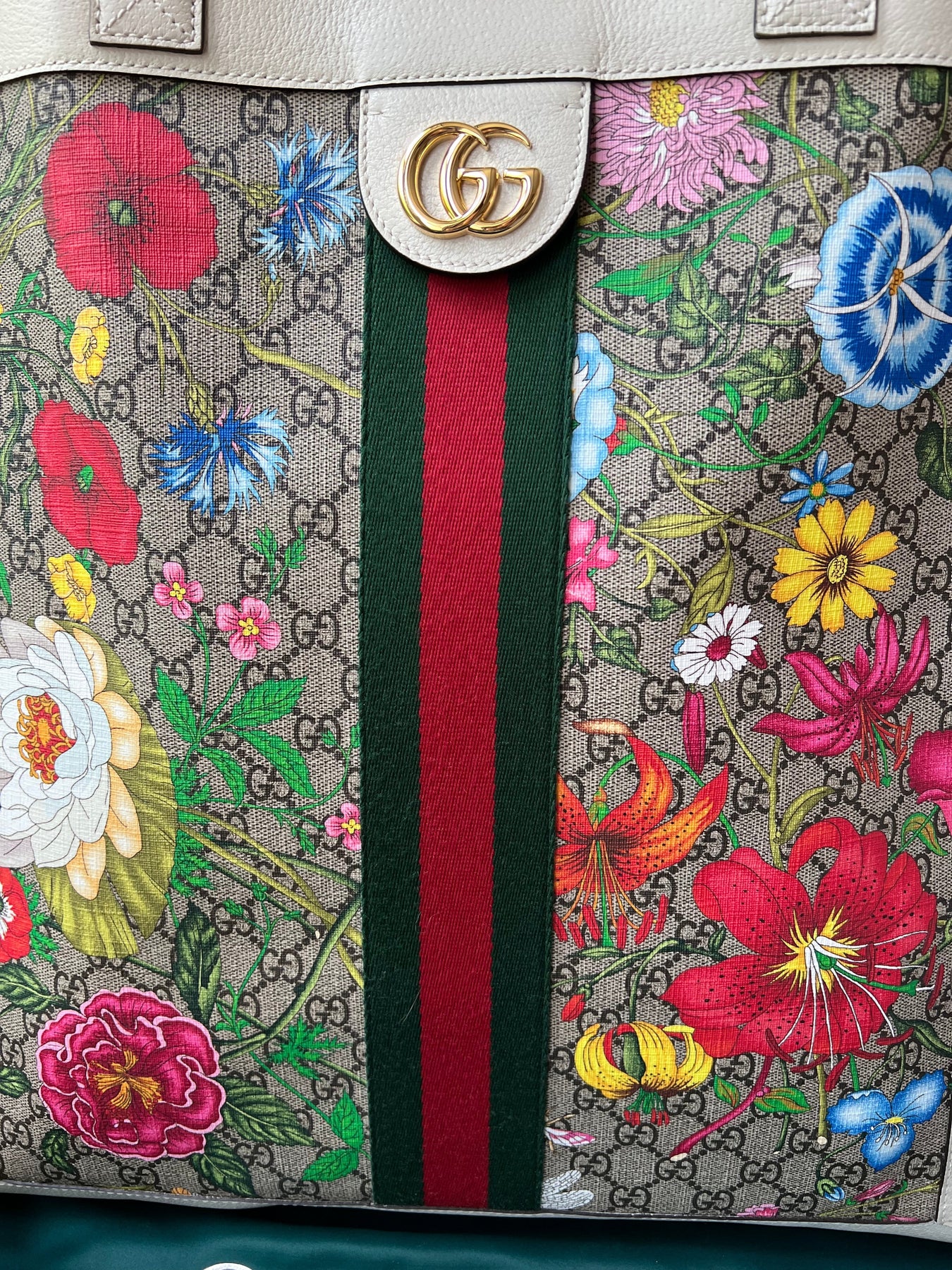 Gucci Flora Large Ophidia Shopping Bag in Canvas with floral print and white leather trim. Gold hardware. It features the gold metal GG logo on the front and green/red/green stripes on the front and back. It also features double top flat leather handles and open top. Perfect day to day bag for those who prefer a larger sized bag. Can be worn over shoulder or carried in hand.