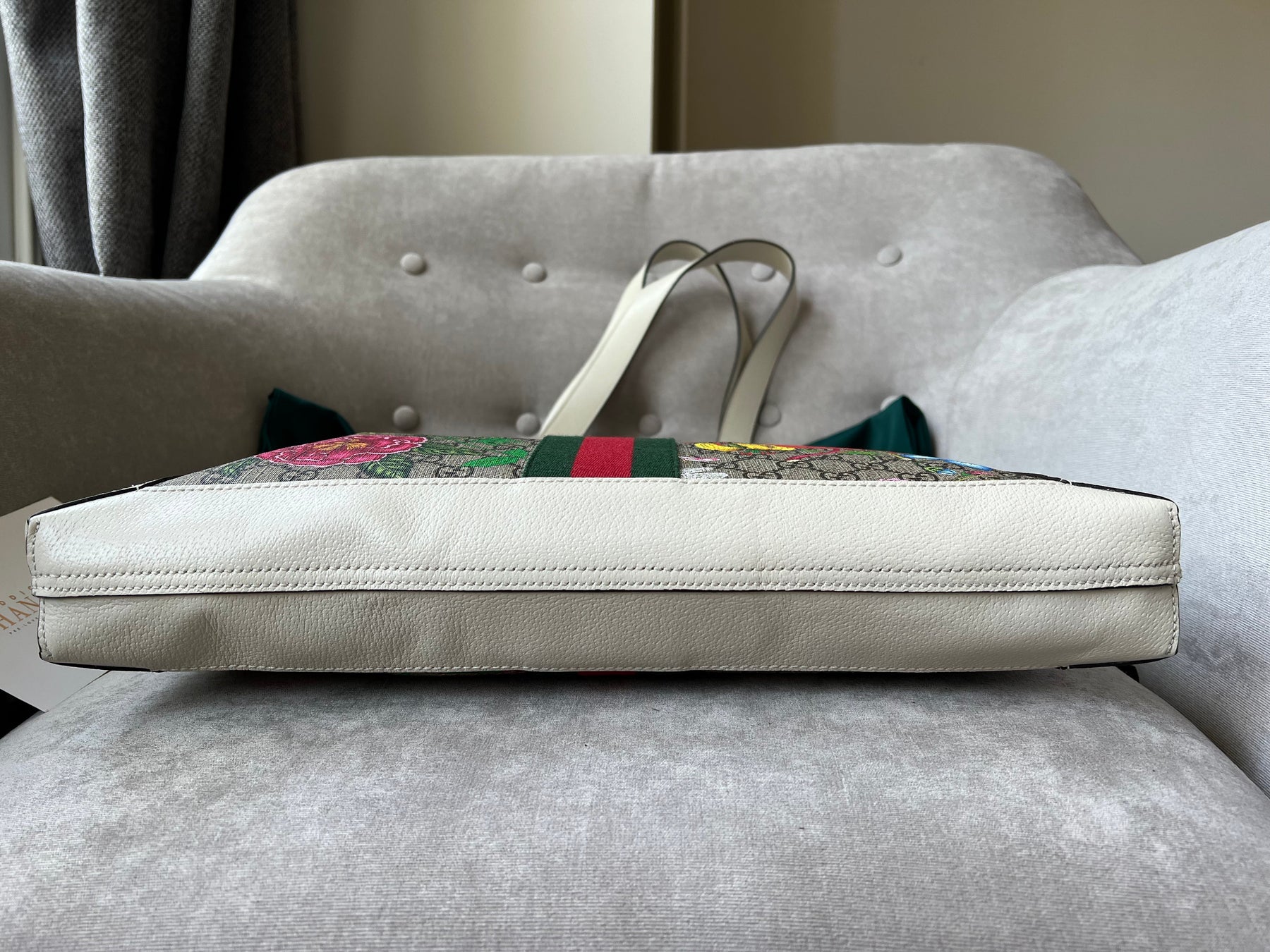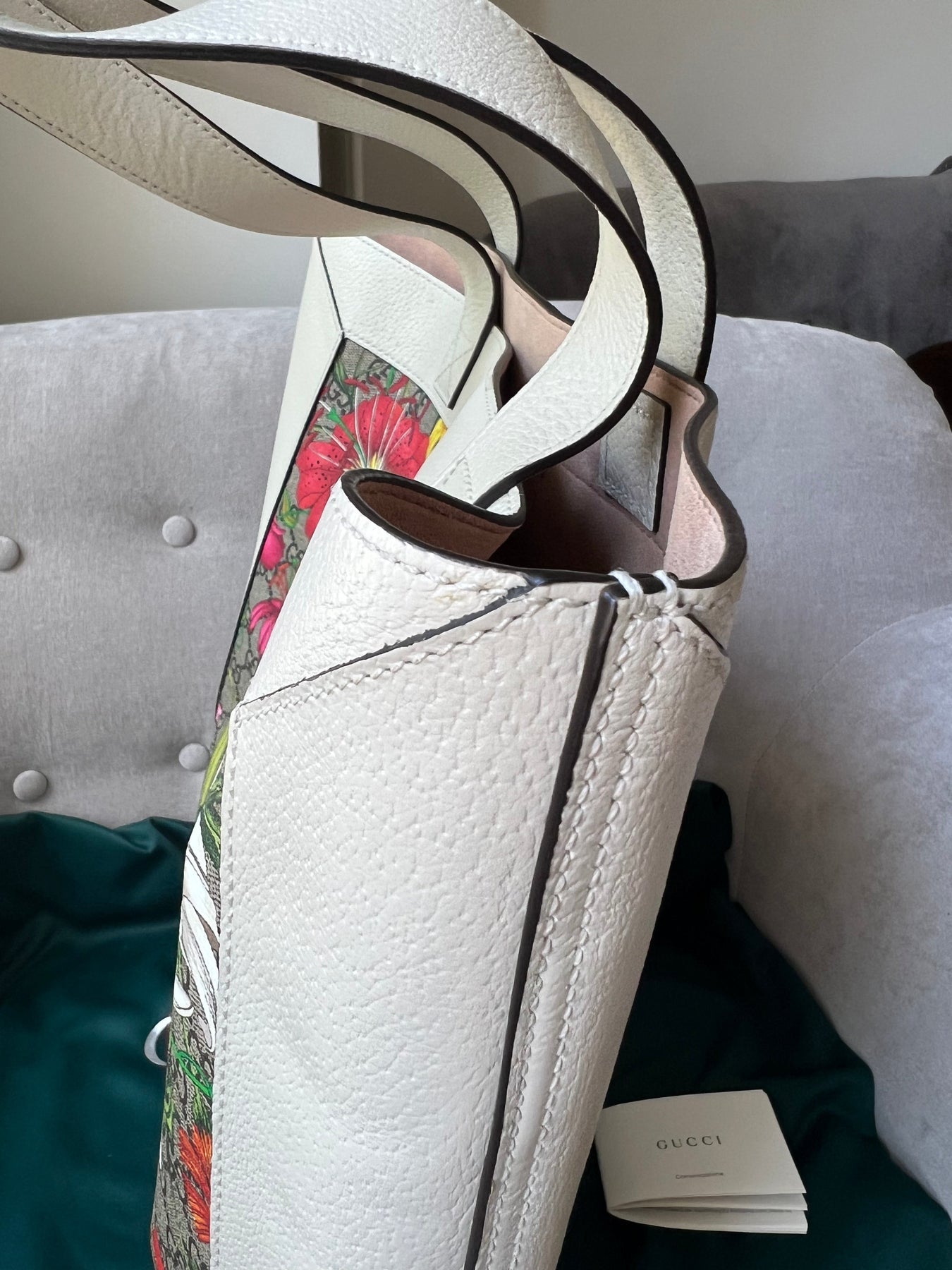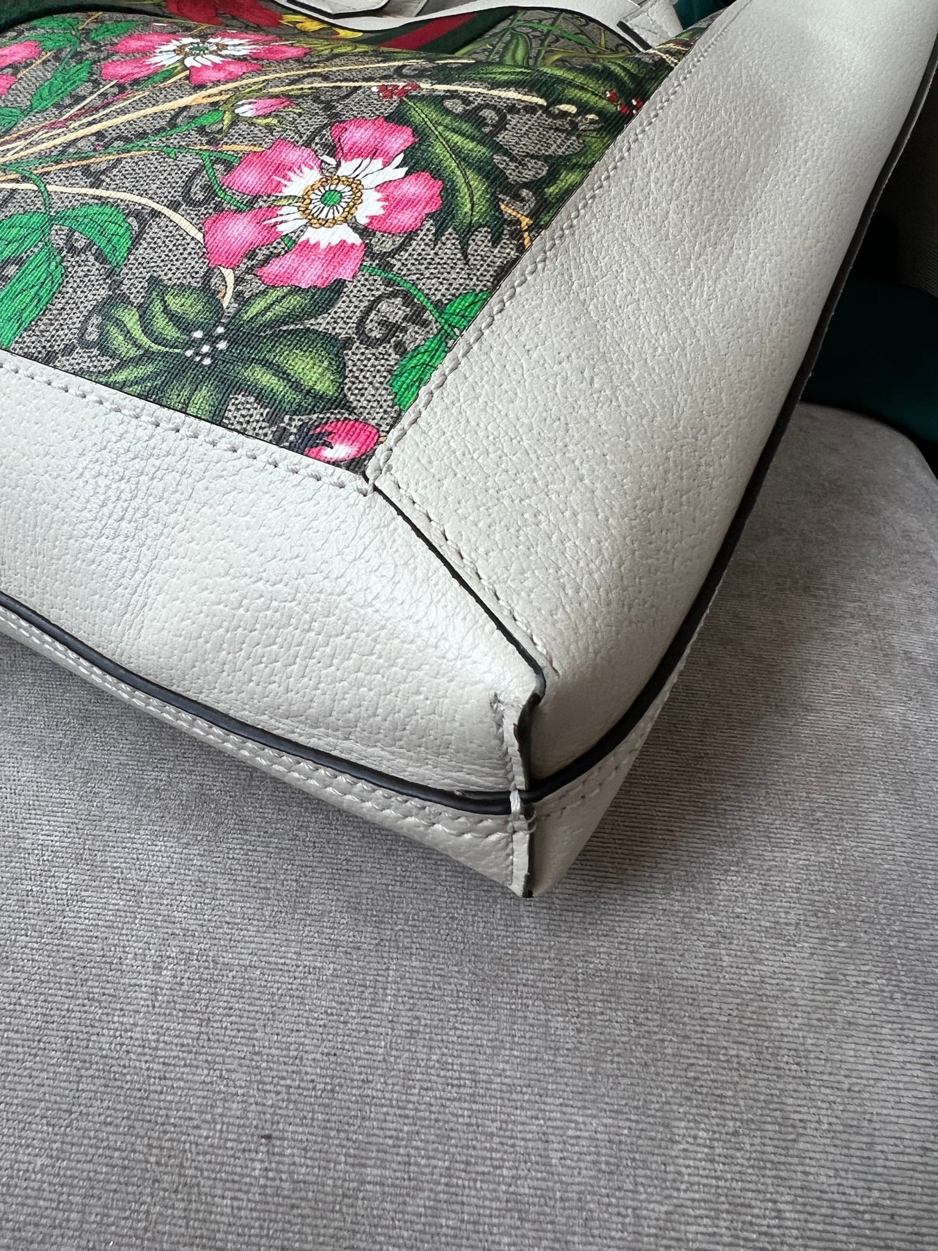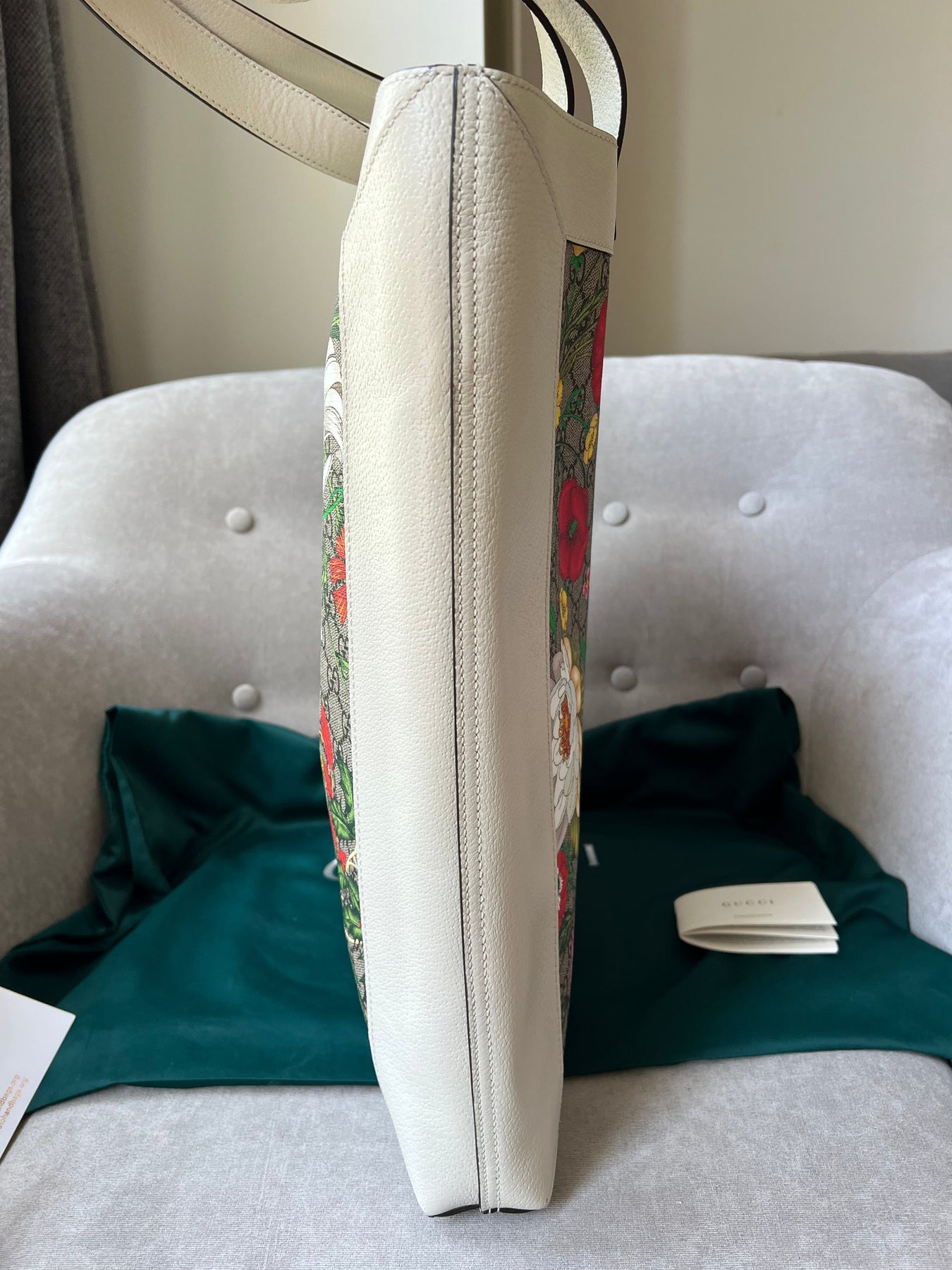 Gucci Flora Large Ophidia Shopping Bag in Canvas with floral print and white leather trim. Gold hardware. It features the gold metal GG logo on the front and green/red/green stripes on the front and back. It also features double top flat leather handles and open top. Perfect day to day bag for those who prefer a larger sized bag. Can be worn over shoulder or carried in hand.