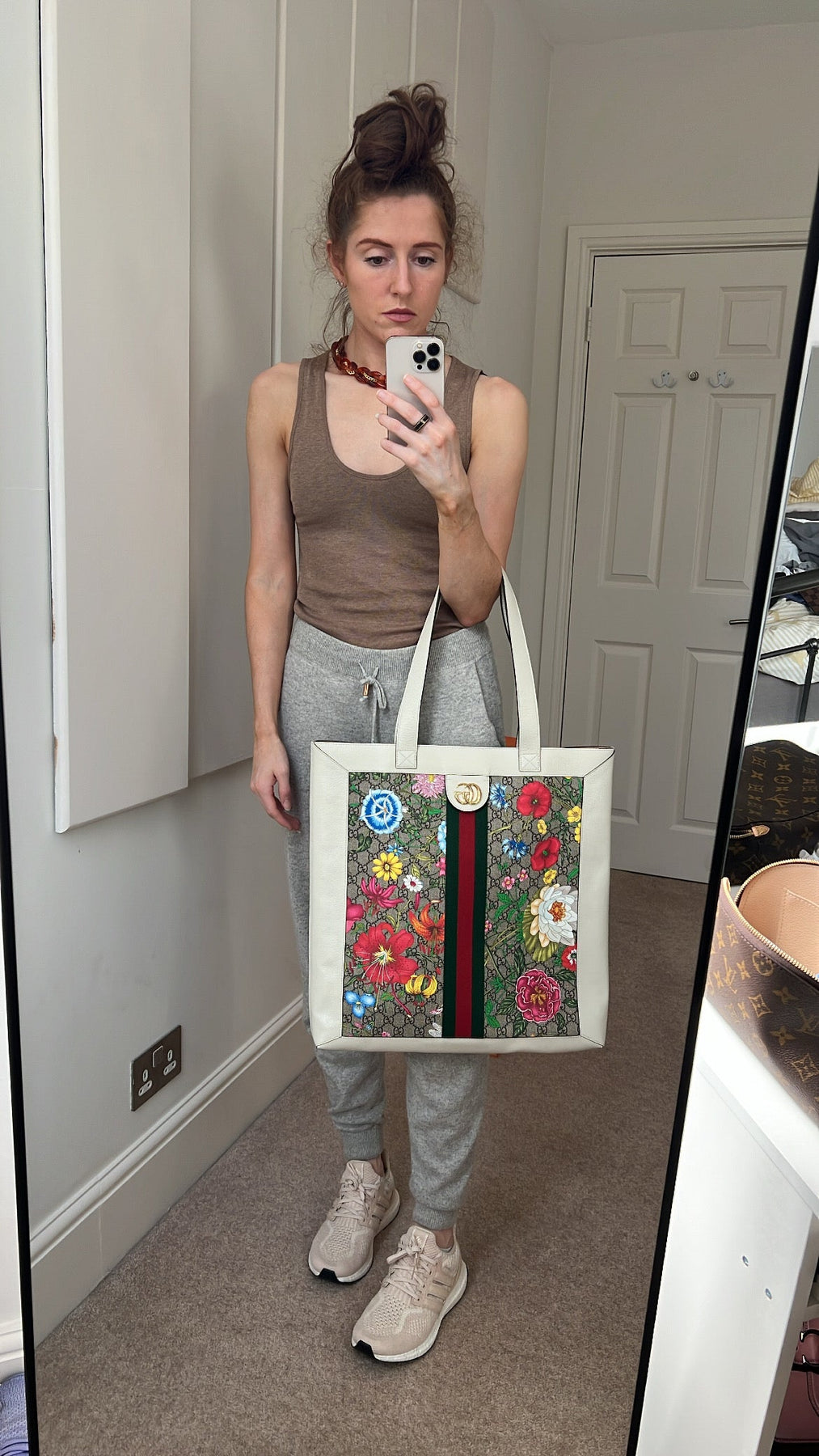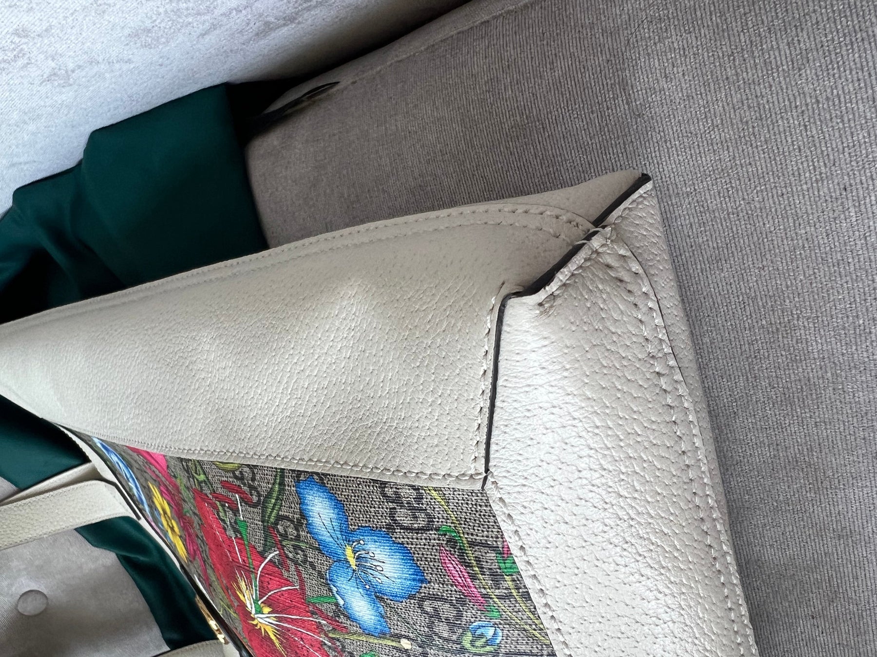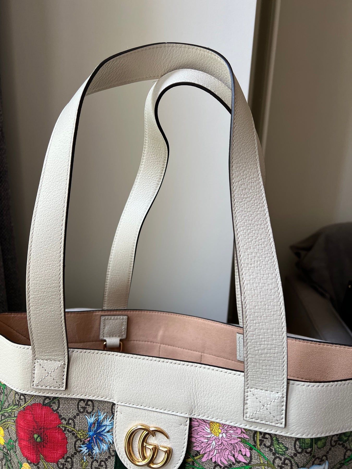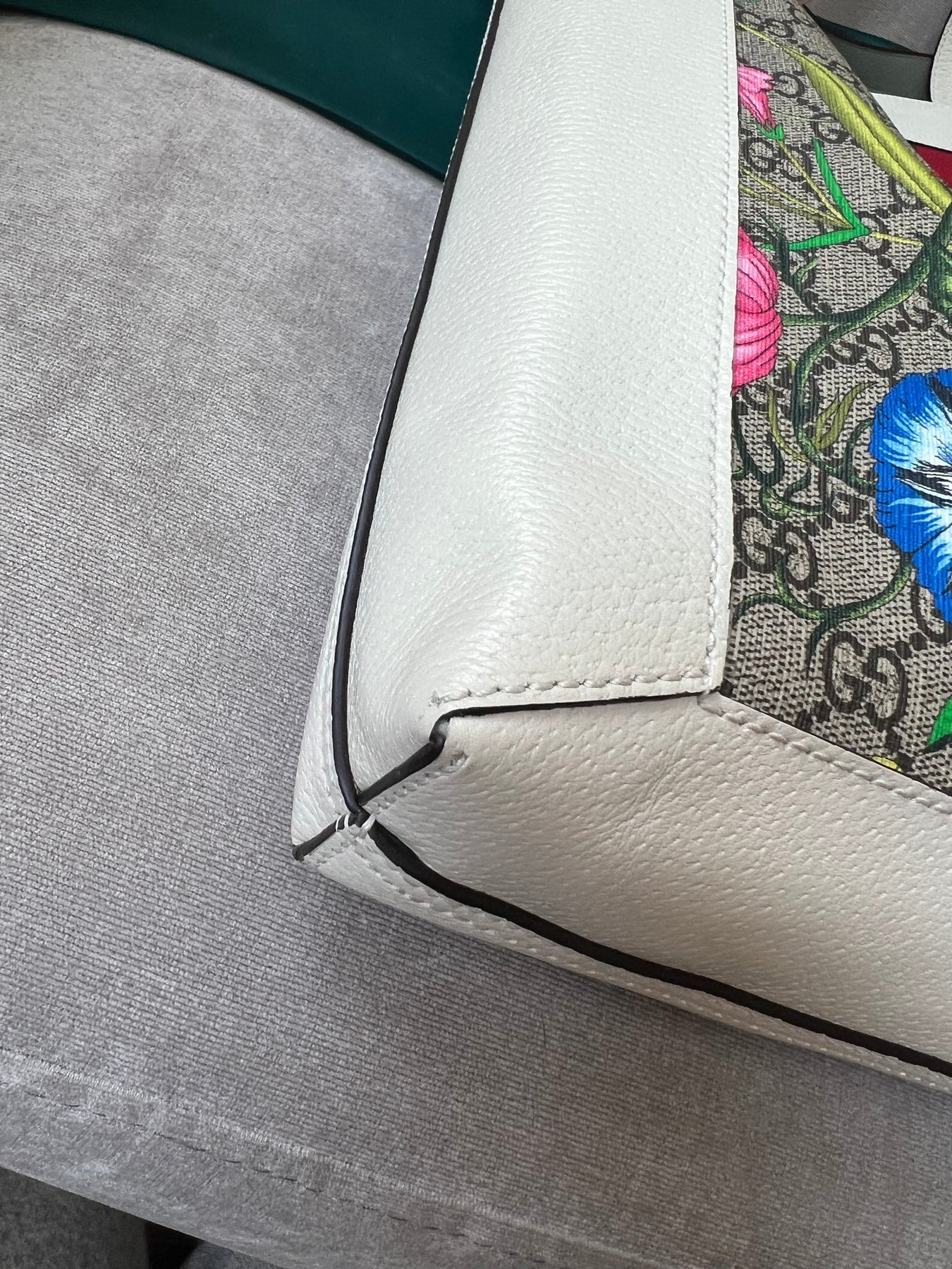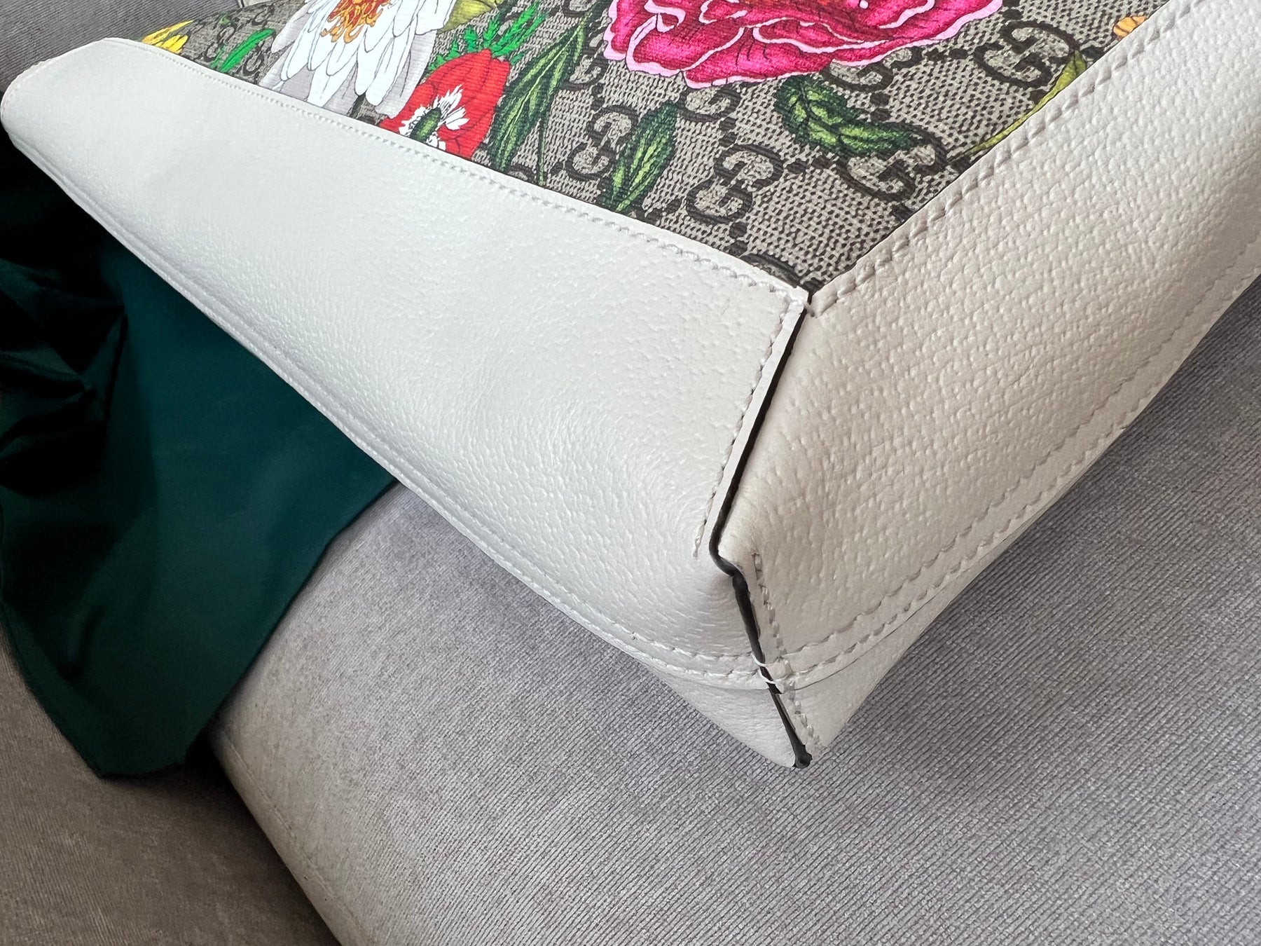 Gucci Flora Large Ophidia Shopping Bag in Canvas with floral print and white leather trim. Gold hardware. It features the gold metal GG logo on the front and green/red/green stripes on the front and back. It also features double top flat leather handles and open top. Perfect day to day bag for those who prefer a larger sized bag. Can be worn over shoulder or carried in hand.