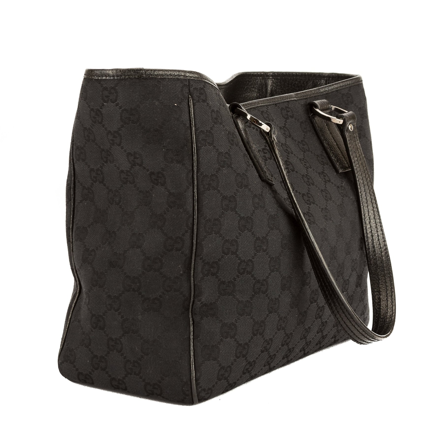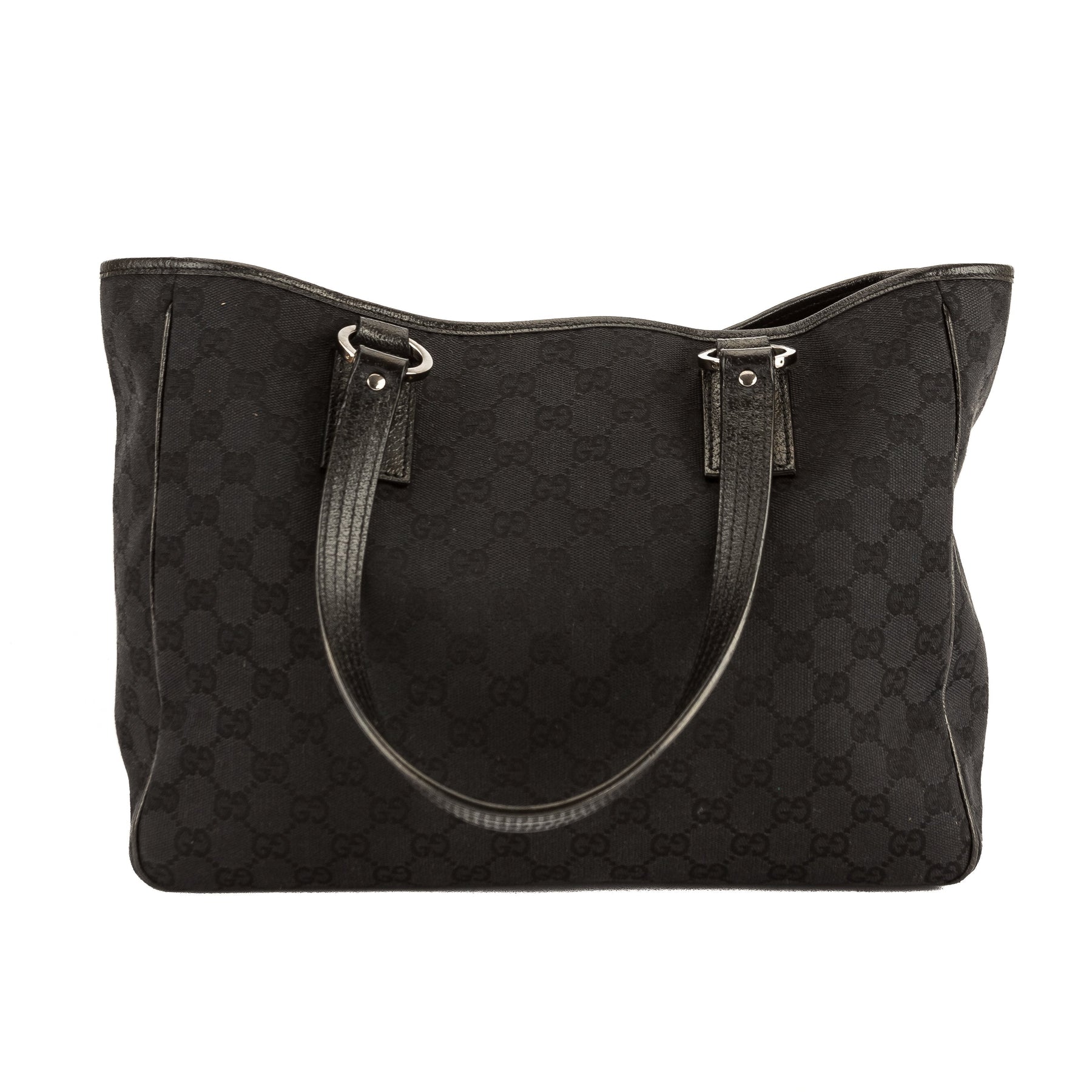 This is an authentic, pre-owned GUCCI GG Monogram Tote Bag. It's a chic medium-sized Gucci handbag for any occasion. It features a black GG Monogram canvas with a black leather trim, flat handles, ruthenium-tone hardware, and protective feet on the base. The interior has a textile lining with a zip pocket and room to carry your daily essentials. This item is in good condition, has minor scratches on the hardware and light signs of use on the interior. See photos for details. Pay close attention to sizes and measurements.