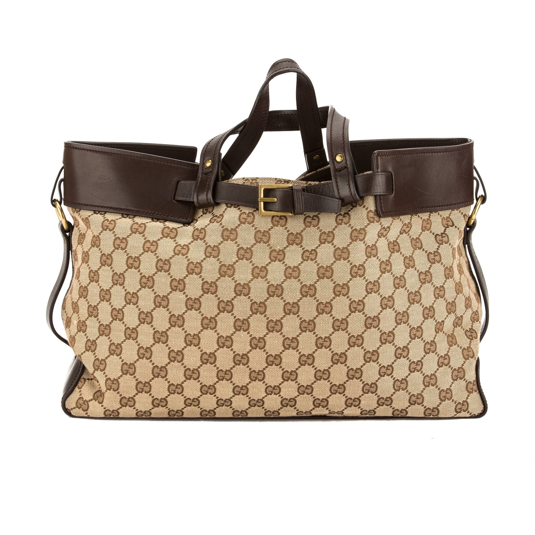 This is an authentic GUCCI GG Monogram Tote Bag. It's a vintage Gucci tote for every day. It features the GG Monogram canvas with a dark brown leather trim, flat handles, buckle details, and golden brass hardware. The interior has a textile lining with a zip pocket and plenty of room for your daily essentials. Made in Italy.