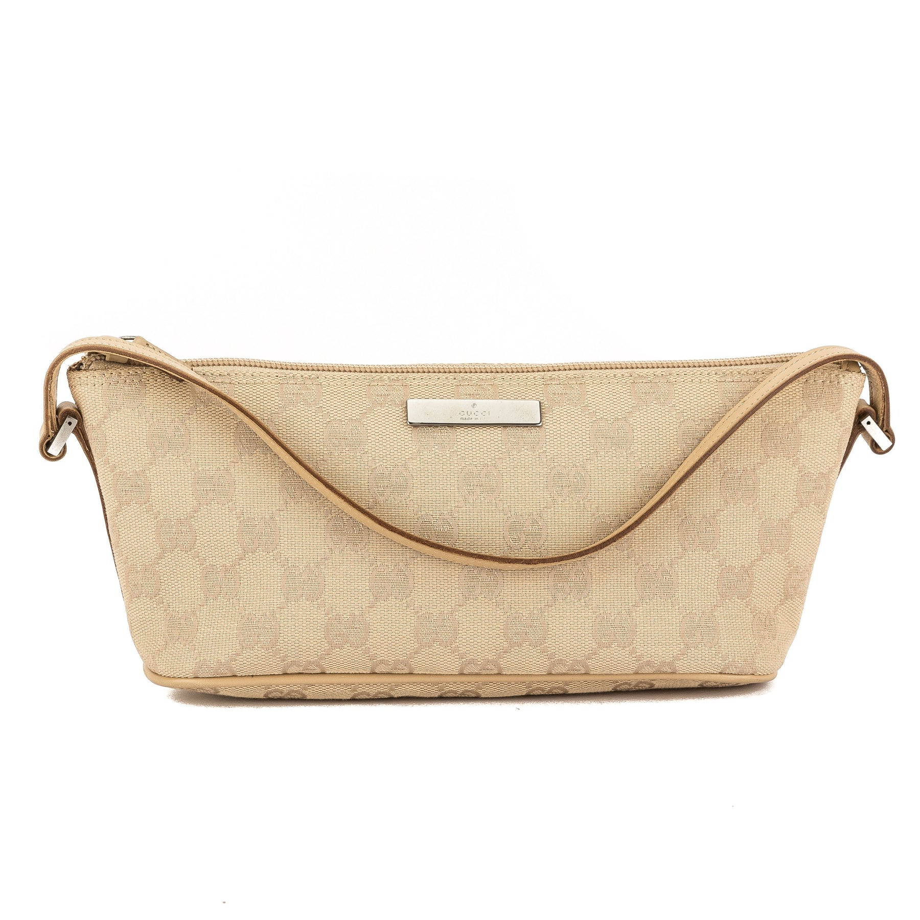 This is an authentic GUCCI GG Monogram Pochette Cosmetic Bag. It's a Gucci pochette bag for any occasion or use. It features nude GG Monogram canvas with a nude leather trim, a slim strap, ruthenium-tone hardware, and an engraved nameplate. The interior has a brown twill lining and a zip closure. It's a petite handbag with space for your necessities or cosmetics. Own it today! Made in Italy.