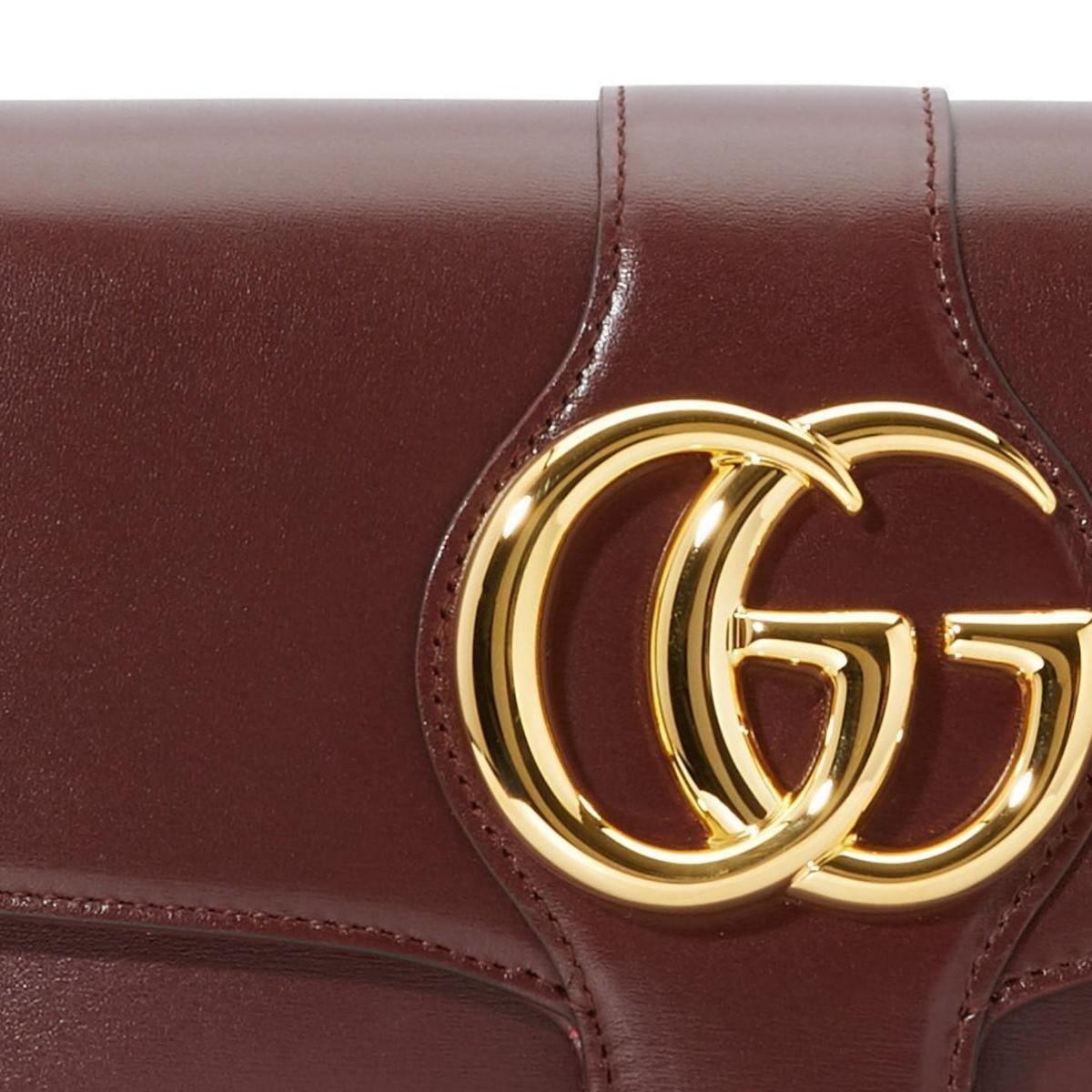 Burgundy leather viscose lining gold-toned double g metal hardware two gussets interior zip pocket adjustable strap with 21 drop magnet closure