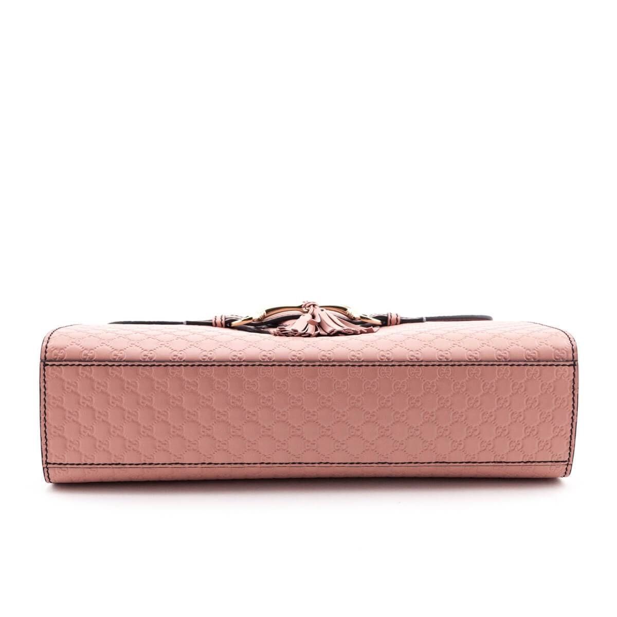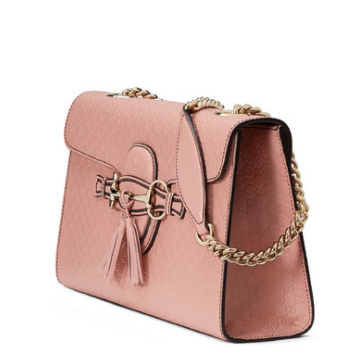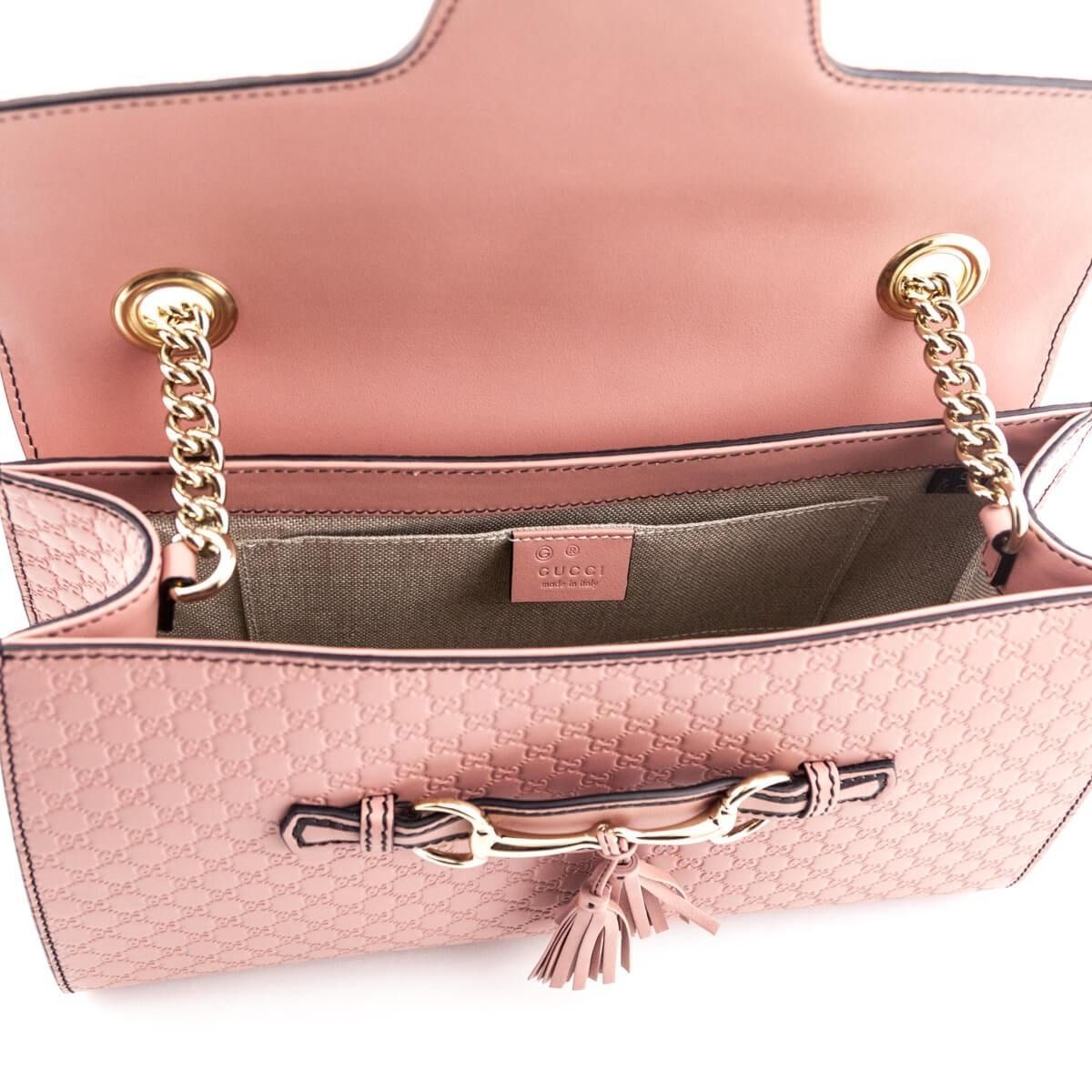 This chic shoulder bag is crafted of fine Gucci GG mini monogram embossed calfskin leather in light mauve. The bag features a polished light gold chain link and leather padded shoulder strap and a horse bit embellishment in polished light gold that compliments the front of the bag. The front flap opens to a spacious natural fiber interior with patch pockets. This is an exquisite bag with superb craftsmanship and iconic style only from Gucci!