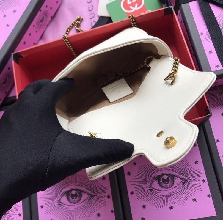 The small GG Marmont chain shoulder bag has a softly structured shape and an oversized flap closure with Double G hardware. The sliding chain strap can be worn multiple ways, changing between a shoulder and a top handle bag. Made in matelassé chevron leather with a heart on the back.