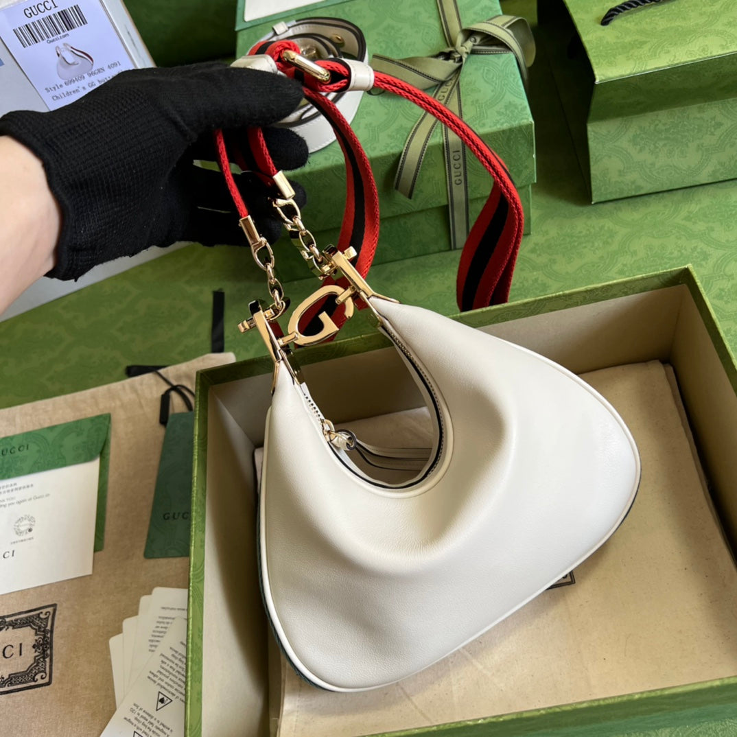 An ode to the timeless Hollywood glamour that shaped Gucci Love Parade, classic elements from the House's archives are reintroduced. Distinguished by its crescent moon shape, the accessory is further defined by a G shaped hook closure. Paired with soft materials, the heritage hardware creates a refined design with vintage appeal. This large version is crafted in white leather with green and yellow Web trim.