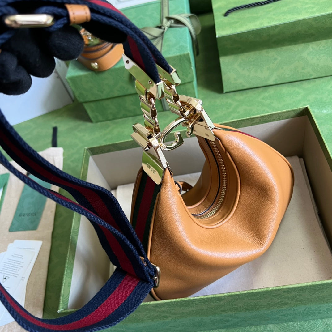 An ode to the timeless Hollywood glamour that shaped Gucci Love Parade, classic elements from the House's archives are reintroduced. Distinguished by its crescent moon shape, the accessory is further defined by a G shaped hook closure. Paired with soft materials, the heritage hardware creates a refined design with vintage appeal. This large version is crafted in dark orange leather with green and red Web trim.