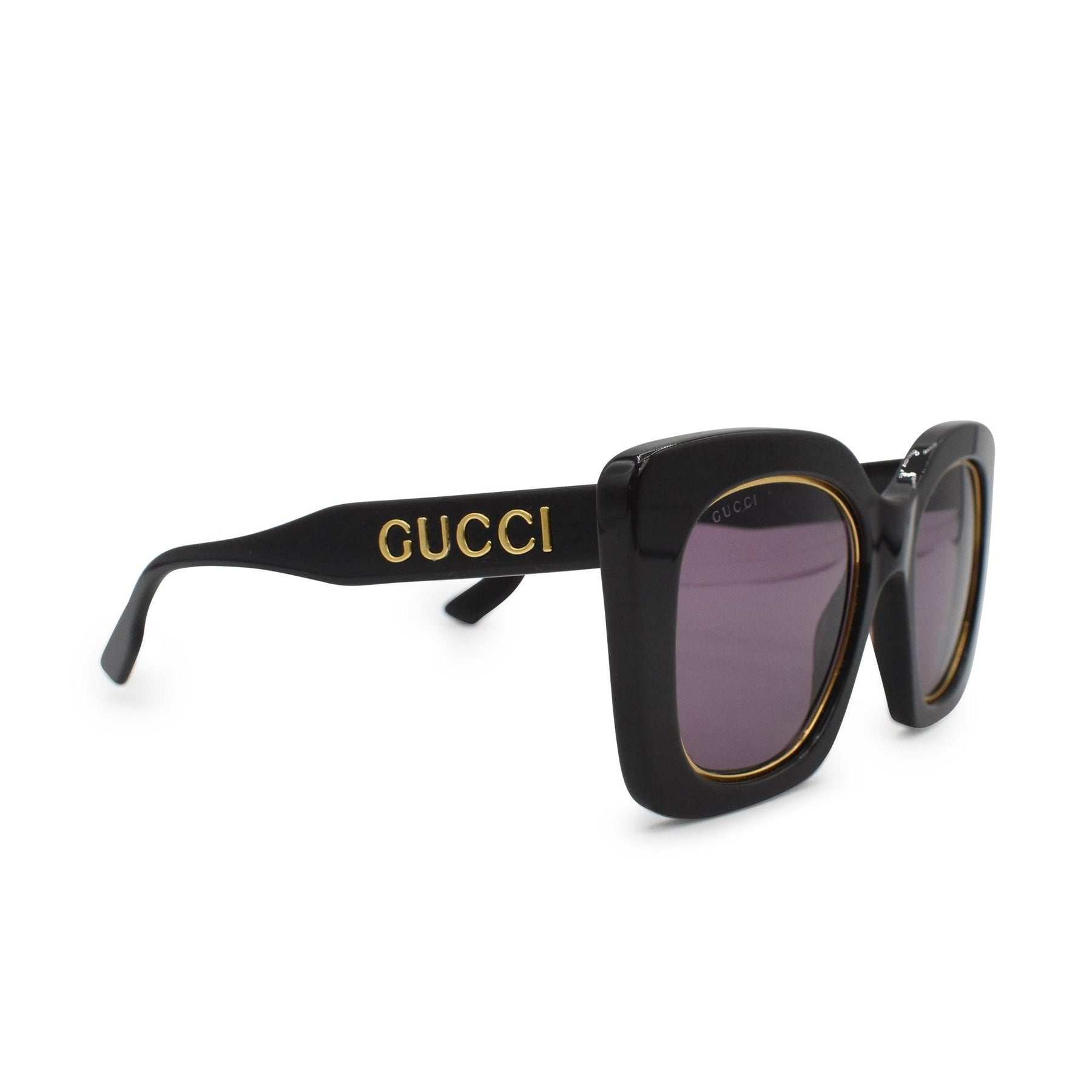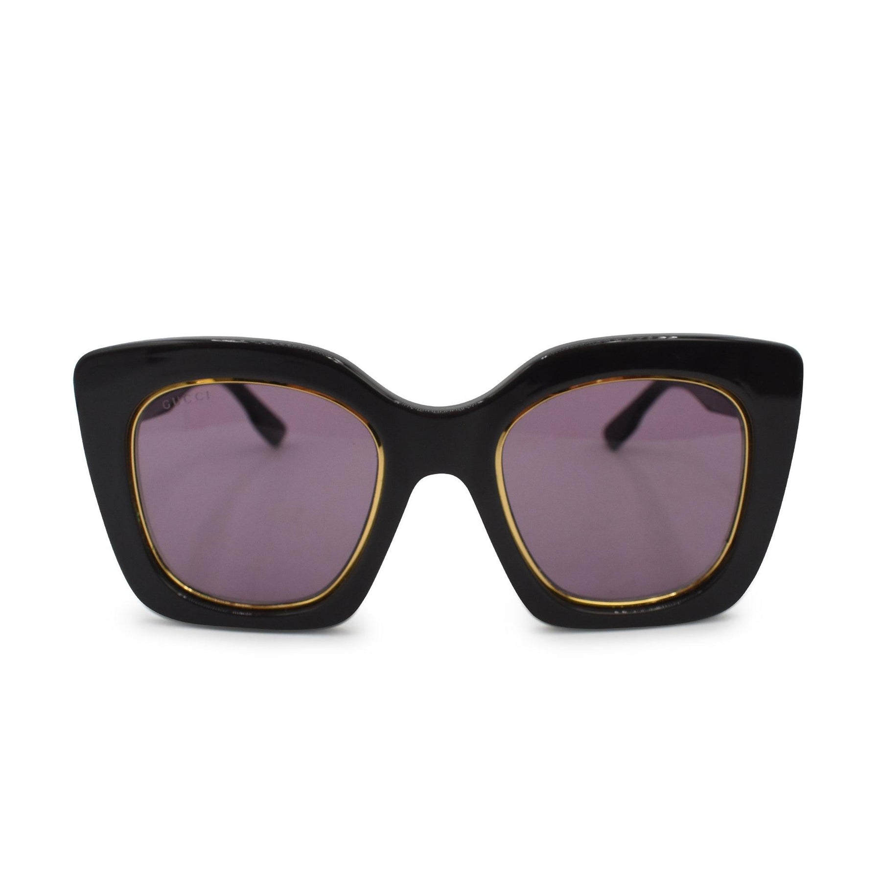 Gucci oversized wayfarer sunglasses in brown turquoise acetate with purple lenses and a gold trim detail. Features logo on arms.
