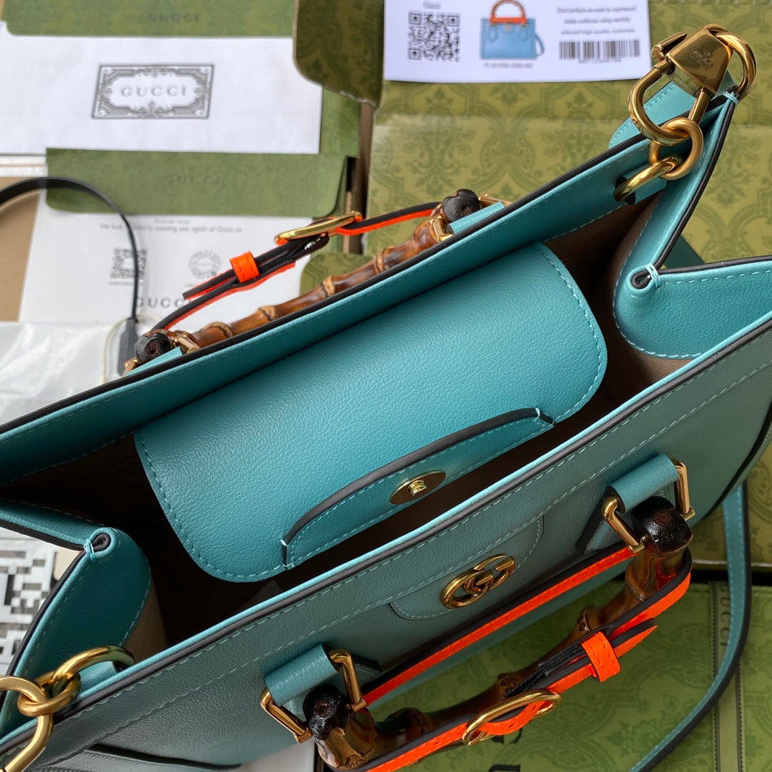 Combining recognizable elements of the House, the medium-sized tote bag is defined by its bamboo handles and Double G hardware. Crafted from light blue leather, the accessory is further accentuated by two neon bands, a playful reference to the bands used to keep handles in shape.