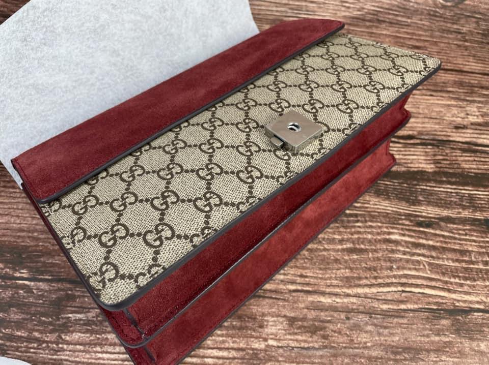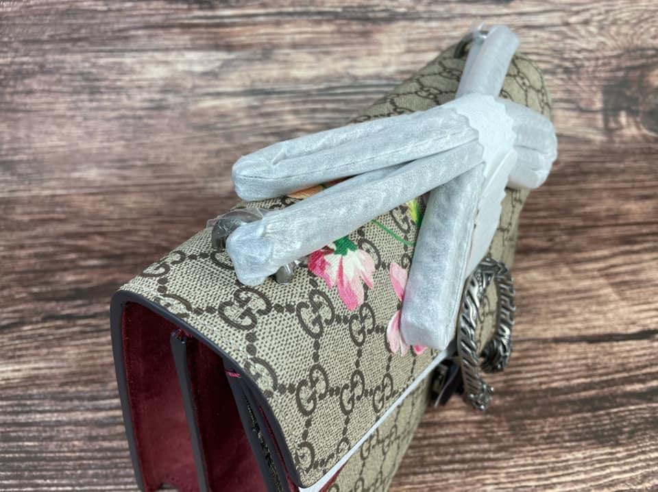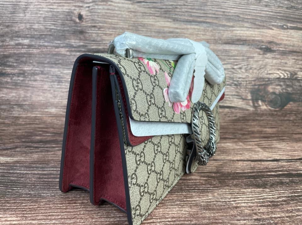 - Blooms print GG Supreme canvas, a material with low environmental impact, with antique rose suede detail