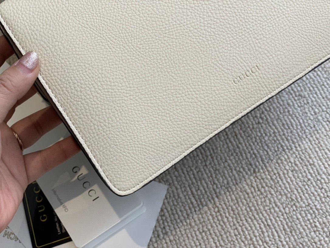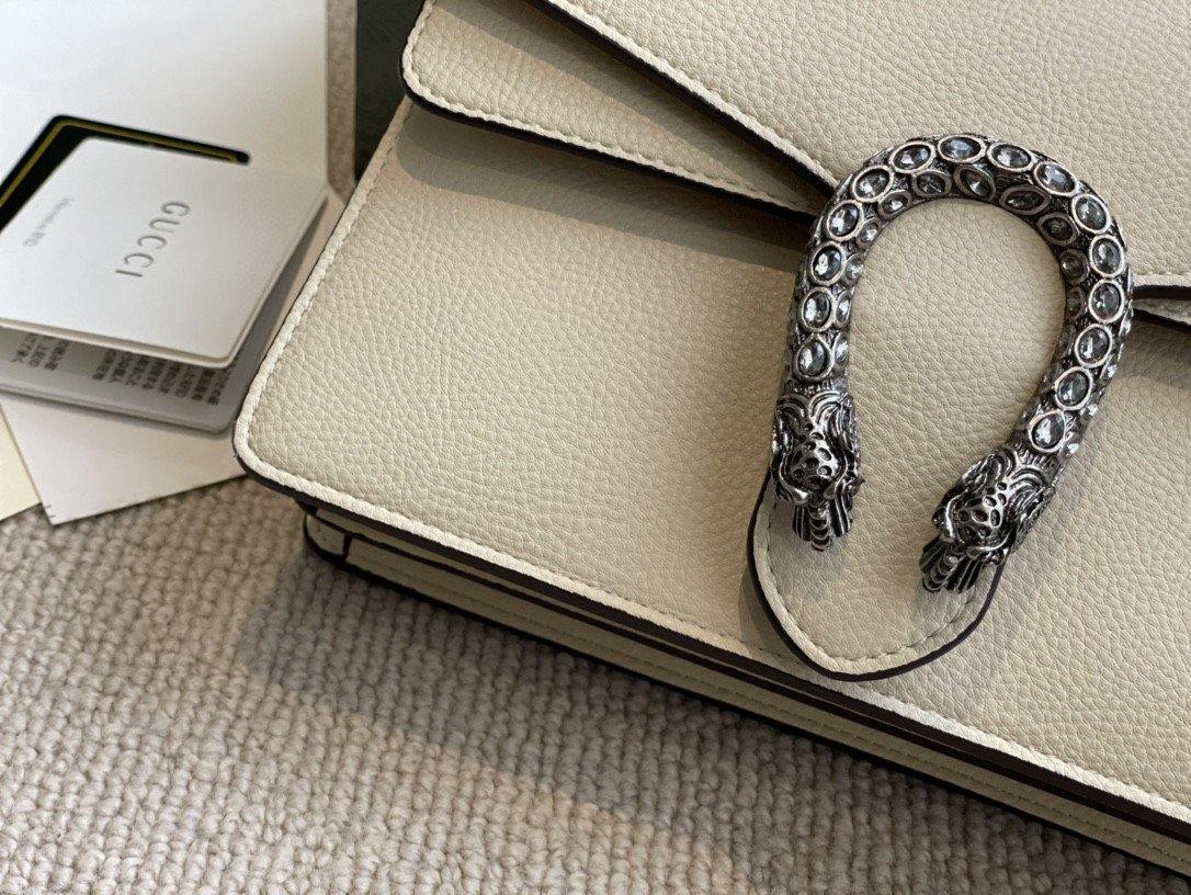 The Dionysus shoulder bag is presented in a white leather. The now defining tiger head closure—a unique detail referencing the Greek god Dionysus, who in myth is said to have crossed the river Tigris on a tiger sent to him by Zeus—is further enhanced with electric blue enamel. The sliding chain strap can be worn multiple ways, changing between a shoulder and a top handle bag.