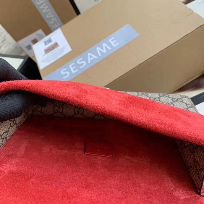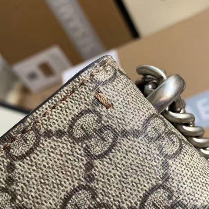 structured GG Supreme canvas bag with our textured tiger head closure-a unique detail referencing the Greek god Dionysus, who in myth is said to have crossed the river Tigris on a tiger sent to him by Zeus. The sliding chain strap can be worn multiple ways, changing between a shoulder and a top handle bag.