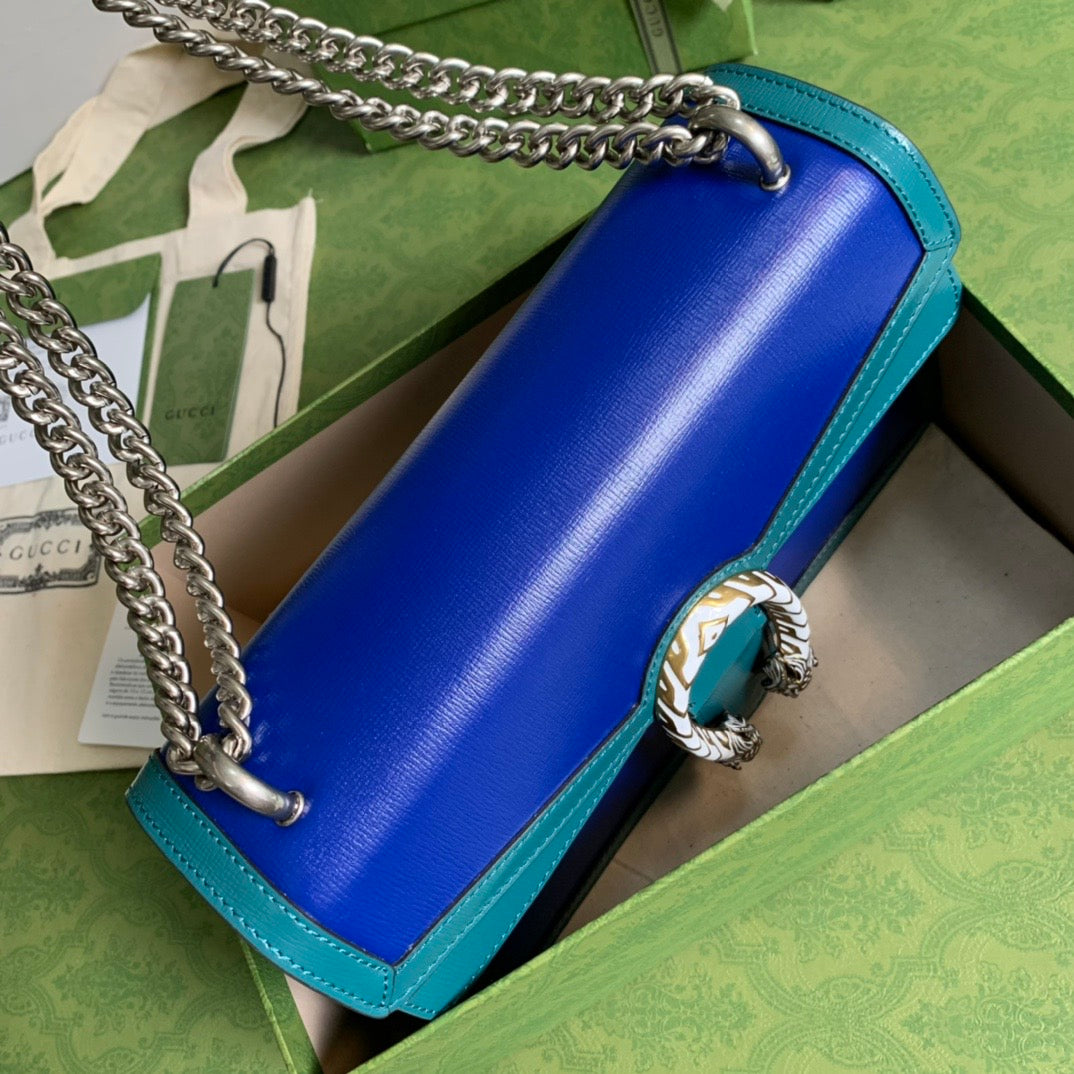 Signature styles from the Beloved lines are presented in vibrant colors that recall precious gems. Here the Dionysus is introduced in sapphire toned blue leather with a gold-toned take on its emblematic tiger head closure. The textured hardware is further enhanced by shiny enamel