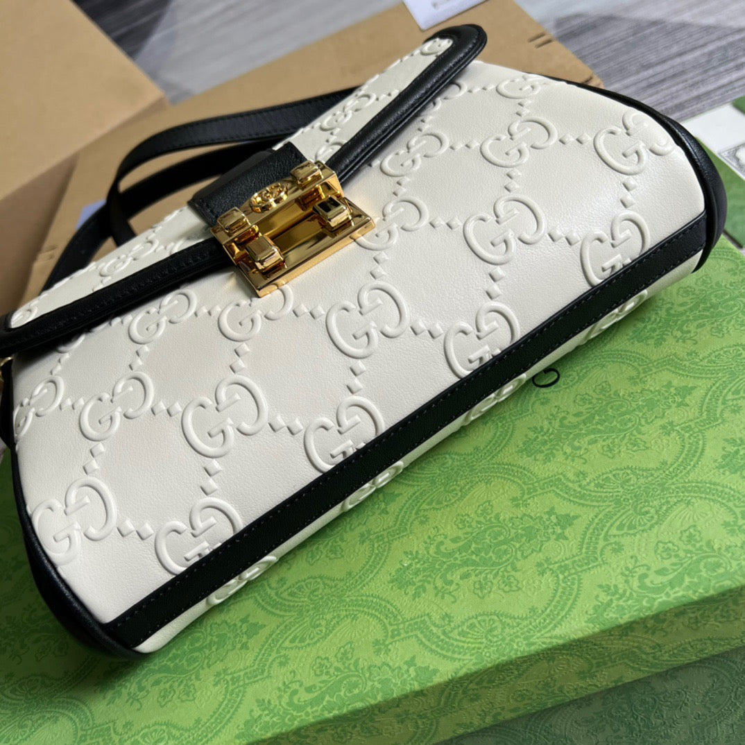 The GG motif is a subtle nod to the theme of reinvention that appears throughout the House's narrative. First used in the '70s, the monogram is an evolution of the Gucci Rhombi design—a pattern from the '30s' archives. A part of The Gucci Aria collection, it appears as an allover motif across this black and white shoulder bag.