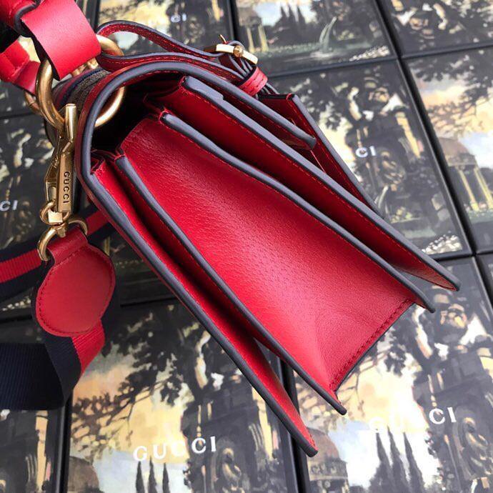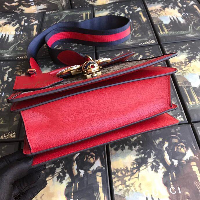 This stylish shoulder bag is crafted of Gucci GG supreme monogram coated canvas, with white calfskin leather trim. The bag features a rolled leather top handle, an optional red and navy web stripe shoulder strap, and an aged gold jewel and pearl-encrusted bee motif on the crossover flap. The bag opens with a press lock to a partitioned beige microfiber interior with zipper and patch pockets. This on-trend shoulder bag is suitable for any occasion, from Gucci!