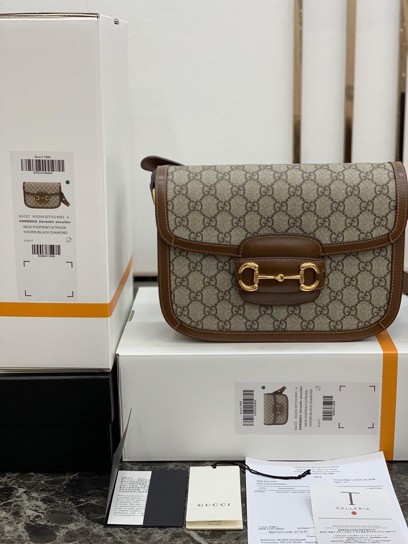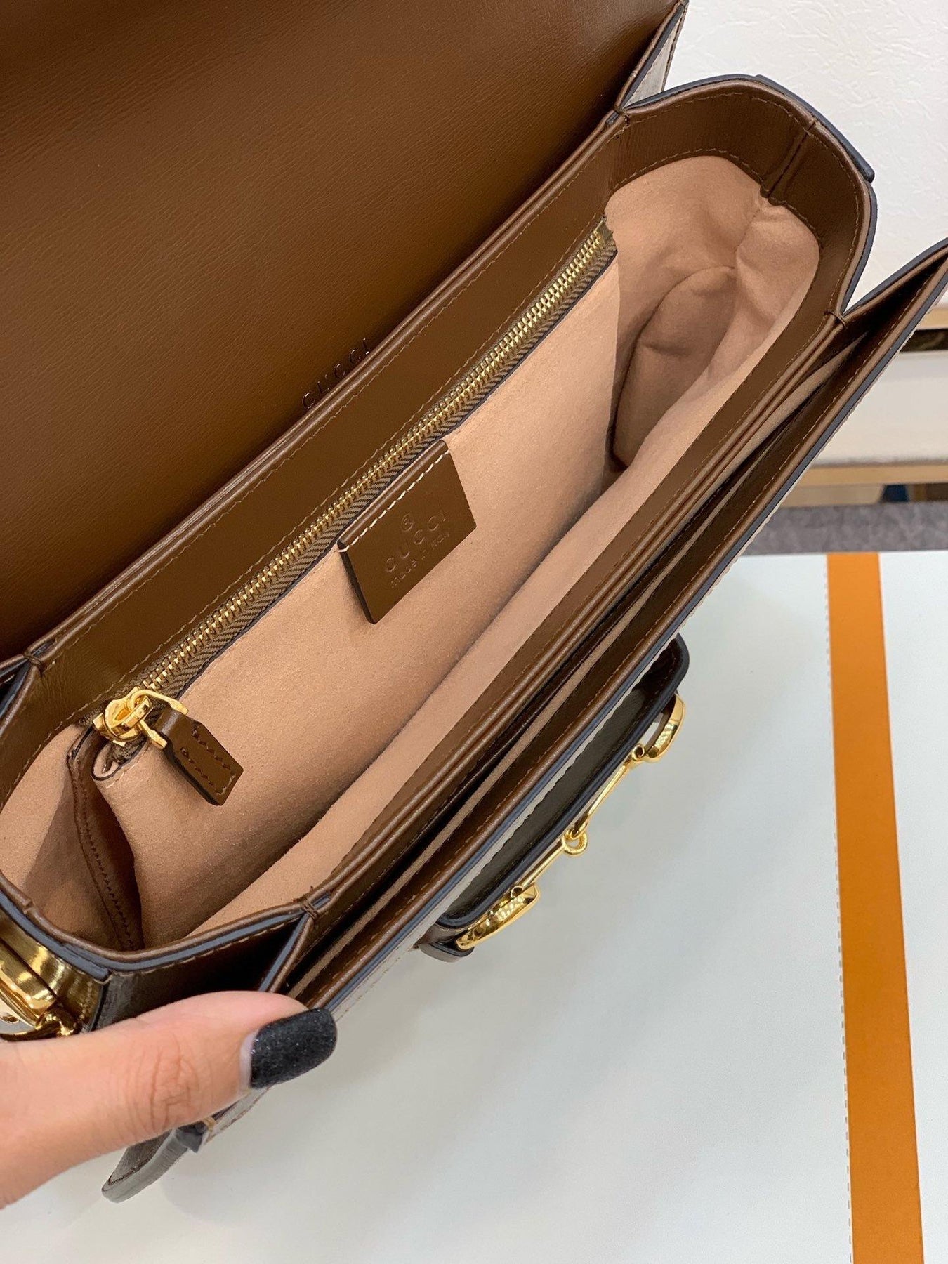 Petite versions of the Gucci Horsebit 1955 add a hybrid twist to the vintage inspired line. Enriched with two different shoulder straps, the mini bag’s character transforms from understated elegance with a tonal leather strap to a strong logo feel thanks to a red and green Web option. The accessory is presented in monogram canvas with a brown leather trim.