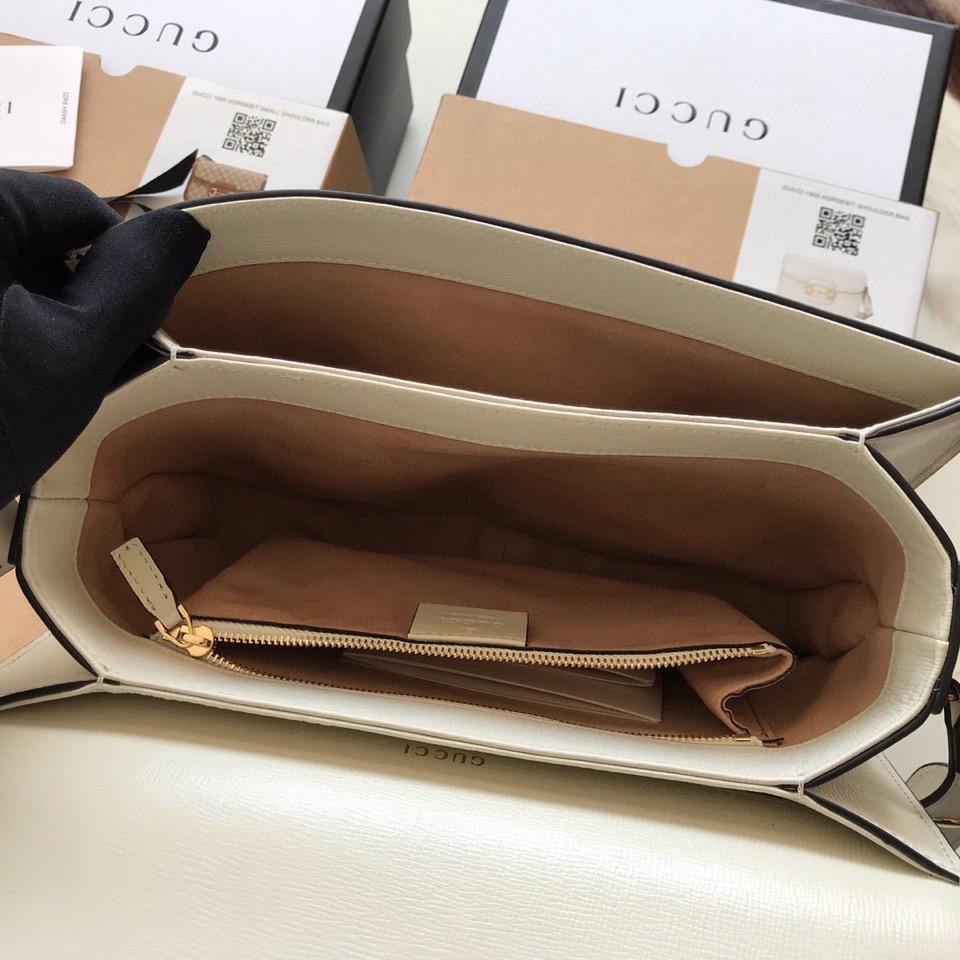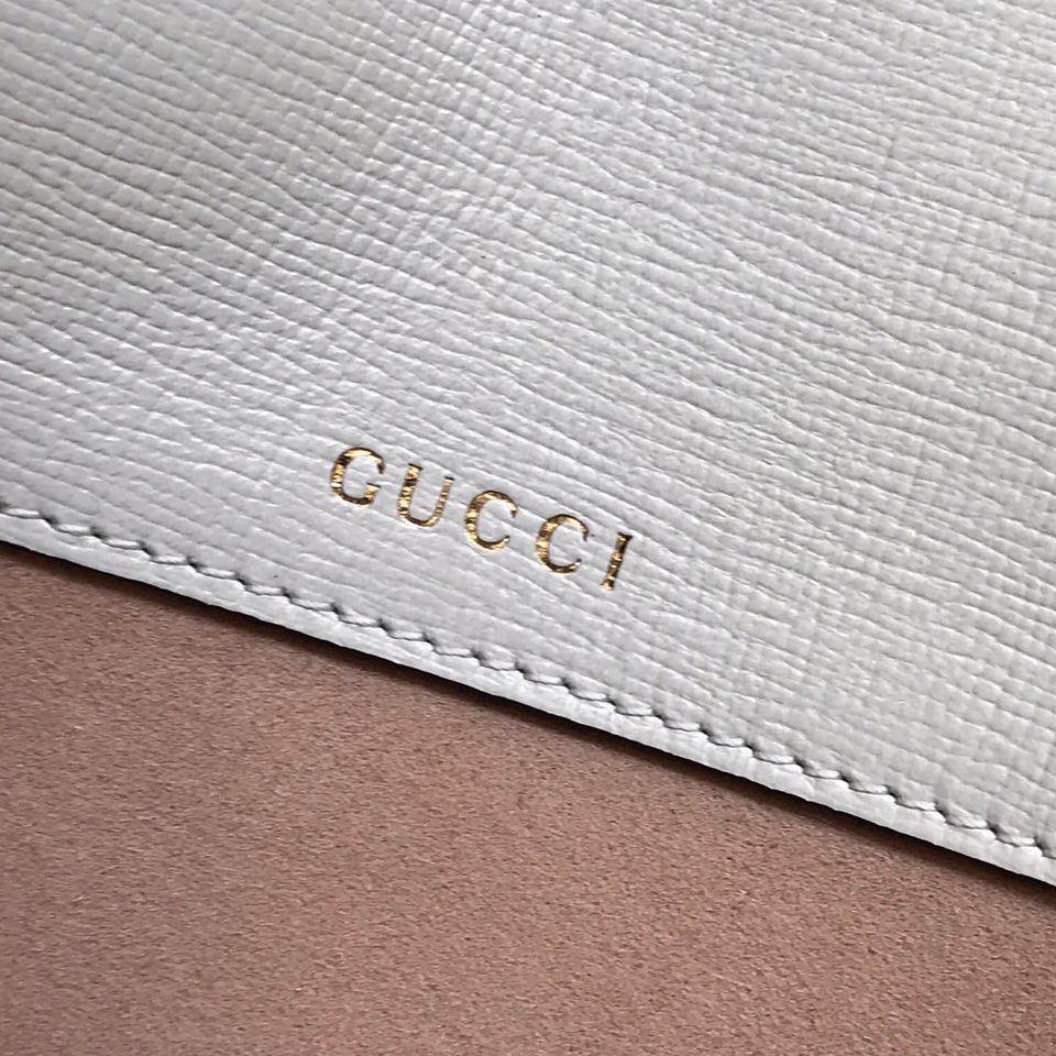 Petite versions of the Gucci Horsebit 1955 add a hybrid twist to the vintage inspired line. Enriched with two different shoulder straps, the white leather mini bag’s character transforms from understated elegance with a tonal leather strap to a strong logo feel thanks to a red and green Web option.