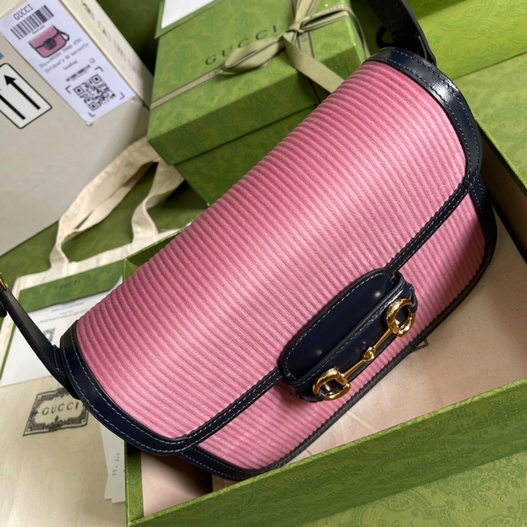 Recreated from an archival design, the Gucci Horsebit 1955 bag is introduced in pink corduroy with a contrasting blue leather trim. With the same lines and forms first introduced over six decades ago, the accessory unifies the original details with a modern spirit, highlighting the Horsebit. The small flap shoulder bag is completed with a special mechanism that adjusts the length of the shoulder strap so it can be carried on one shoulder or cross body.