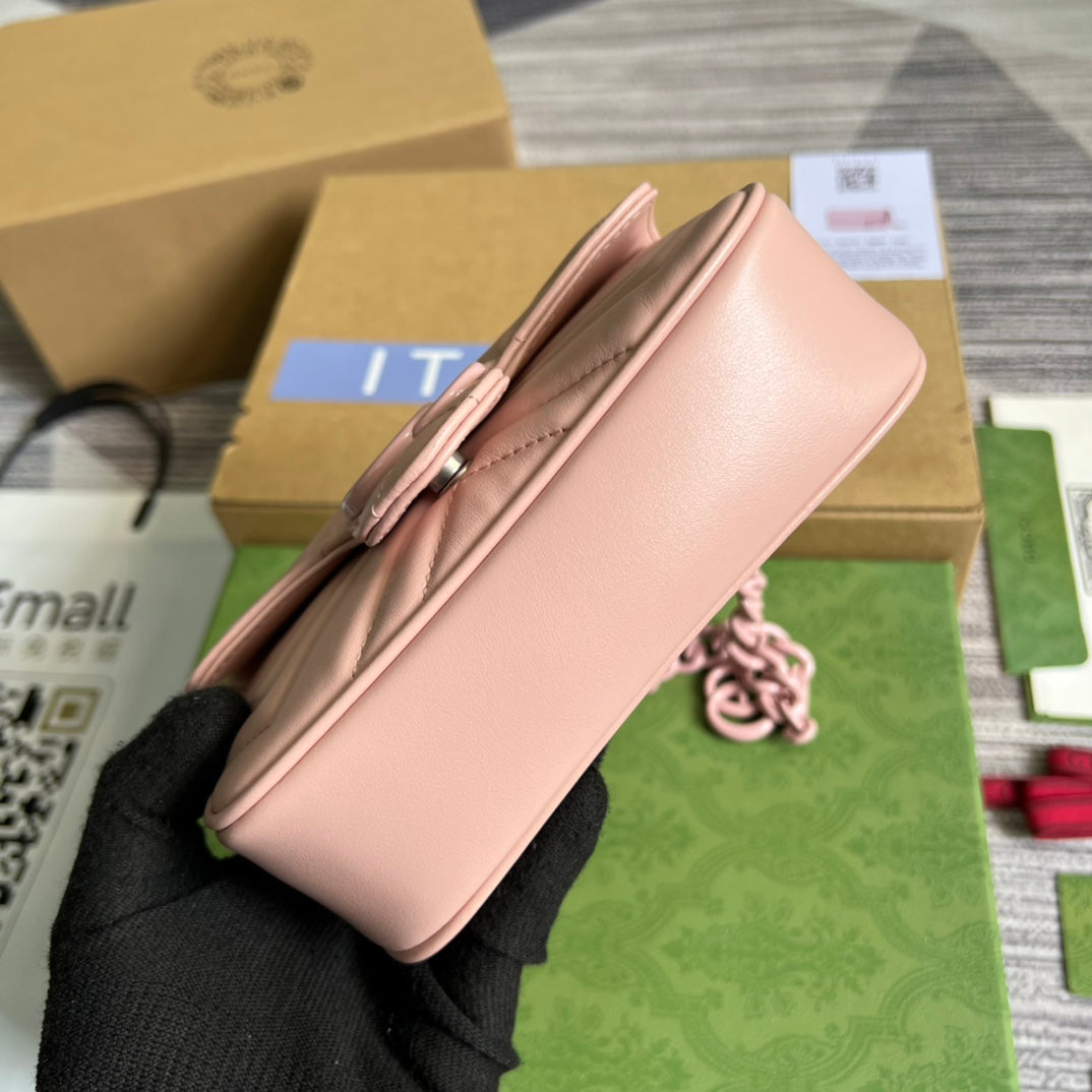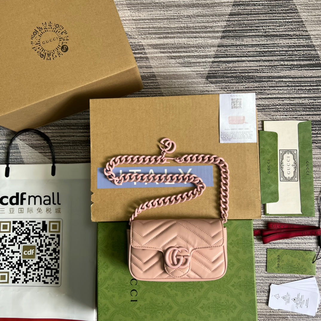 Accessories continue to come to the fore of the Creative Director's collections. A distinctly contemporary accessory, the belt bag is presented in new ways throughout the Gucci narrative, emphasizing different elements of the versatile style. Here, it is introduced as part of the GG Marmont universe in black chevron matelassé leather with a chain strap