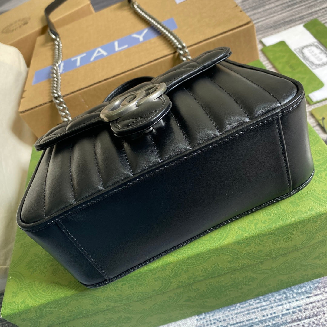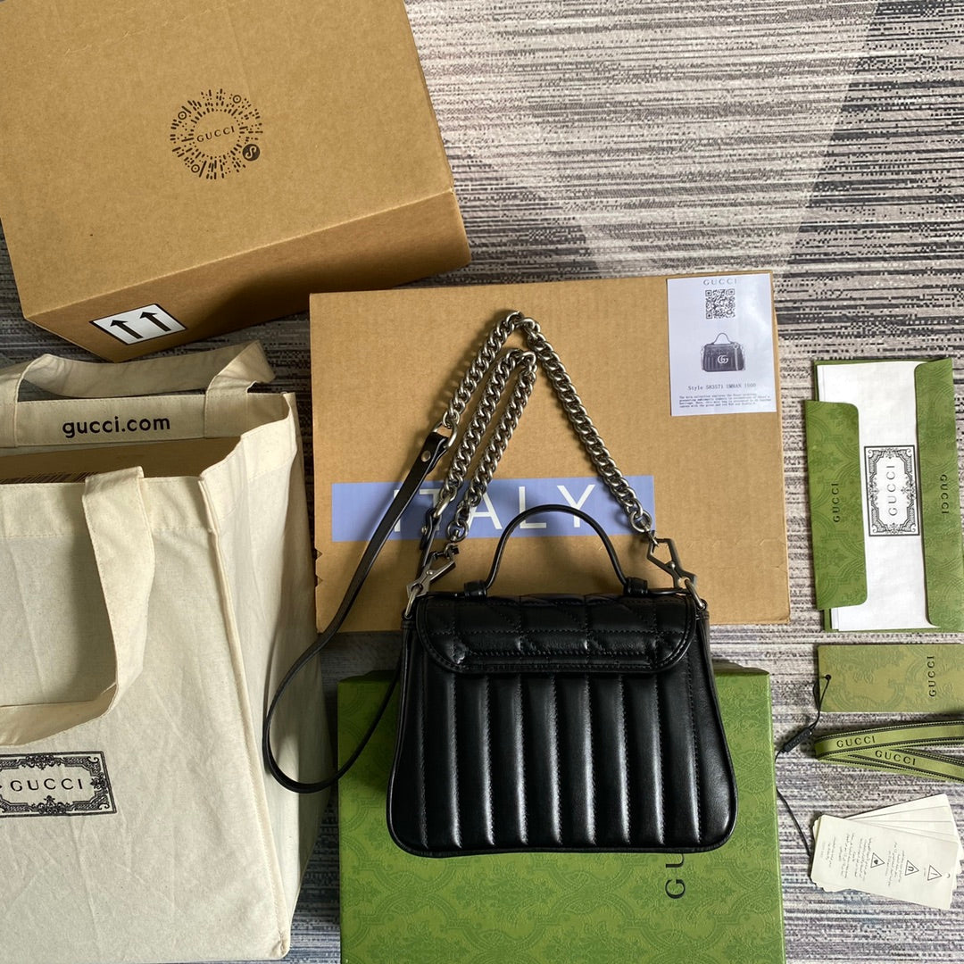 Gucci Aria explores the House's archives, telling Gucci's story though a mix of archival and contemporary elements. The GG Marmont was introduced in one of the Creative Director's first fashion shows and each season its design evolves through the lens of the latest collection. Here, the mini bag is presented in dark grey matelassé leather with antique silver-toned hardware.