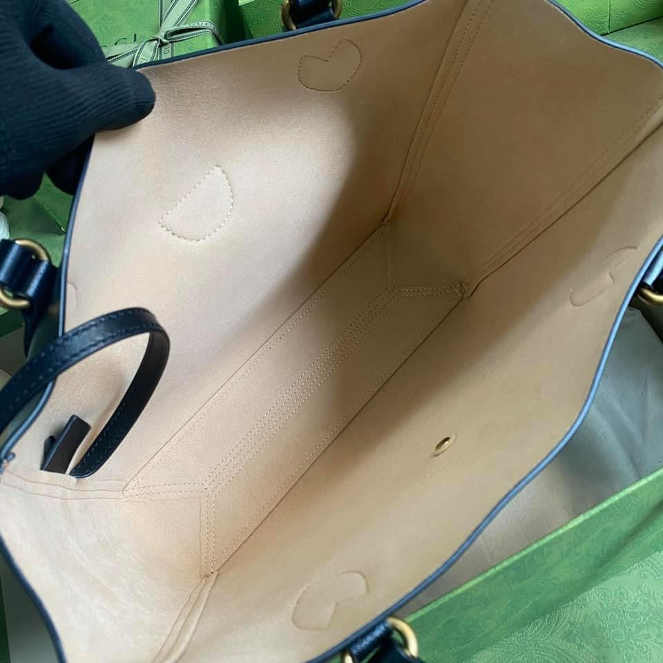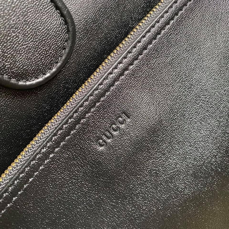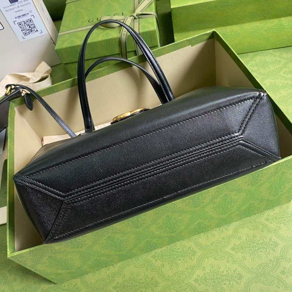 First introduced in the '70s, the Double G decorates a softly structured leather tote bag. A favorite decade of the Creative Director, details from this time add a retro appeal throughout the Epilogue collection. Introduced in black leather, the style is enhanced by the addition of an internal pouch.