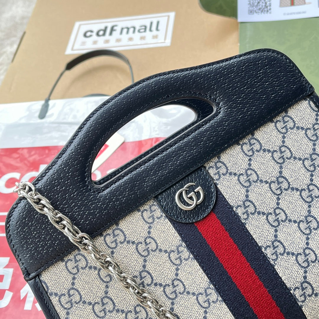 Colors tell a story throughout Gucci Love Parade. One of the House's most emblematic materials, the GG Supreme is inspired by an archival design from the '30s. Traditionally presented in beige and ebony, the canvas is presented in a beige and white combination as an ode to timeless pieces and everlasting design. Here, the pattern defines the Ophidia tote bag.