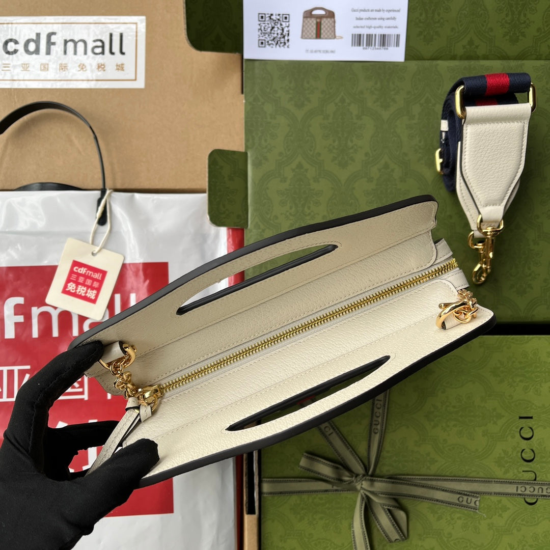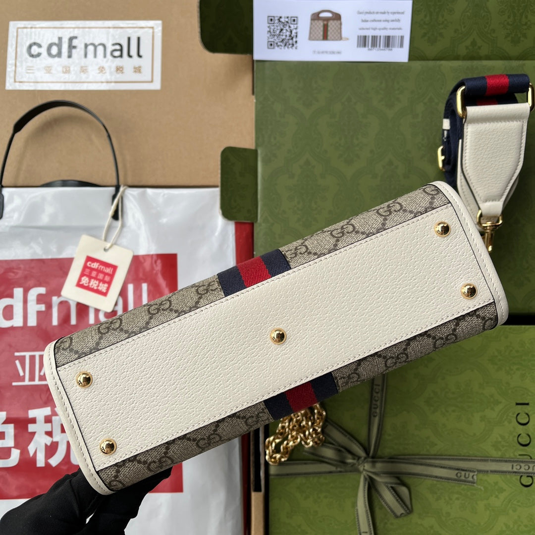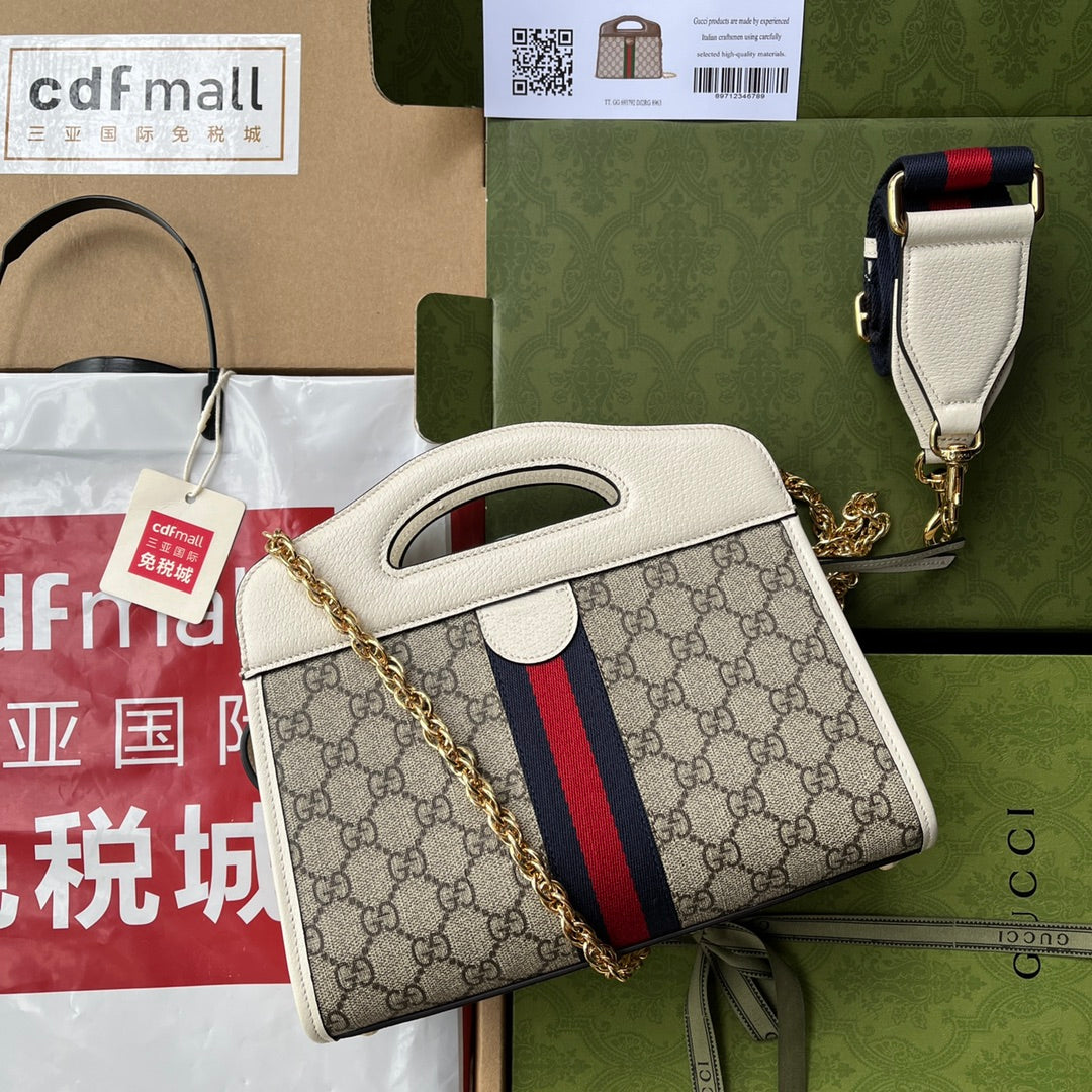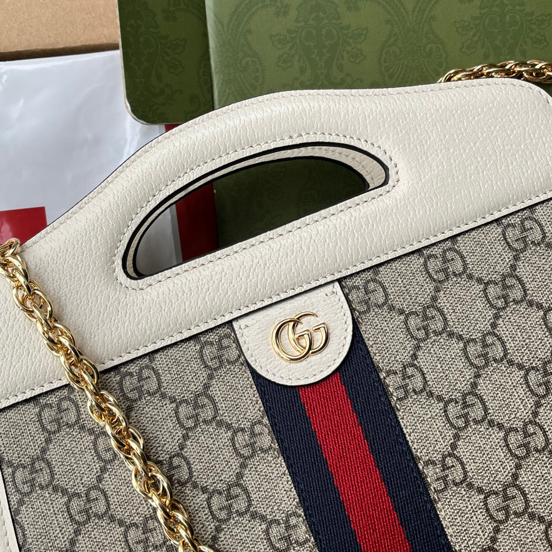 Colors tell a story throughout Gucci Love Parade. One of the House's most emblematic materials, the GG Supreme is inspired by an archival design from the '30s. Traditionally presented in beige and ebony, the canvas is presented in a beige and white combination as an ode to timeless pieces and everlasting design. Here, the pattern defines the Ophidia tote bag.