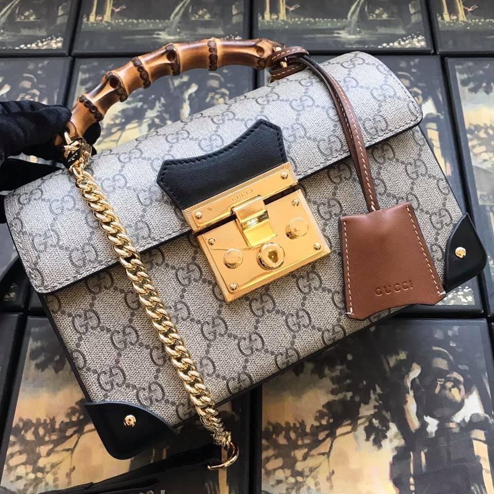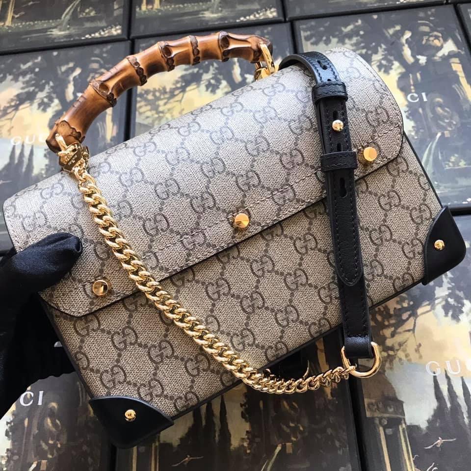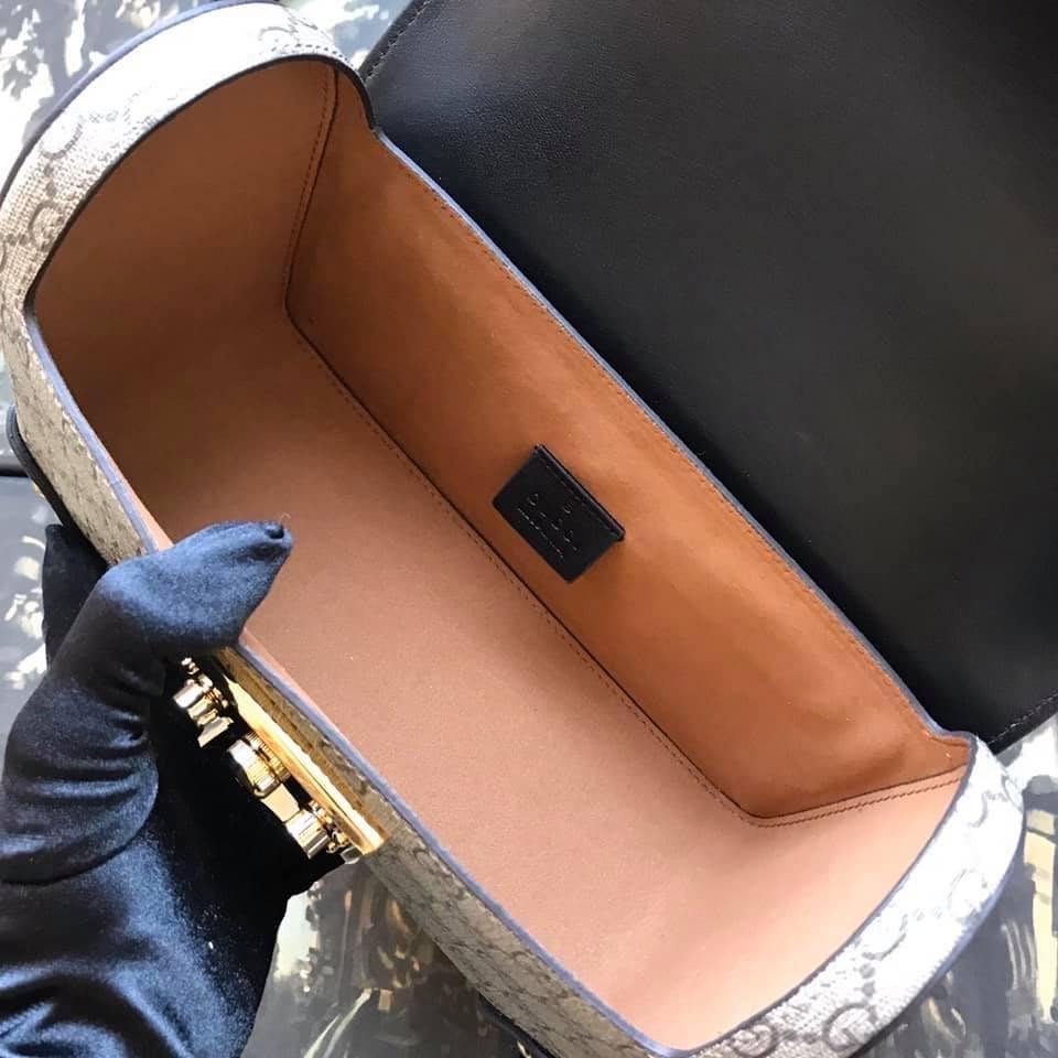 Archival details, including the bamboo handle and closure, combine in a modern silhouette in the small shoulder bag, crafted from GG Supreme canvas. The structured shape has a flap closure that locks with a key kept in a removable leather holder. The top handle shape is further enriched with a removable chain and leather shoulder strap.