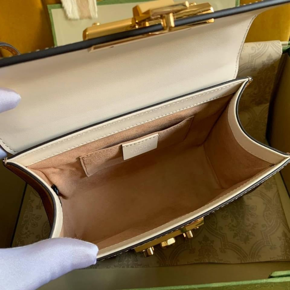 The Padlock's structured shape is presented in GG Supreme canvas with a white leather upper. Recalling the brand's origins in the world of leisure and luggage, the small shoulder bag is defined by its padlock closure.