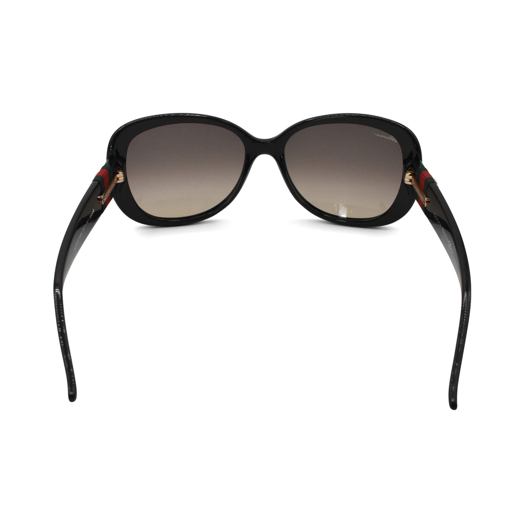 Gucci 'Web' sunglasses with black acetate frames with dark brown lenses. Features canvas red and green racing stripes on the arms, gold hardware 'GG' logos on the arms, and engraved logo on a lens.