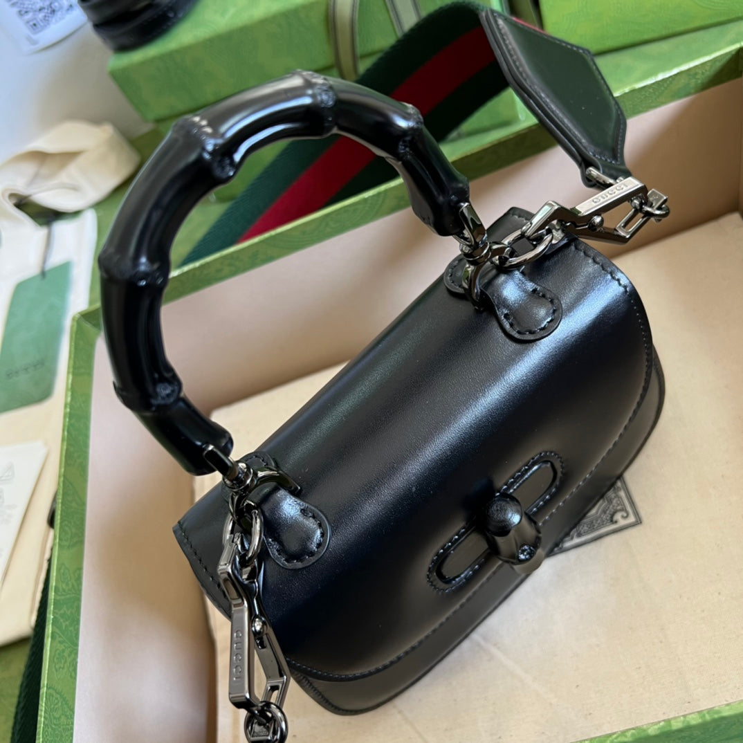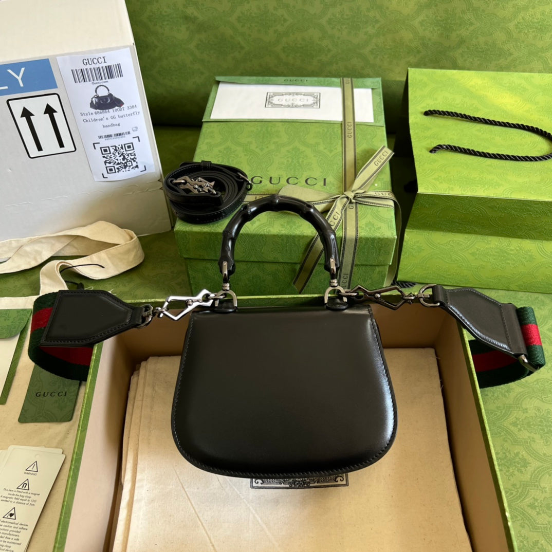 Heritage elements are reimagined with a contemporary twist throughout The Gucci Aria collection. An emblem of Gucci's origins, bamboo has appeared throughout the House's collections since the '40s. After over eight decades, the material is paired with black leather and two interchangeable shoulder straps atop this small bag—a smooth leather version enhances the style's classic feel while the Web stripe adds logo appeal.