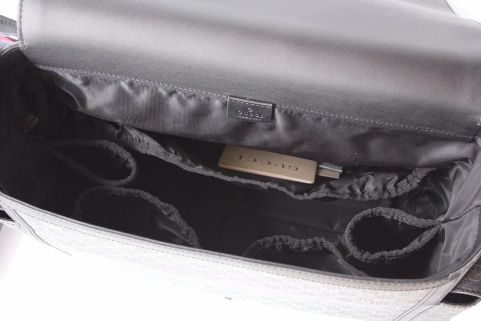 A diaper bag in black/grey GG Supreme canvas. First used in the 1970s, the GG logo was an evolution of the original Gucci rhombi design from the 1930s, and from then it's been an established symbol of Gucci's heritage. For Cruise 2018, the GG pattern has been brought back to the forefront in new combinations, paying homage to Gucci's roots. Complete with an adjustable Web shoulder strap and leather trims.