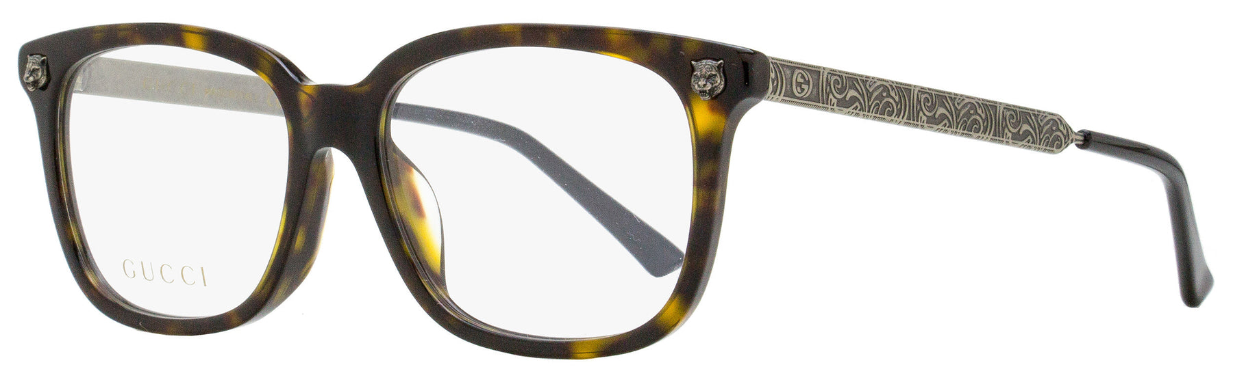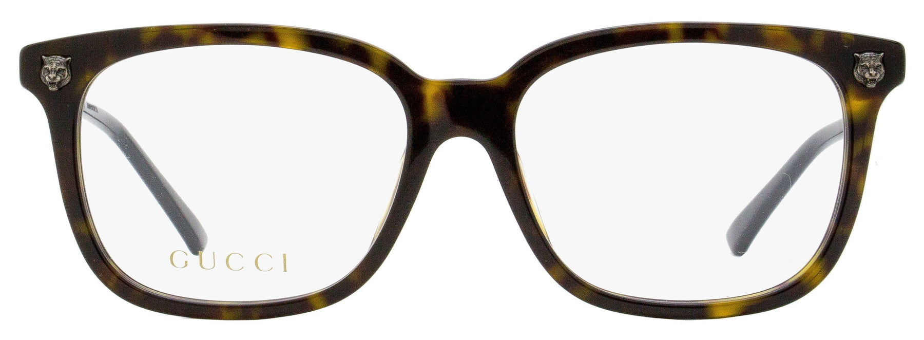 The Gucci GG0218 alternative fit optical frames feature a soft rectangular shape for women. The temples are adorned with handcrafted Gucci floral motifs and the iconic Tiger symbol on the front of the frame. This model offers adjustable nose pads to provide an Alternative Fit for those with a low nose bridge. Crafted of the highest quality materials, Gucci's world renowned brand and bold designs have made their Eyeglasses exceptionally desirable. Please note these eyeglasses are provided with Demo Lenses in order to demonstrate the final appearance of your frames. Please visit your local Optometrist or Optician to replace with optical quality lenses. Frame Material - Plastic (Acetate)/Metal Frame Color - Havana/Antique Gold Lens Color - N/A Size - 53-16-145 Made in Italy Includes original case and cloth