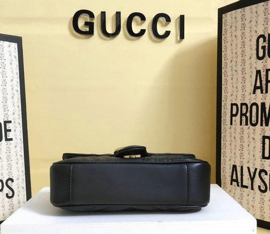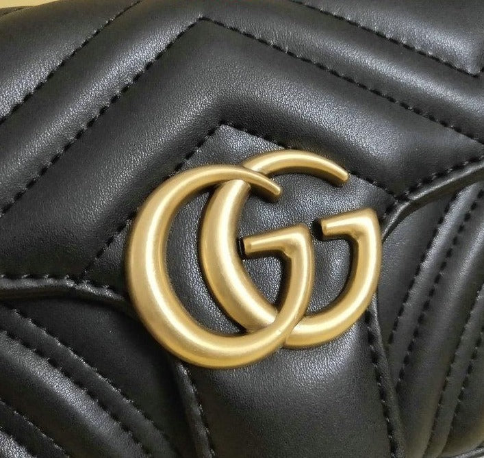 The small GG Marmont flap bag has a softly structured shape and an flap closure with Double G hardware. The sliding chain strap can be worn multiple ways, changing between a shoulder and a top handle bag. Made in matelassé chevron leather with a heart on the back.