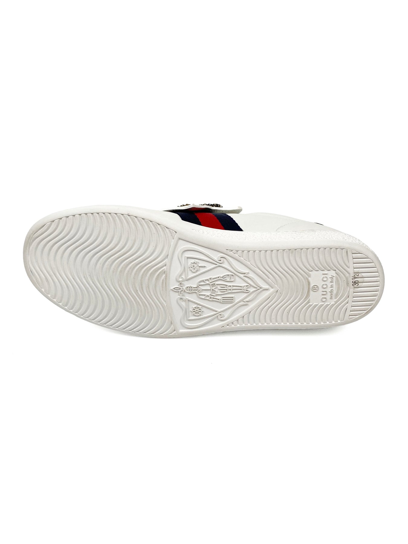 Description : Classic Gucci Ace sneakers glammed up with snake-embossed heels and crystal embellished bow shoelace patches. In pristine condition; un.