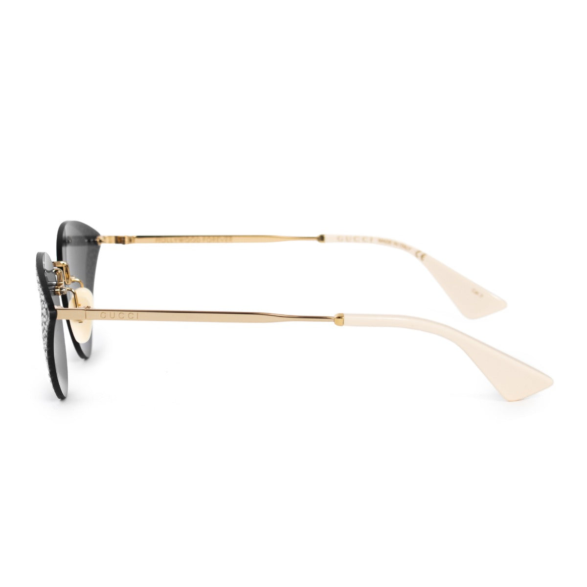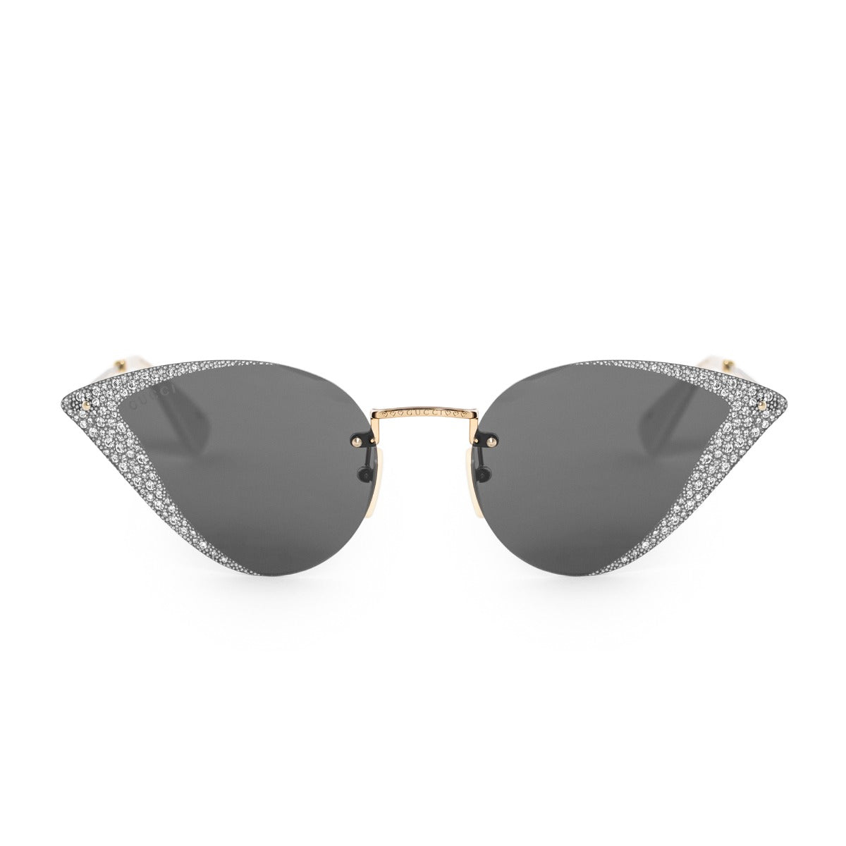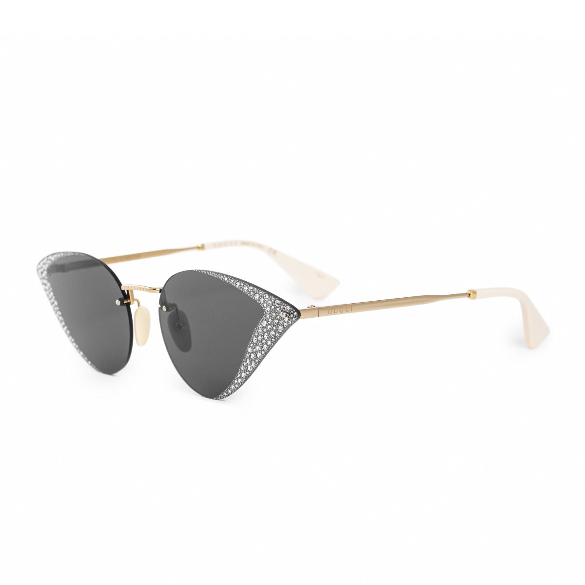 Here you can find your best deal on your designer luxury Gucci sunglasses. Watch your own fashion statement unfold before your eyes with these GG0898S cat eye sunglasses. These redefined cat are entirely crafted from gold-toned metal and showcase little diamondson the edge of the gray lense. Gucci's brand name signature is ingraved at the temples. Gray lenses offer 100% UV protection. These luxury sunglasses measure 64-19-140 mm and ship with the designer documents, a velvet hard case, available in a range of six jewel-toned colors and paired with a coordinating satin lining. The case color selection will be individually selected by a member of our team for each pair of glasses and comes with a matching satin flannel pouch and ivory microfiber cloth. Made in Italy.