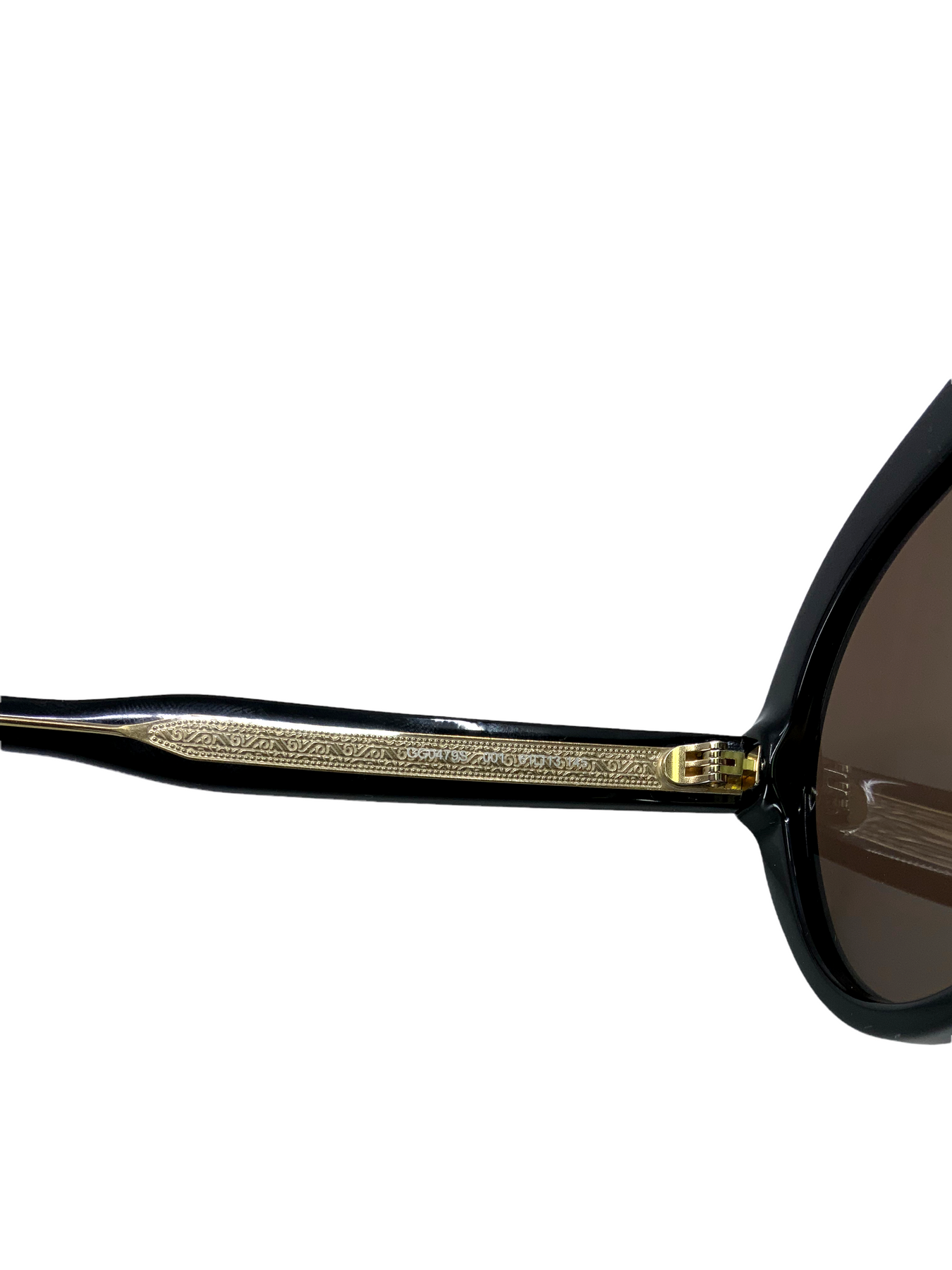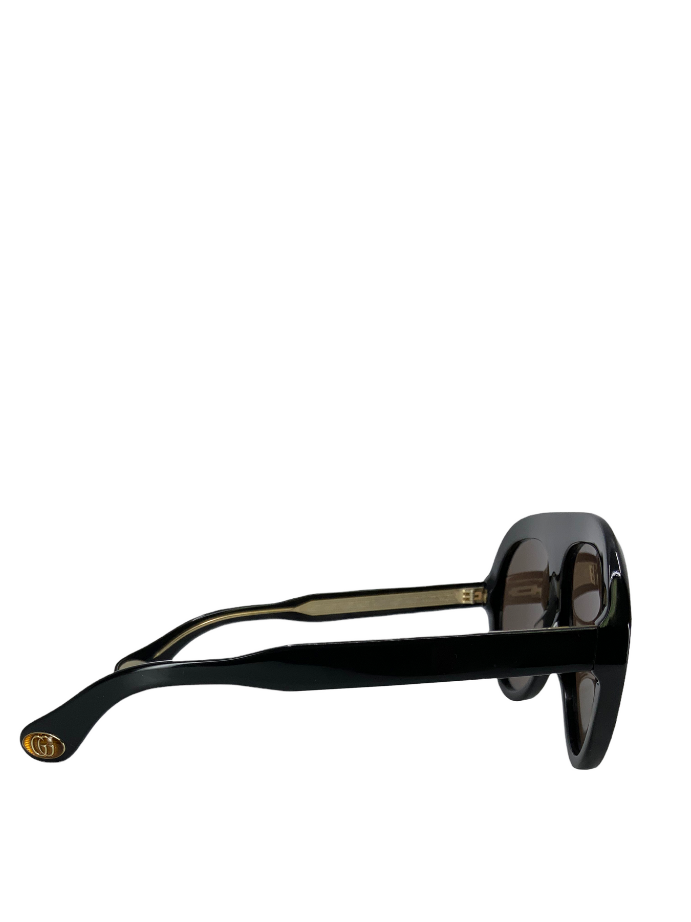 Add to your collection this d pair of GUCCI GG0479S Aviator Sunglasses featuring black acetate, a signature gold logo at center and 'GG' motifs on the tips of both arms.