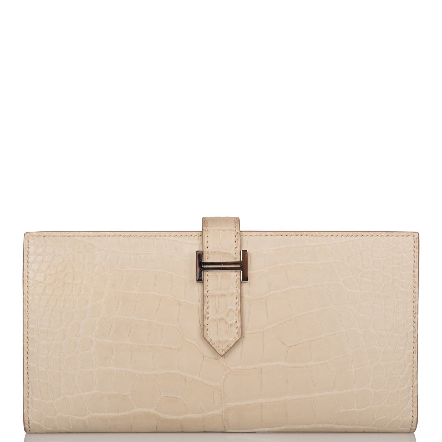 This Bifold Bearn wallet is of Beton matte alligator with palladium hardware and features a front "H" logo tab closure and tonal stitching.